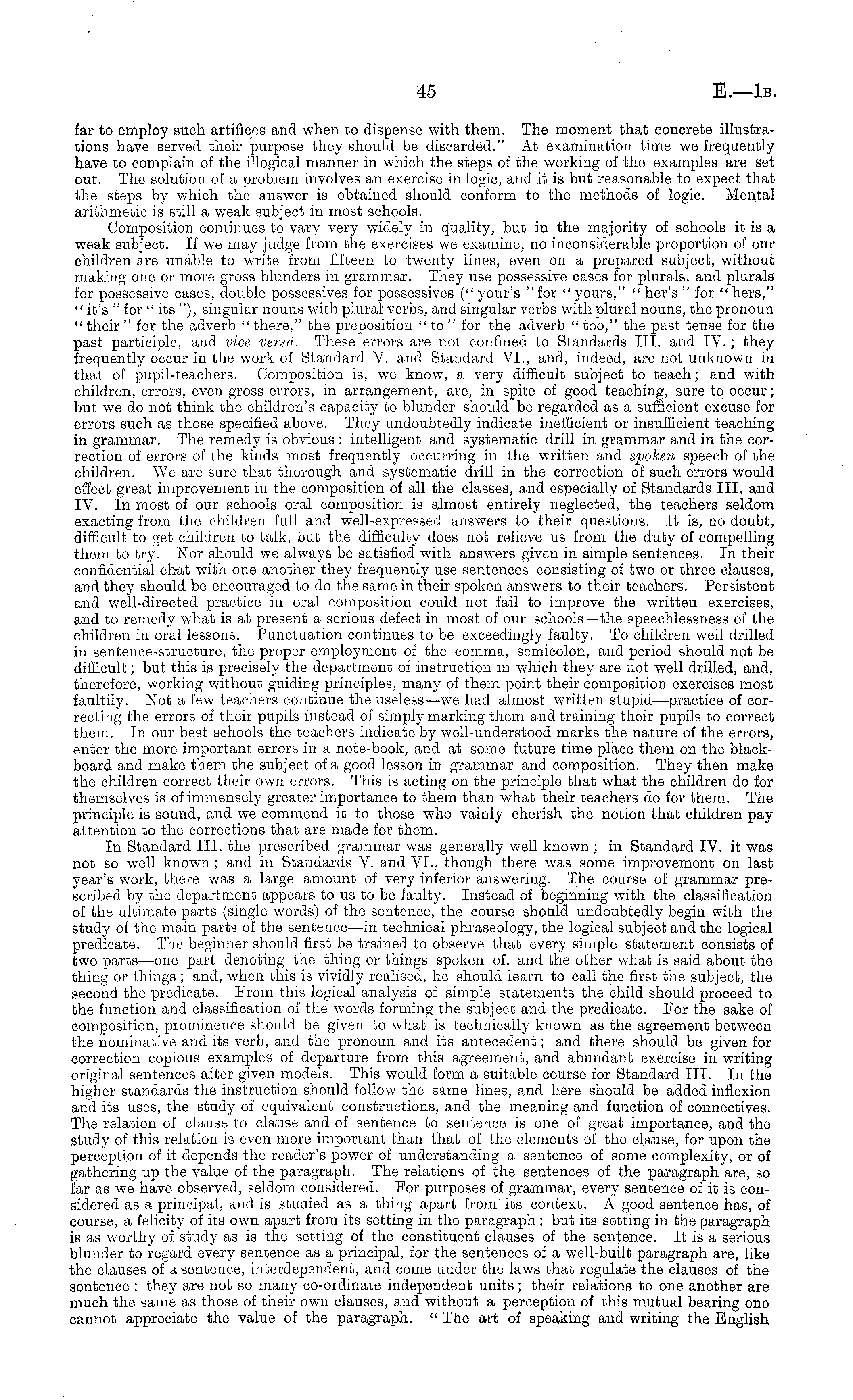 far to employ such artifices and when to dispense with them. The moment that concrete illustrations have served their purpose they should be discarded." At examination time we frequently have to complain of the illogical manner in which the steps of the working of the examples are set out. The solution of a problem involves an exercise in logic, and it is but reasonable to expect that the steps by which the answer is obtained should conform to the methods of logic. Mental arithmetic is still a weak subject in most schools. Composition continues to vary very widely in quality, but in the majority of schools it is a weak subject. If we may judge from the exercises we examine, no inconsiderable proportion of our children are unable to write from fifteen to twenty lines, even on a prepared subject, without making one or more gross blunders in grammar. They use possessive cases for plurals, and plurals for possessive cases, double possessives for possessives (" your's " for " yours," " her's " for " hers," " it's " for ■' its "), singular nouns with plural verbs, and singular verbs with plural nouns, the pronoun " their " for the adverb " there," the preposition " to " for the adverb " too," the past tense for the past participle, and vice versa. These errors are not confined to Standards 111. and IV. ; they frequently occur in the work of Standard Y. and Standard "VI., and, indeed, are not unknown in that of pupil-teachers. Composition is, we know, a very difficult subject to teach; and with children, errors, even gross errors, in arrangement, are, in spite of good teaching, sure to occur; but we do not think the children's capacity to blunder should be regarded as a sufficient excuse for errors such as those specified above. They undoubtedly indicate inefficient or insufficient teaching in grammar. The remedy is obvious : intelligent and systematic drill in grammar and in the correction of errors of the kinds most frequently occurring in the written and spoken speech of the children. We are sure that thorough and systematic drill in the correction of such errors would effect great improvement in the composition of all the classes, and especially of Standards 111. and IV. In most of our schools oral composition is almost entirely neglected, the teachers seldom exacting from the children full and well-expressed answers to their questions. It is, no doubt, difficult to get children to talk, but the difficulty does not relieve us from the duty of compelling them to try. Nor should we always be satisfied with answers given in simple sentences. In their confidential chat with one another they frequently use sentences consisting of two or three clauses, and they should be encouraged to do the same in their spoken answers to their teachers. Persistent and well-directed practice in oral composition could not fail to improve the written exercises, and to remedy what is at present a serious defect in most of our schools —the speechlessness of the children in oral lessons. Punctuation continues to be exceedingly faulty. To children well drilled in sentence-structure, the proper employment of the comma, semicolon, and period should not be difficult; but this is precisely the department of instruction in which they are not well drilled, and, therefore, working without guiding principles, many of them point their composition exercises most faultily. Not a few teachers continue the useless—we had almost written stupid—practice of correcting the errors of their pupils instead of simply marking them and training their pupils to correct them. In our best schools the teachers indicate by well-understood marks the nature of the errors, enter the more important errors in a note-book, and at some future time place them on the blackboard and make them the subject of a good lesson in grammar and composition. They then make the children correct their own errors. This is acting on the principle that what the children do for themselves is of immensely greater importance to them than what their teachers do for them. The principle is sound, and we commend it to those who vainly cherish the notion that children pay attention to the corrections that are made for them. In Standard 111. the prescribed grammar was generally well known ; in Standard IV. it was not so well known ; and in Standards V. and VI., though there was some improvement on last year's work, there was a large amount of very inferior answering. The course of grammar prescribed by the department appears to us to be faulty. Instead of beginning with the classification of the ultimate parts (single words) of the sentence, the course should undoubtedly begin with the study of the main parts of the sentence —in technical phraseology, the logical subject and the logical predicate. The beginner should first be trained to observe that every simple statement consists of two parts—one part denoting the thing or things spoken of, and the other what is said about the thing or things ; and, when this is vividly realised, he should learn to call the first the subject, the second the predicate. From this logical analysis of simple statements the child should proceed to the function and classification of the words forming the subject and the predicate. For the sake of composition, prominence should be given to what is technically known as the agreement between the nominative and its verb, and the pronoun and its antecedent; and there should be given for correction copious examples of departure from this agreement, and abundant exercise in writing original sentences after given models. This would form a suitable course for Standard 111. In the higher standards the instruction should follow the same lines, and here should be added inflexion and its uses, the study of equivalent constructions, and the meaning and function of connectives. The relation of clause to clause and of sentence to sentence is one of great importance, and the study of this relation is even