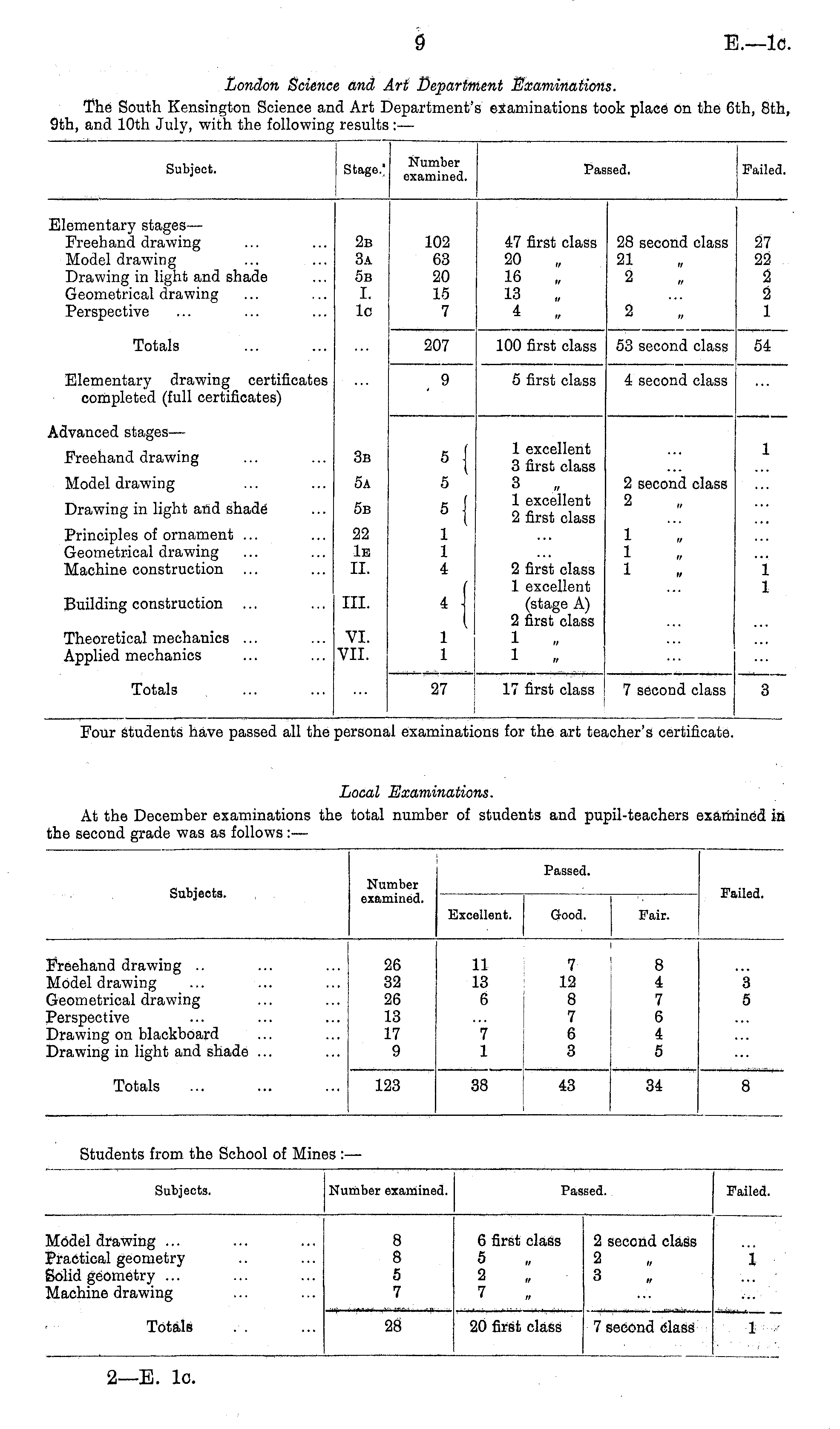 Passed. Subjects. Number examined. Failed. Excellent. Good. Fair. freehand drawing .. vlodel drawing Jeometrical drawing 'erspective Drawing on blackboard Drawing in light and shade ... 26 32 26 13 17 9 11 13 6 7 1 i 7 12 8 7 6 3 8 4 7 6 4 5 3 5 Totals 123 38 43 34 8