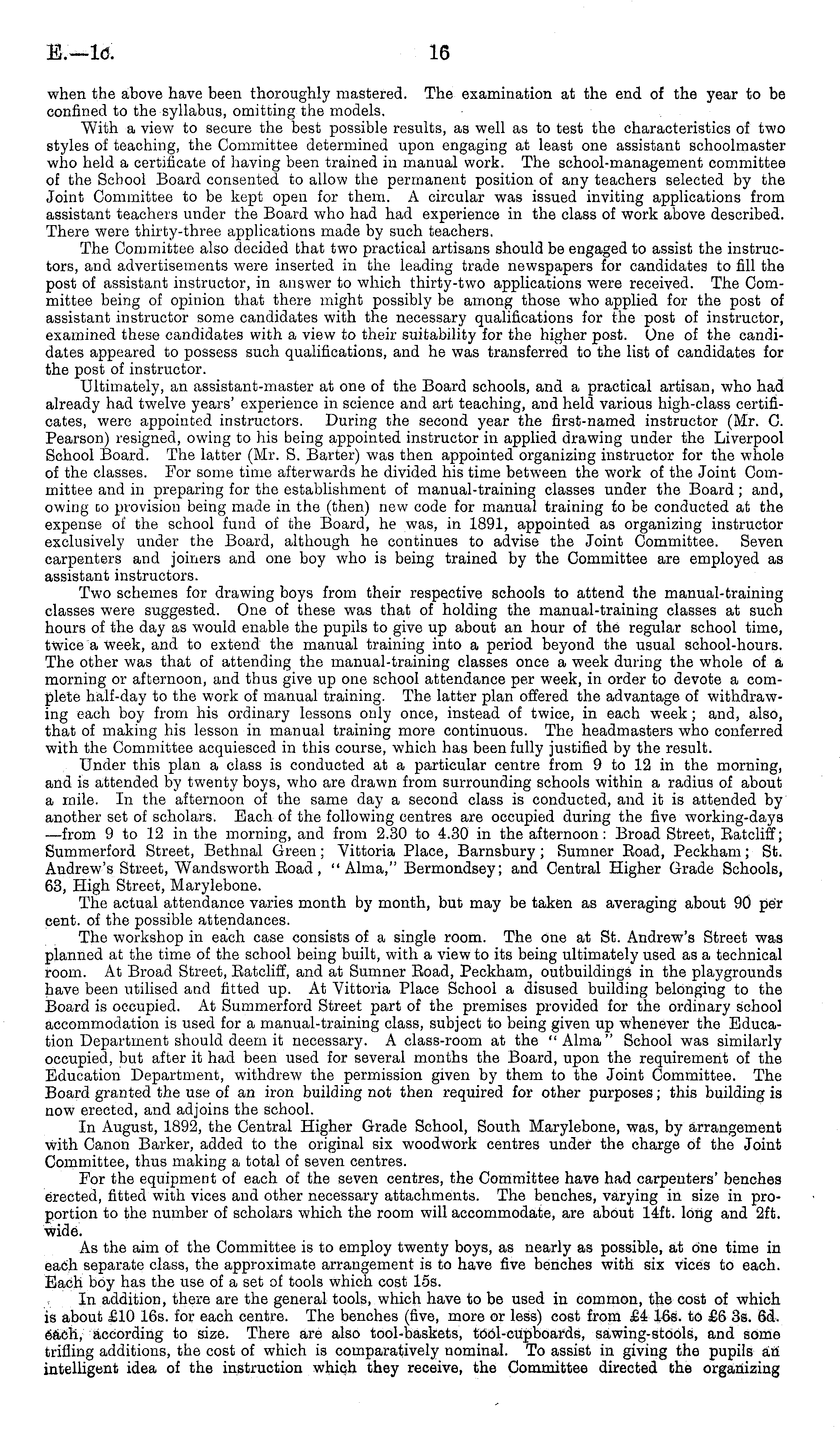 when the above have been thoroughly mastered. The examination at the end of the year to be confined to the syllabus, omitting the models. "With a view to secure the best possible results, as well as to test the characteristics of two styles of teaching, the Committee determined upon engaging at least one assistant schoolmaster who held a certificate of having been trained in manual work. The school-management committee of the School Board consented to allow the permanent position of any teachers selected by the Joint Committee to be kept open for them. A circular was issued inviting applications from assistant teachers under the Board who had had experience in the class of work above described. There were thirty-three applications made by such teachers. The Committee also decided that two practical artisans should be engaged to assist the instructors, and advertisements were inserted in the leading trade newspapers for candidates to fill the post of assistant instructor, in answer to which thirty-two applications were received. The Committee being of opinion that there might possibly be among those who applied for the post of assistant instructor some candidates with the necessary qualifications for the post of instructor, examined these candidates with a view to their suitability for the higher post. One of the candidates appeared to possess such qualifications, and he was transferred to the list of candidates for the post of instructor. Ultimately, an assistant-master at one of the Board schools, and a practical artisan, who had already had twelve years' experience in science and art teaching, and held various high-class certificates, were appointed instructors. During the second year the first-named instructor (Mr. C. Pearson) resigned, owing to his being appointed instructor in applied drawing under the Liverpool School Board. The latter (Mr. S. Barter) was then appointed organizing instructor for the whole of the classes. For some time afterwards he divided his time between the work of the Joint Committee and in preparing for the establishment of manual-training classes under the Board; and, owing co provision being made in the (then) new code for manual training to be conducted at the expense of the school fund of the Board, he was, in 1891, appointed as organizing instructor exclusively under the Board, although he continues to advise the Joint Committee. Seven carpenters and joiners and one boy who is being trained by the Committee are employed as assistant instructors. Two schemes for drawing boys from their respective schools to attend the manual-training classes were suggested. One of these was that of holding the manual-training classes at such hours of the day as would enable the pupils to give up about an hour of the regular school time, twice a week, and to extend the manual training into a period beyond the usual school-hours. The other was that of attending the manual-training classes once a week during the whole of a morning or afternoon, and thus give up one school attendance per week, in order to devote a complete half-day to the work of manual training. The latter plan offered the advantage of withdrawing each boy from his ordinary lessons only once, instead of twice, in each week; and, also, that of making his lesson in manual training more continuous. The headmasters who conferred with the Committee acquiesced in this course, which has been fully justified by the result. Under this plan a class is conducted at a particular centre from 9 to 12 in the morning, and is attended by twenty boys, who are drawn from surrounding schools within a radius of about a mile. In the afternoon of the same day a second class is conducted, and it is attended by another set of scholars. Each of the following centres are occupied during the five working-days —from 9 to 12 in the morning, and from 2.30 to 4.30 in the afternoon: Broad Street, Batcliff; Summerford Street, Bethnal Green; "Vittoria Place, Barnsbury; Sumner Eoad, Peckham; St. Andrew's Street, Wandsworth Eoad, "Alma," Bermondsey; and Central Higher Grade Schools, 63, High Street, Marylebone. The actual attendance varies month by month, but may be taken as averaging about 90 per cent, of the possible attendances. The workshop in each case consists of a single room. The one at St. Andrew's Street was planned at the time of the school being built, with a view to its being ultimately used as a technical room. At Broad Street, Eatcliff, and at Sumner Eoad, Peckham, outbuildings in the playgrounds have been utilised and fitted up. At Vittoria Place School a disused building belonging to the Board is occupied. At Summerford Street part of the premises provided for the ordinary school accommodation is used for a manual-training class, subject to being given up whenever the Education Department should deem it necessary. A class-room at the "Alma" School was similarly occupied, but after it had been used for several months the Board, upon the requirement of the Education Department, withdrew the permission given by them to the Joint Committee. The Board granted the use of an iron building not then required for other purposes; this building is now erected, and adjoins the school. In August, 1892, the Central Higher Grade School, South Marylebone, was, by arrangement with Canon Barker, added to the original six woodwork centres under the charge of the Joint Committee, thus making a total of seven centres. For the equipment of each of the seven centres, the Committee have had carpenters' benches erected, fitted with vices and other necessary attachments. The benches, varying in size in proportion to the number of scholars which the room will accommodate, are about 14ft. long and 2ft. wide. As the aim of the Committee is to employ twenty boys, as nearly as possible, at one time in each separate class, the approximate arrangement is to have five benches with six vices to each. Each boy has the use of a set of tools which cost 15s. In addi