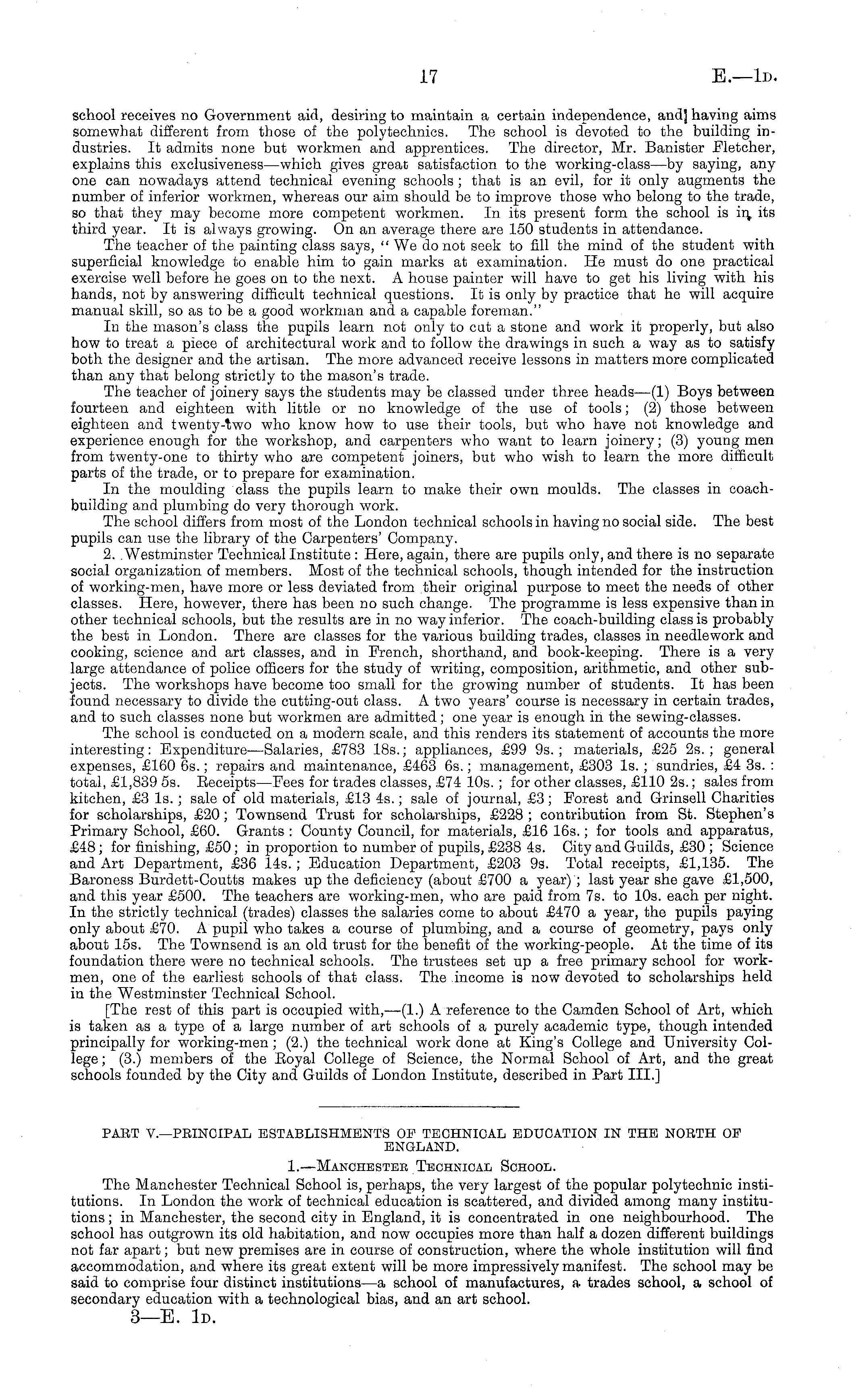 school receives no Government aid, desiring to maintain a certain independence, and] having aims somewhat different from those of the polytechnics. The school is devoted to the building industries. It admits none but workmen and apprentices. The director, Mr. Banister Fletcher, explains this exclusiveness—which gives great satisfaction to the working-class—by saying, any one can nowadays attend technical evening schools ; that is an evil, for it only augments the number of inferior workmen, whereas our aim should be to improve those who belong to the trade, so that they may become more competent workmen. In its present form the school is in, its third year. It is always growing. On an average there are 150 students in attendance. The teacher of the painting class says, " We do not seek to fill the mind of the student with superficial knowledge to enable him to gain marks at examination. He must do one practical exercise well before he goes on to the next. A house painter will have to get his living with his hands, not by answering difficult technical questions. It is only by practice that he will acquire manual skill, so as to be a good workman and a capable foreman." In the mason's class the pupils learn not only to cut a stone and work it properly, but also how to treat a piece of architectural work and to follow the drawings in such a way as to satisfy both the designer and the artisan. The more advanced receive lessons in matters more complicated than any that belong strictly to the mason's trade. The teacher of joinery says the students may be classed under three heads—(l) Boys between fourteen and eighteen with little or no knowledge of the use of tools; (2) those between eighteen and twenty-two who know how to use their tools, but who have not knowledge and experience enough for the workshop, and carpenters who want to learn joinery; (3) young men from twenty-one to thirty who are competent joiners, but who wish to learn the more difficult parts of the trade, or to prepare for examination. In the moulding class the pupils learn to make their own moulds. The classes in coachbuilding and plumbing do very thorough work. The school differs from most of the London technical schools in having no social side. The best pupils can use the library of the Carpenters' Company. 2. .Westminster Technical Institute : Here, again, there are pupils only, and there is no separate social organization of members. Most of the technical schools, though intended for the instruction of working-men, have more or less deviated from their original purpose to meet the needs of other classes. Here, however, there has been no such change. The programme is less expensive than in other technical schools, but the results are in no way inferior. The coach-building class is probably the best in London. There are classes for the various building trades, classes in needlework and cooking, science and art classes, and in French, shorthand, and book-keeping. There is a very large attendance of police officers for the study of writing, composition, arithmetic, and other subjects. The workshops have become too small for the growing number of students. It has been found necessary to divide the cutting-out class. A two years' course is necessary in certain trades, and to such classes none but workmen are admitted; one year is enough in the sewing-classes. The school is conducted on a modern scale, and this renders its statement of accounts the more interesting: Expenditure—Salaries, £783 18s.; appliances, £99 9s. ; materials, £25 2s. ; general expenses, £160 65.; repairs and maintenance, £463 65.; management, £303 Is. ; sundries, £4 3s. : total, £1,839 ss. Beceipts—Fees for trades classes, £74 10s. ; for other classes, £110 25.; sales from kitchen, £3 Is. ; sale of old materials, £13 45.; sale of journal, £3; Forest and Grinsell Charities for scholarships, £20; Townsend Trust for scholarships, £228 ; contribution from St. Stephen's Primary School, £60. Grants : County Council, for materials, £16 165.; for tools and apparatus, £48; for finishing, £50; in proportion to number of pupils, £238 4s. City and Guilds, £30 ; Science and Art Department, £36 145.; Education Department, £203 9s. Total receipts, £1,135. The Baroness Burdett-Coutts makes up the deficiency (about £700 a year); last year she gave £1,500, and this year £500. The teachers are working-men, who are paid from 7s. to 10s. each per night. In the strictly technical (trades) classes the salaries come to about £470 a year, the pupils paying only about £70. A pupil who takes a course of plumbing, and a course of geometry, pays only about 15s. The Townsend is an old trust for the benefit of the working-people. At the time of its foundation there were no technical schools. The trustees set up a free primary school for workmen, one of the earliest schools of that class. The income is now devoted to scholarships held in the Westminster Technical School. [The rest of this part is occupied with, —(1.) A reference to the Camden School of Art, which is taken as a type of a large number of art schools of a purely academic type, though intended principally for working-men; (2.) the technical work done at King's College and University College; (3.) members of the Boyal College of Science, the Normal School of Art, and the great schools founded by the City and Guilds of London Institute, described in Part III.]