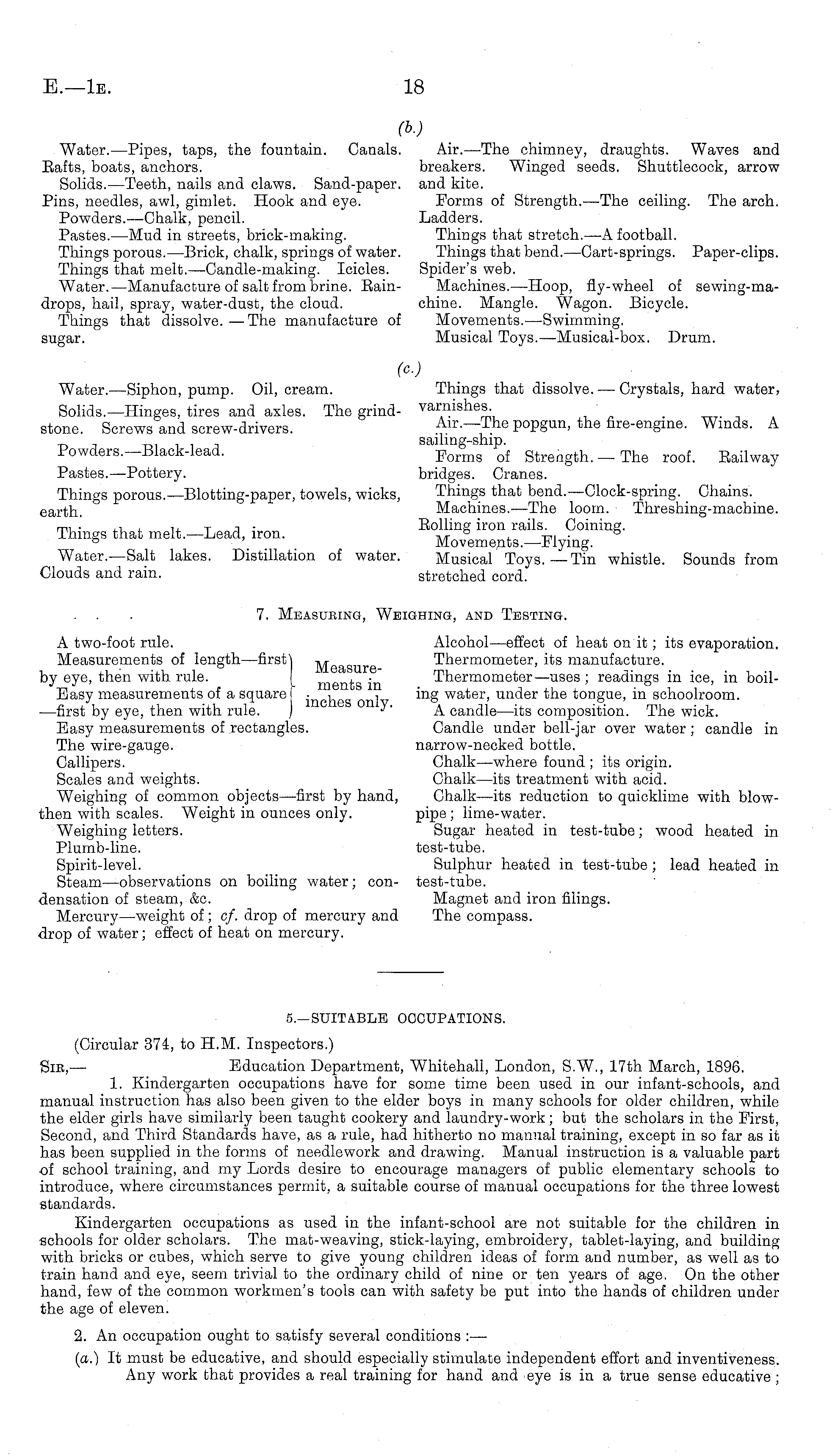 5.-SUITABLE OCCUPATIONS. (Circular 374, to H.M. Inspectors.) Sir,— Education Department, Whitehall, London, S.W., 17th March, 1896. 1. Kindergarten occupations have for some time been used in our infant-schools, and manual instruction has also been given to the elder boys in many schools for older children, while the elder girls have similarly been taught cookery and laundry-work; but the scholars in the First, Second, and Third Standards have, as a rule, had hitherto no manual training, except in so far as it has been supplied in the forms of needlework and drawing. Manual instruction is a valuable part of school training, and my Lords desire to encourage managers of public elementary schools to introduce, where circumstances permit, a suitable course of manual occupations for the three lowest standards. Kindergarten occupations as used in the infant-school are not suitable for the children in schools for older scholars. The mat-weaving, stick-laying, embroidery, tablet-laying, and building with bricks or cubes, which serve to give young children ideas of form and number, as well as to train hand and eye, seem trivial to the ordinary child of nine or ten years of age. On the other hand, few of the common workmen's tools can with safety be put into the hands of children under the age of eleven. 2. An occupation ought to satisfy several conditions : — (a.) It must be educative, and should especially stimulate independent effort and inventiveness. Any work that provides a real training for hand and eye is in a true sense educative ;