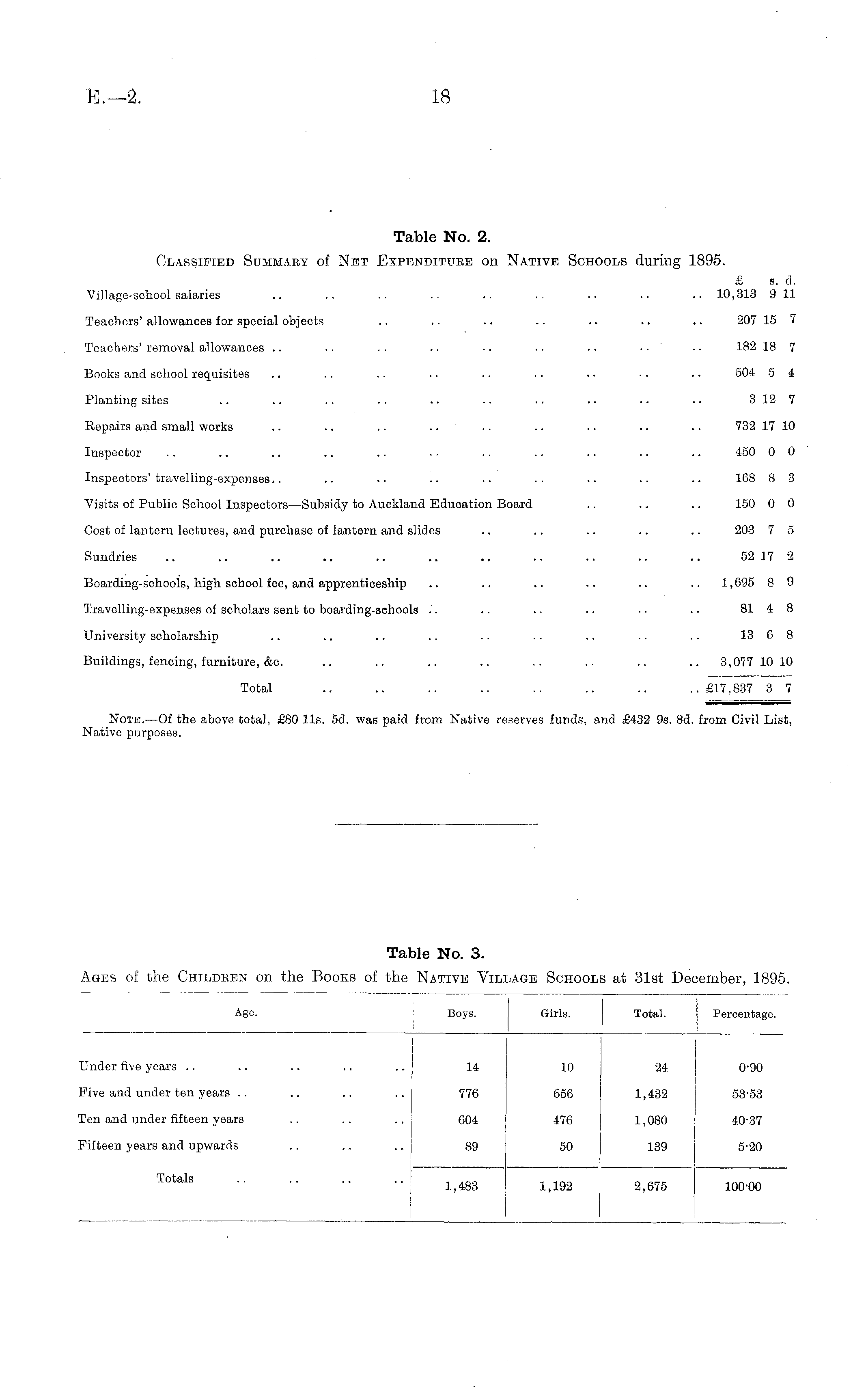 Table No. 2. Classified Summary of Net Expenditure on Native Schools during 1895. £ s. a. Village-school salaries .. .. .. .. .. .. .. .. .. 10,313 911 Teachers' allowances for special objects .. .. .. .. .. .. .. 207 15 7 Teachers' removal allowances .. .. .. .. .. • • .. . • . • 182 18 7 Books and school requisites .. .. .. .. .. • • .. .. .. 504 5 4 Planting sites .. .. .. .. .. .. .. -. .. .. 312 7 Repairs and small works .. .. .. ■ • .. ■ • •. .. ■. 732 17 10 Inspector .. .. .. .. .. .. .. .. .. .. .. 450 0 0 Inspectors'travelling-expenses.. .. .. .. .. .. .. .. .. 168 8 3 Visits of Public School Inspectors—Subsidy to Auckland Education Board .. .. .. 150 0 0 Cost of lantern lectures, and purchase of lantern and slides .. .. .. .. .. 203 7 5 Sundries .. .. .. .. .. .. .. .. .. .. .. 52 17 2 Boarding-schools, high school fee, and apprenticeship .. .. .. .. .. .. 1,695 8 9 Travelling-expenses of scholars sent to boarding-schools .. .. .. .. .. .. 81 4 8 University scholarship .. .. .. .. .. .. .. .. .. 13 6 8 Buildings, fencing, furniture, &c. .. .. .. .. .. .. .. .. 3,077 10 10 Total .. .. .. .. .. .. .. .. £17,837 3 7 Note.—Of the above total, £80 11b. sd. was paid from Native reserves funds, and £432 9s. Bd. from Civil List, Native purposes.