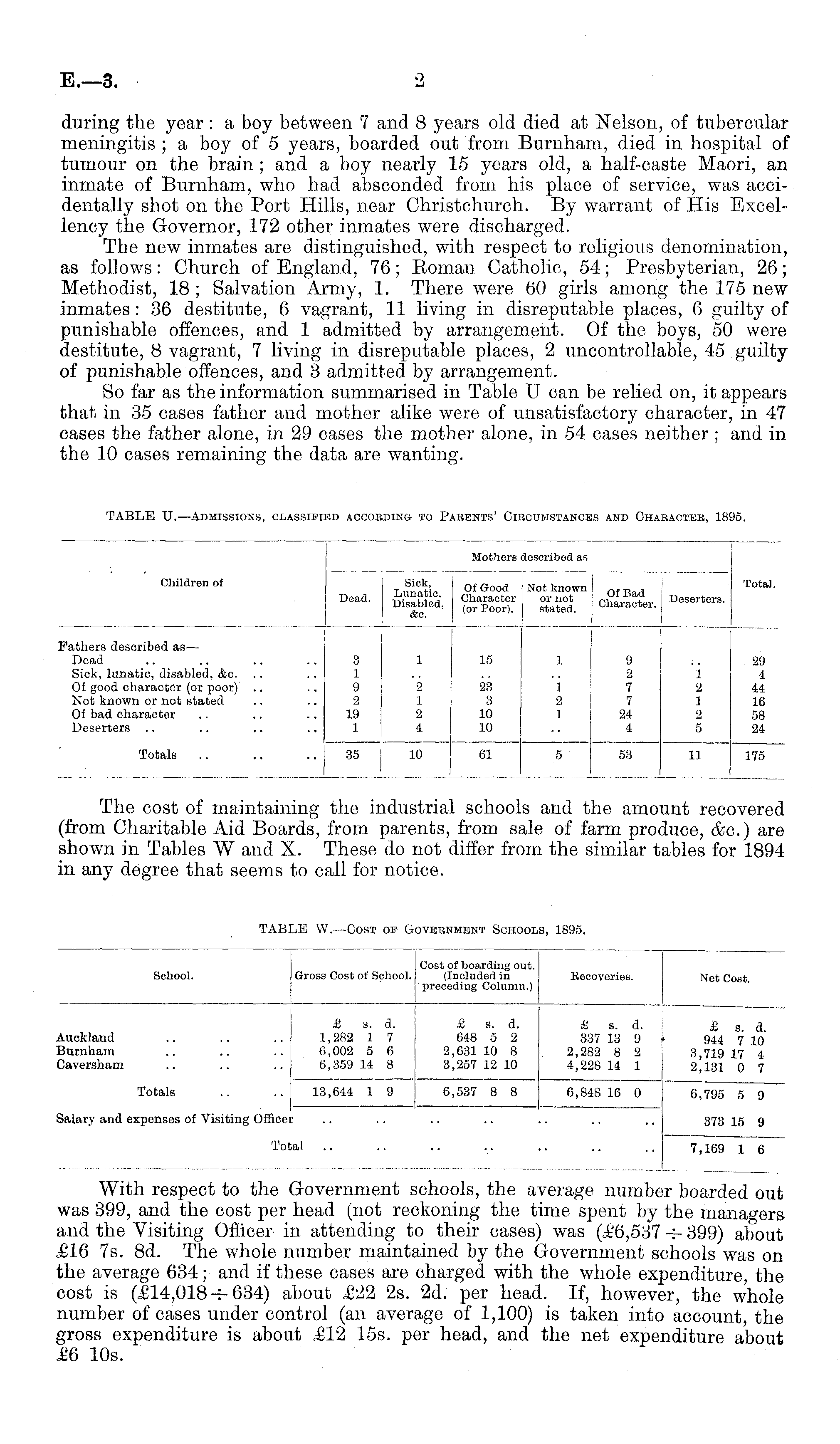 The cost of maintaining the industrial schools and the amount recovered (from Charitable Aid Boards, from parents, from sale of farm produce, &c.) are shown in Tables W and X. These do not differ from the similar tables for 1894 in any degree that seems to call for notice.