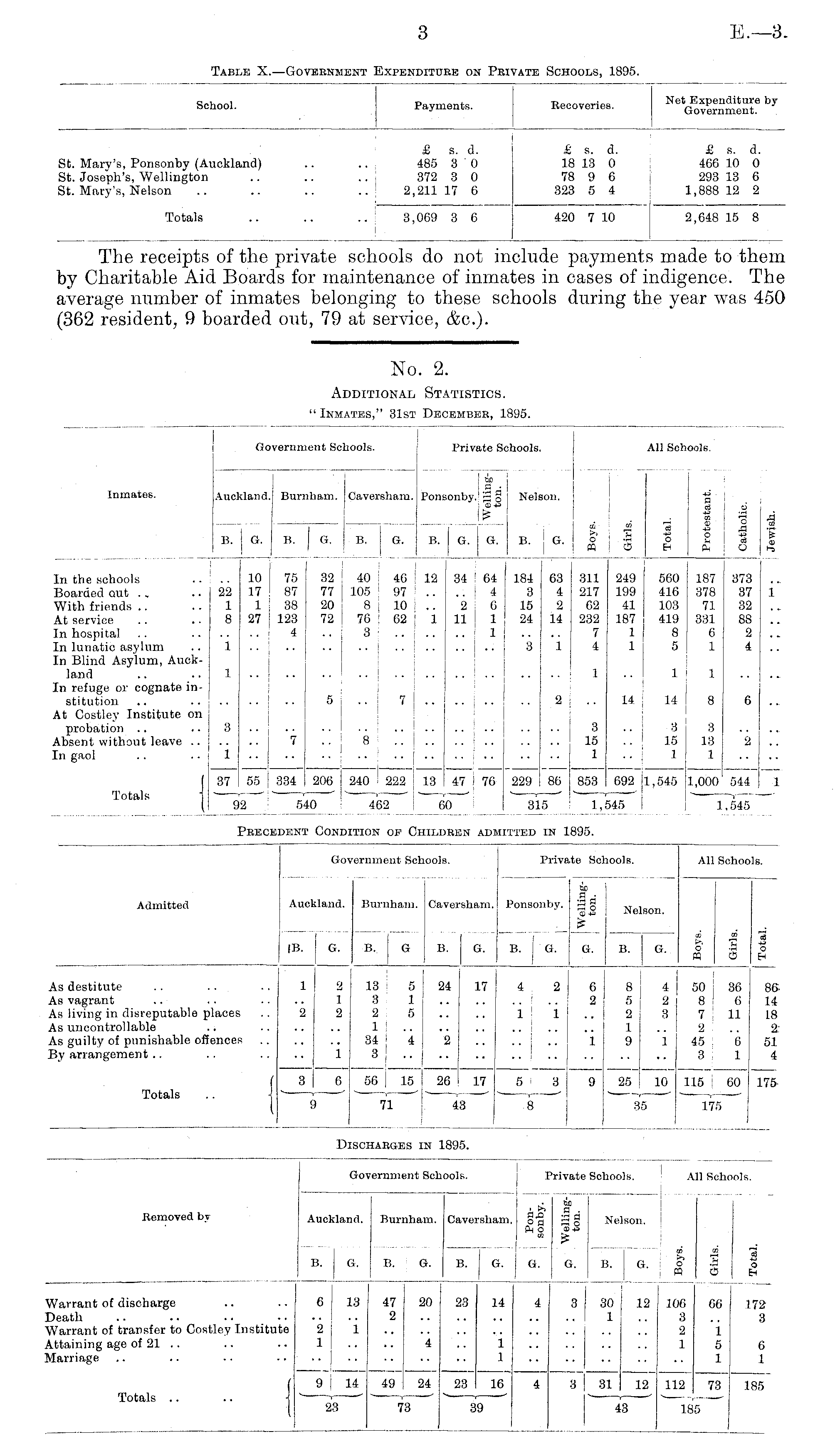 'able OVERNMENT Ixi'ENDITURE ON 'RIVATE lOHOOLS, II School. Payments. Recoveries. Net Expenditure by Government. I £ s. d. St. Mary's, Ponsonby (Auckland) .. ... 485 3 0 St. Joseph's, Wellington .. .. .. j 372 3 0 St. Mary's, Nelson .. .. .. .. 2,21117 6 £ s. d. 18 13 0 78 9 6 323 5 4 £ s. d. 466 10 0 293 13 6 1,888 12 2 _ ! Totals .. .. .. j 3,069 8 6 420 7 1.0 2,648 15 8 , The receipts of the private schools do not incluc by Charitable Aid Boards for maintenance of inmates i average number of inmates belonging to these schoo] (362 resident, 9 boarded out, 79 at service, &c). dude payments made to them ies in cases of indigence. The lools during the year was 450 No. 2. Additional Statistics. "Inmates," 31st December, 1895. Government Schools. Private Schools. All Sch >ols. I "' I w ! a ■ Inmates. Auckland.) Burnham. Caversham. Ponsonby. 3 § Nelsi js_ B. G. B. G. B. | G. B. G. G. B, - . . - . ; In the schools .. ! .. 10 75 32 ! 40 ': 46 12 34 ■ 64 184 Boarded out .. .. 22 17 ! 87 77 105 ; 97 '- .. .. \ 4 3 With friends .. .. 1 1 38 20 8 10 .. 2 6 15 At service .. .. 8 27 123 72 76 62 1 11 1 24 In hospital .. 4 .. 3 1 In lunatic asylum .. 1 .. .. 3 In Blind Asylum, Auckland .. .. 1 • ■ • ■ In refuge or cognate institution .. 5 .. 7 I .. .. ; .. At Costley Institute on j probation .. ..13 .. .. J .. .. .'. Absent without leave .. j .. .. 7 .. ] 8 .. .. .. ' .. In gaol .. .. i 1 ■ • • | .. I .. .. I .. J 37 55 | 334 206 j 240 ! 222 13 47 I 76 229 1 92 540 462 _ 60 55 63 4 2 14 1 >n. G. 311 217 62 232 7 4 >' ; B •» ° ■ •_ ° 249 199 41 187 1 1 560 416 103 419 8 5 187 373 378 37 71 32 331 88 6 2 1 4 _ ■_ <s O o rH 6 o a _ 1 a _• '$ o r-. 1 1 1 2 14 14 8 6 I 3 3 15 1 3 15 1 3 .. 13 2 1 | 1 37 55 j ___ 86 853 1^ 692 | 1,545 1,000 544 1^545 1 5 S45 Precedent Condition of Children admitted j Prec in .895. tTTHD Go 1 •eminent Schools. Private Schools. All School ts. Admitted Auckland. Burnham. Caversham. B. G B. G. _) Ponsonby. || Nolson _jS I I B. G. G. B. G. o 3 m as IB. G. o H As destitute As vagrant As living in disreputable places As uncontrollable As guilty of punishable offences By arrangement 1 2 2 1 2 i ! I | 2 13 ; 5 ! 24 17 4 2 6 8 4 50 ! 36 1 3 1 .. ....;.. 2 5 2 8 6 2 25 .. .. ill ..2 3 711 1 : I .. .. 1 .. 2 .. 34 j 4 2 .. .. .. 1 9 1 45 6 i 3 j .. j I 3: 1 6 56 | 15 I 26 17 5 I 3 9 25 | 10 115 | 60 71 43 8 35 175 36 866 14 11 18 2; 6 51 1 4 Totals I 3 6 60 175Discharges in 1895. Government Schools. Private Schools. All Schools x>ls. rfl ■ •*> a . Removed by Auckland. Burnham. Caversham. oa 2 g rH O ?« £ B. G. B. G. B. I G. G. G. Varrant of discharge .. .. 6 13 47 20 23 14 4 3 )eath .. .. .. 2 Varrant of transfer to Costley Institute 2 1 ttaining age of 21 .. .. .. 1 .. .. 4 .. 1 larriage .. .. .. .. .. I 1 f 9 j 14 49 24 23 16 4 3 Totals .. .. \ - — i " ■ — — [ 23 73 39 Nelson. V- 0 --[r? a 30 12 106 66 1 .. 3 .. .... 2 1 .... 15 1 31 12 112 73 43 185 — 0 172 3 6 1 185