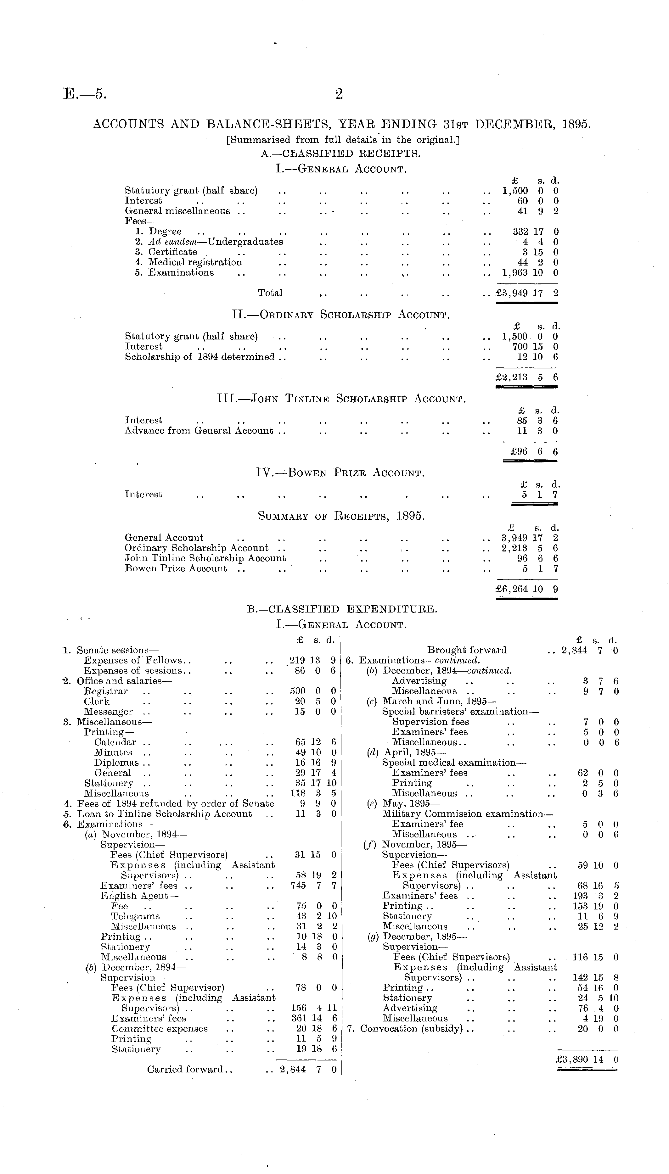 ACCOUNTS AND BALANCE-SHEETS, YEAE ENDING 31st DECEMBEE, 1895. [Summarised from full details in the original.] A.—CLASSIFIED RECEIPTS. I.—General Account. £ s. d. Statutory grant (half share) .. .. .. .. .. 1,500 0 0 Interest .. .. .. .. .. .. .. .. 60 0 0 General miscellaneous .. .. .. • .. .. .. .. 41 9 2 Pees— 1. Degree .. .. .. .. .. .. .. .. 332 17 0 2. Ad emidem —Undergraduates .. .. .. .. .. 440 3. Certificate . .. .. .. .. .. .. .. 315 0 4. Medical registration .. .. .. .. .. .. 44 2 0 5. Examinations .. .. .. .. v .. .. 1,963 10 0 Total .. .. ~ .. .. £3,949 17 2 ll.—Ordinary Scholarship Account. £ s. d. Statutory grant (half share) .. .. .. .. .. .. 1,500 0 0 Interest .. .. .. .. .. .. .. .. 700 15 0 Scholarship of 1894 determined .. .. .. .. .. .. 12 10 6 £2,213 5 6 lll.—John Tinline Scholarship Account. £ s. d. Interest .. .. .. .. .. .. .. .. 85 3 6 Advance from General Account .. .. .. .. .. .. 1130 £96 6 6 IV.—Bowen Prize Account. £ s. d. Interest .. .. .. .. .. . .. .. 517 Summary of Eeceipts, 1895. £ s. d. General Account .. .. .. .. .. .. .. 3,949 17 2 Ordinary Scholarship Account .. .. .. ~ .. .. 2,213 5 6 John Tinline Scholarship Account .. .. .. .. .. 96 6 6 Bowen Prize Account .. .. .. .. .. .. .. 517 £6,264 10 9 B.—CLASSIFIED EXPENDITURE. I.—General Account. £ s. d. I £ s. d. 1. Senate sessions— Brought forward .. 2,844 7 0 Expenses of Fellows.. .. .. 219 13 9 6. Examinations— continued. Expenses of sessions.. .. .. 86 0 6 (6) December, 1894 — continued. 2. Office and salaries— Advertising .. .. .. 3 7 6 Registrar .. .. .. 500 0 0 Miscellaneous .. .. .. 9 7 0 Clerk .. ..' .. .. 20 5 0 (c) March and June, 1895— Messenger .. .. .. .. 15 0 0 Special barristers' examination— S. Miscellaneous — Supervision fees .. .. 7 0 0 Printing— Examiners' fees .. .. 5 0 0 Calendar .. .. ... .. 65 12 6 Miscellaneous.. .. .. 006 Minutes .. .. .. .. 49 10 0 (d) April, 1895— Diplomas .. .. .. .. 16 10 9 Special medical examination — General .. .. .. .. 29 17 4 Examiners' fees .. .. 62 0 0 Stationery .. .. .. .. 35 17 10 Printing .. .. .. 2 5 0 Miscellaneous .. .. .. 118 3 5 Miscellaneous .. .. .. 0 3 6 4. Fees of 1894 refunded by order of Senate 9 9 0 («) May, 1895— 5. Loan to Tinline Scholarship Account .. 11 3 0 Military Commission examination— 6. Examinations — Examiners' fee .. .. 5 0 0 (a) November, 1894— Miscellaneous ..- .. .. 0 0 6 Supervision— (/) November, 1895— Fees (Chief Supervisors) .. 31 15 0 Supervision— Expenses (including Assistant Fees (Chief Supervisors) .. 59 10 0 Supervisors) .. .. .. 58 19 2 Expenses (including Assistant Examiners' fees .. .. .. 745 7 7 Supervisors) .. .. .. 68 16 5 English Agent — Examiners'fees .. .. .. 193 3 2 Fee .. .. .. .. 75 0 0 Printing .. .. .. 153 19 0 Telegrams .. .. .. 43 210 Stationery .. .. .. 116 9 Miscellaneous .. .. .. 31 2 2 Miscellaneous .. .. .. 25 12 2 Printing .. .. .. .. 10 18 0 (/;) December, 1895— Stationery .. .. .. 14 3 0 Supervision— Miscellaneous .. .. .. 8 8 0 Fees (Chief Supervisors) .. 110 15 0 (6) December, 1894 — Expenses (including Assistant Supervision— Supervisors) .. .. .. 142 15 8 Fees (Chief Supervisor) .. 78 0 0 Printing.. .. .. .. 54 16 0 Expenses (including Assistant Stationery .. .. .. 24 5 10 Supervisors) .. .. .. 156 411 Advertising .. .. .. 76 4 0 Examiners' fees .. .. 361 14 6 Miscellaneous .. .. .. 4 19 0 Committee expenses .. .. 20 18 6 7. Convocation (subsidy) .. .. .. 20 0 0 Printing .. .. .. 11 5 9 Stationery .. .. .. 19 18 6 £3,890 14 0 Carried forward.. .. 2,844 7 0 =^=^=^