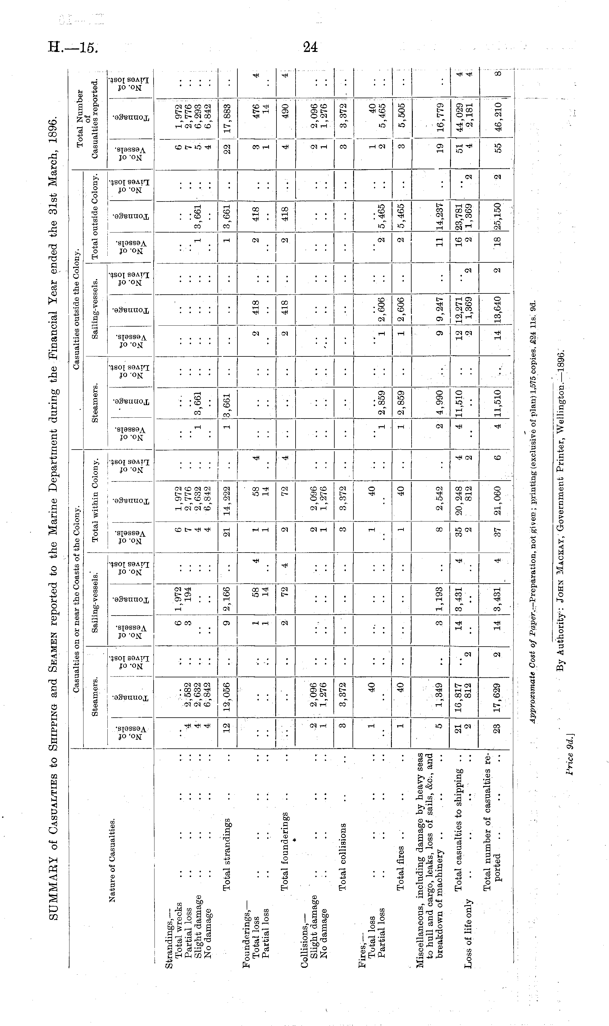 SUMMARY of Casualties to Shipping and Seamen reported to the Marine Department during the Financial Year ended the 31st March, 1896.