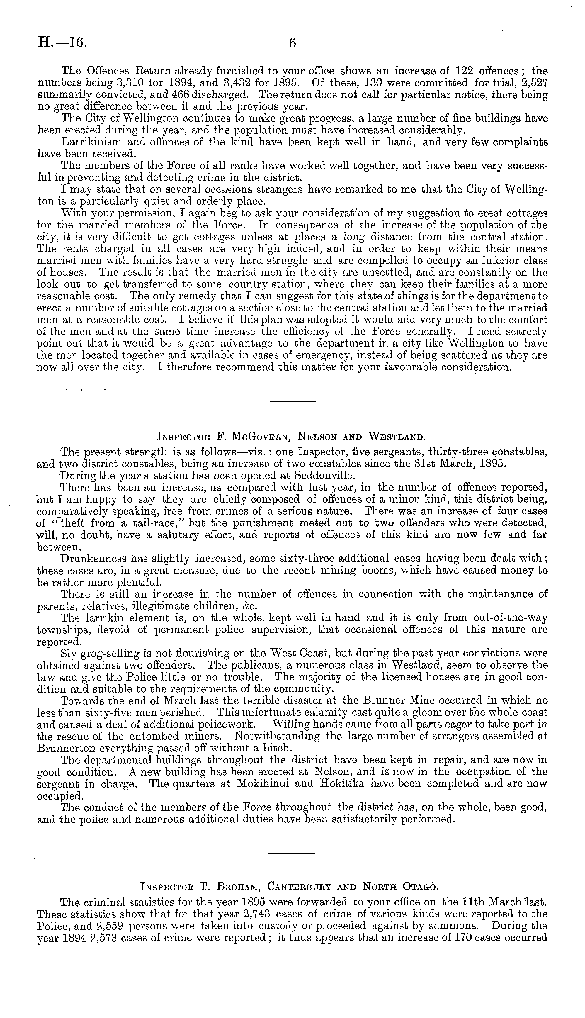 Inspector F. McGovern, Nelson and Westland. The present strength is as follows—viz.: one Inspector, five sergeants, thirty-three constables, and two district constables, being an increase of two constables since the 31st March, 1895. During the year a station has been opened at Seddonville. There has been an increase, as compared with last year, in the number of offences reported, but I am happy to say they are chiefly composed of offences of a minor kind, this district being, comparatively speaking, free from crimes of a serious nature. There was an increase of four cases of " theft from a tail-race," but the punishment meted out to two offenders who were detected, will, no doubt, have a salutary effect, and reports of offences of this kind are now few and far between. Drunkenness has slightly increased, some sixty-three additional cases having been dealt with; these cases are, in a great measure, due to the recent mining booms, which have caused money to be rather more plentiful. There is still an increase in the number of offences in connection with the maintenance of parents, relatives, illegitimate children, Sec The larrikin element is, on the whole, kept well in hand and it is only from out-of-the-way townships, devoid of permanent police supervision, that occasional offences of this nature are reported. Sly grog-selling is not flourishing on the West Coast, but during the past year convictions were obtained against two offenders. The publicans, a numerous class in Westland, seem to observe the law and give the Police little or no trouble. The majority of the licensed houses are in good condition and suitable to the requirements of the community. Towards the end of March last the terrible disaster at the Brunner Mine occurred in which no less than sixty-five men perished. This unfortunate calamity cast quite a gloom over the whole coast and caused a deal of additional policework. Willing hands came from all parts eager to take part in the rescue of the entombed miners. Notwithstanding the large number of strangers assembled at Brunnerton everything passed off without a hitch. The departmental buildings throughout the district have been kept in repair, and are now in good condition. A new building has been erected at Nelson, and is now in the occupation of the sergeant in charge. The quarters at Mokihinui and Hokitika have been completed and are now occupied. The conduct of the members of the Force throughout the district has, on the whole, been good, and the police and numerous additional duties have been satisfactorily performed.
