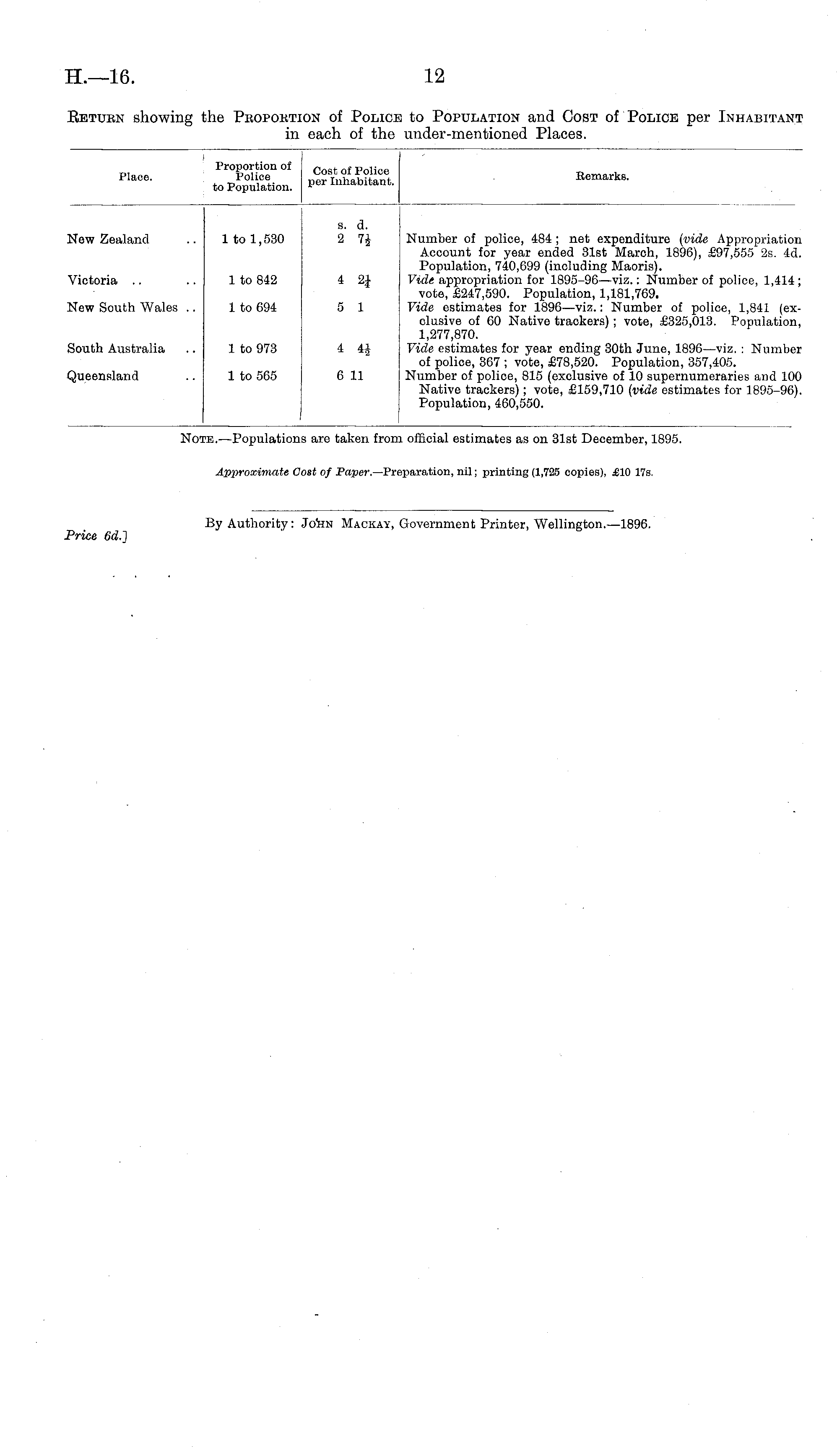 Place. Proportion of Police to Population. Cost of Police per Inhabitant. Remarks. New Zealand 1 to 1,530 s. d. 2 7J Number of police, 484 ; net expenditure (vide Appropriation Account for year ended 31st March, 1896), £97,555 2s. 4d. Population, 740,699 (including Maoris). Vide appropriation for 1895-96—viz.: Number of police, 1,414; vote, £247,590. Population, 1,181,769. Vide estimates for 1896—viz.: Number of police, 1,841 (exclusive of 60 Native trackers) ; vote, £325,013. Population, 1,277,870. Vide estimates for year ending 30th June, 1896—viz. : Number of police, 367 ; vote, £78,520. Population, 357,405. Number of police, 815 (exclusive of 10 supernumeraries and 100 Native trackers) ; vote, £159,710 (vide estimates for 1895-96). Population, 460,550. Victoria 1 to 842 4 2_ New South Wales .. 1 to 694 5 1 South Australia 1 to 973 4 if} Queensland 1 to 565 6 11