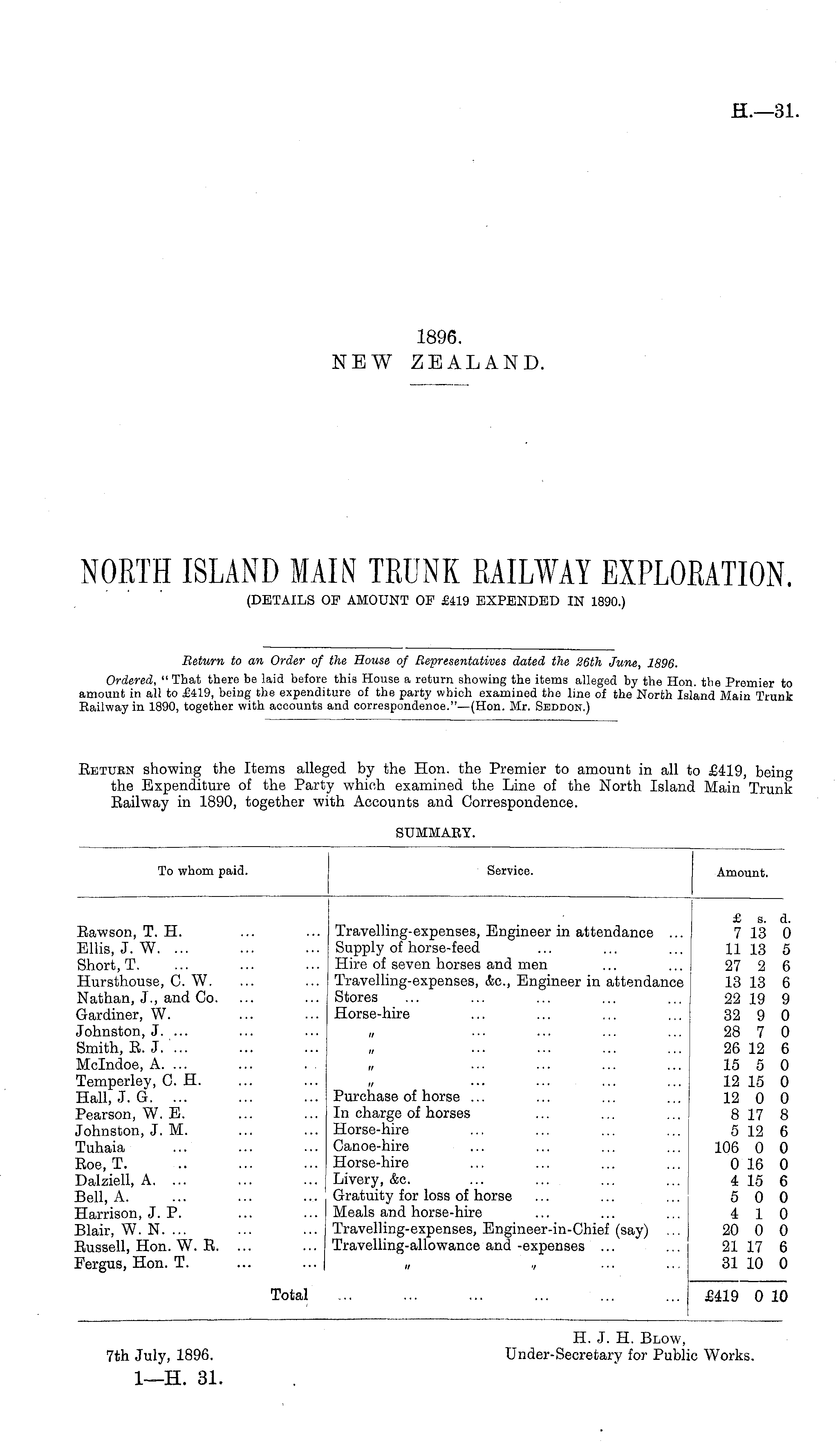 Return to an Order of the Rouse of Representatives dated the 26th June, 1896. Ordered, " That there be laid before this House a return showing the items alleged by the Hon. the Premier to amount in all to £419, being the expenditure of the party which examined the line of the North Island Main Trunk Eailwayin 1890, together with accounts and correspondence."—(Hon. Mr. Seddon.)