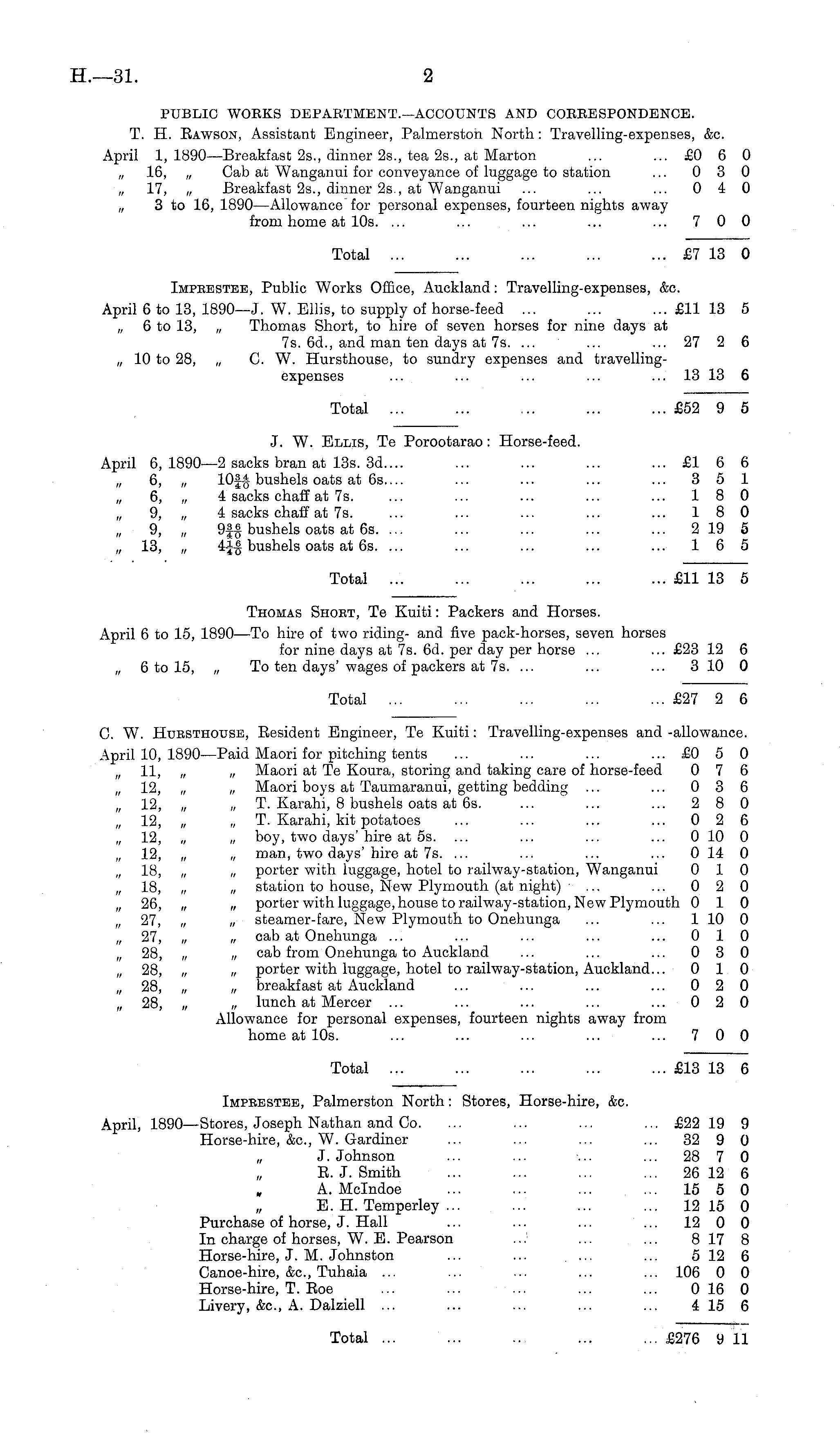 G. W. Hursthouse, Besident Engineer, Te Kuiti: Travelling-expenses and -allowance. April 10, 1890—Paid Maori for pitching tents ... ... ... ...£0 5 0 „ 11, „ „ Maori at Te Koura, storing and taking care of horse-feed 0 7 6 n 12, „ „ Maori boys at Taumaranui, getting bedding ... ... 0 3 6 „ 12, „ „ T. Karahi, 8 bushels oats at 6s. ... ... ... 2 8 0 „ 12, „ „ T. Karahi, kit potatoes ... ... ... ... 026 „ 12, „ „ boy, two days'hire at ss. ... ... ... ... 010 0 „ 12, „ „ man, two days'hire at 7s. ... ... ... ... 014 0 „ 18, „ „ porter with luggage, hotel to railway-station, Wanganui 0 10 „ 18, „ „ station to house, New Plymouth (at night) ... ... 0 2 0 v 26, „ „ porter with luggage, house to railway-station, New Plymouth 0 10 „ 27, i, „ steamer-fare, New Plymouth to Onehunga ... ... 110 0 „ 27, „ „ cab at Onehunga ... ... ... ... ... 010 „ 28, „ „ cab from Onehunga to Auckland ... ... ... 030 „ 28, „ „ porter with luggage, hotel to railway-station, Auckland... 0 10 „ 28, „ „ breakfast at Auckland ... ... ... ... 020 _ 28, „ „ lunch at Mercer ... ... ... ... ... 0 2 0 Allowance for personal expenses, fourteen nights away from home at 10s. ... ... ... ... ... 7 0 0 Total ... ... ... ... ... £13 13 6 Imprestee, Palmerston North: Stores, Horse-hire, &c. April, 1890—Stores, Joseph Nathan and Co. ... ... ... ... £22 19 9 Horse-hire, &c, W. Gardiner ... ... ... ... 32 9 0 „ J.Johnson ... ... ... ... 28 7 0 B. J. Smith ... ... ... ... 26 12 6 „ A. Mclndoe ... ... ... ... 15 5 0 E. H. Temperley ... ... ... ... 12 15 0 Purchase of horse, J. Hall ... ... ... ... 12 0 0 In charge of horses, W. E. Pearson ...' ... ... 8 17 8 Horse-hire, J. M. Johnston ... ... .... ... 5 12 6 Canoe-hire, &c, Tuhaia ... ... ... ... ... 106 0 0 Horse-hire, T. Eoe ... ... ... ... ... 0 16 0 Livery, &c, A. Dalziell ... ... ... ... ... 4 15 6 Total £276 9 11