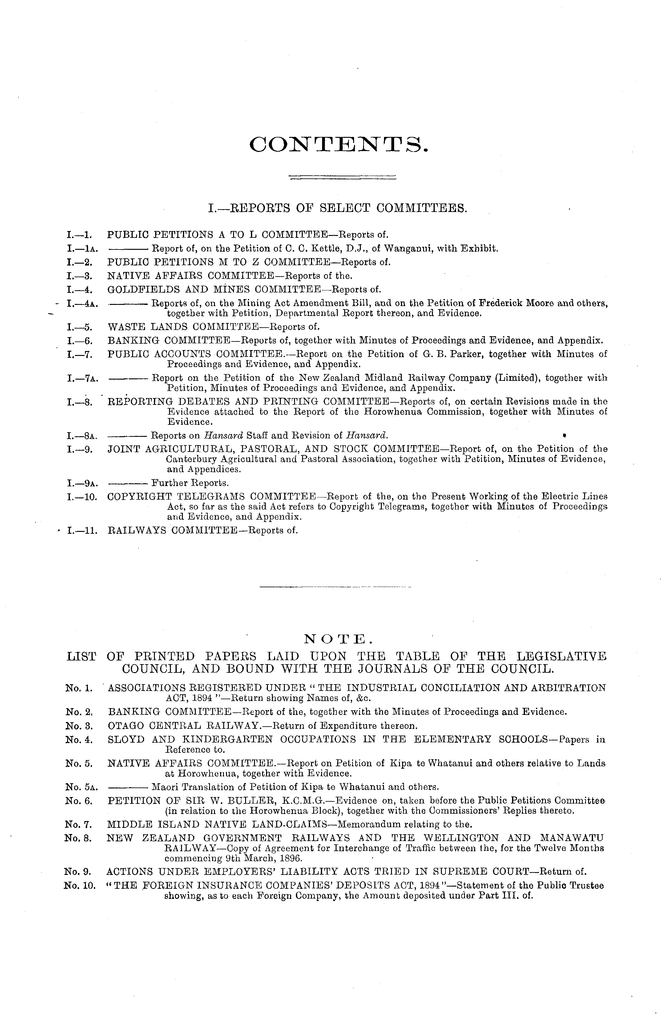 I.— EEPOETS OF SELECT COMMITTEES. I.—l. PUBLIC PETITIONS A TO L COMMITTEE—Reports of. I. —lα. Report of, on the Petition of C. C. Kettle, D.J., of Wanganui, with Exhibit. 1.—2. PUBLIC PETITIONS M TO Z COMMITTEE—Reports of. 1.—3. NATIVE AFFAIRS COMMITTEE—Reports of the. 1.—4. GOLDFIELDS AND MINES COMMITTEE—Reports of. I. —4a. Reports of, on the Mining Act Amendment Bill, and on the Petition of Frederick Moore and others, together with Petition, Departmental Report thereon, and Evidence. 1._5. WASTE LANDS COMMITTEE—Reports of. I, —6. BANKING COMMITTEE —Reports of, together with Minutes of Proceedings and Evidence, and Appendix. 1.—7. PUBLIC ACCOUNTS COMMITTEE.—Report on the Petition of G. B. Parker, together with Minutes of Proceedings and Evidence, and Appendix. I.—7a. Report on the Petition of the New Zealand Midland Railway Company (Limited), together with Petition, Minutes of Proceedings and Evidence, and Appendix. I.—B. REPORTING DEBATES AND PRINTING COMMITTEE—Reports of, on certain Revisions made in the Evidence attached to the Report of the Horowhenua Commission, together with Minutes of Evidence. I. —Ba. Reports on Hansard Staff and Revision of Hansard. • 1.—9. JOINT AGRICULTURAL, PASTORAL, AND STOCK COMMITTEE—Report of, on the Petition of the Canterbury Agricultural and Pastoral Association, together with Petition, Minutes of Evidence, and Appendices. I.—9a. Further Reports. I.—lo. COPYRIGHT TELEGRAMS COMMITTEE—Report of the, on the Present Working of the Electric Lines Act, so far as the said Act refers to Copyright Telegrams, together with Minutes of Proceedings and Evidence, and Appendix. I.—ll. RAILWAYS COMMITTEE—Reports of.