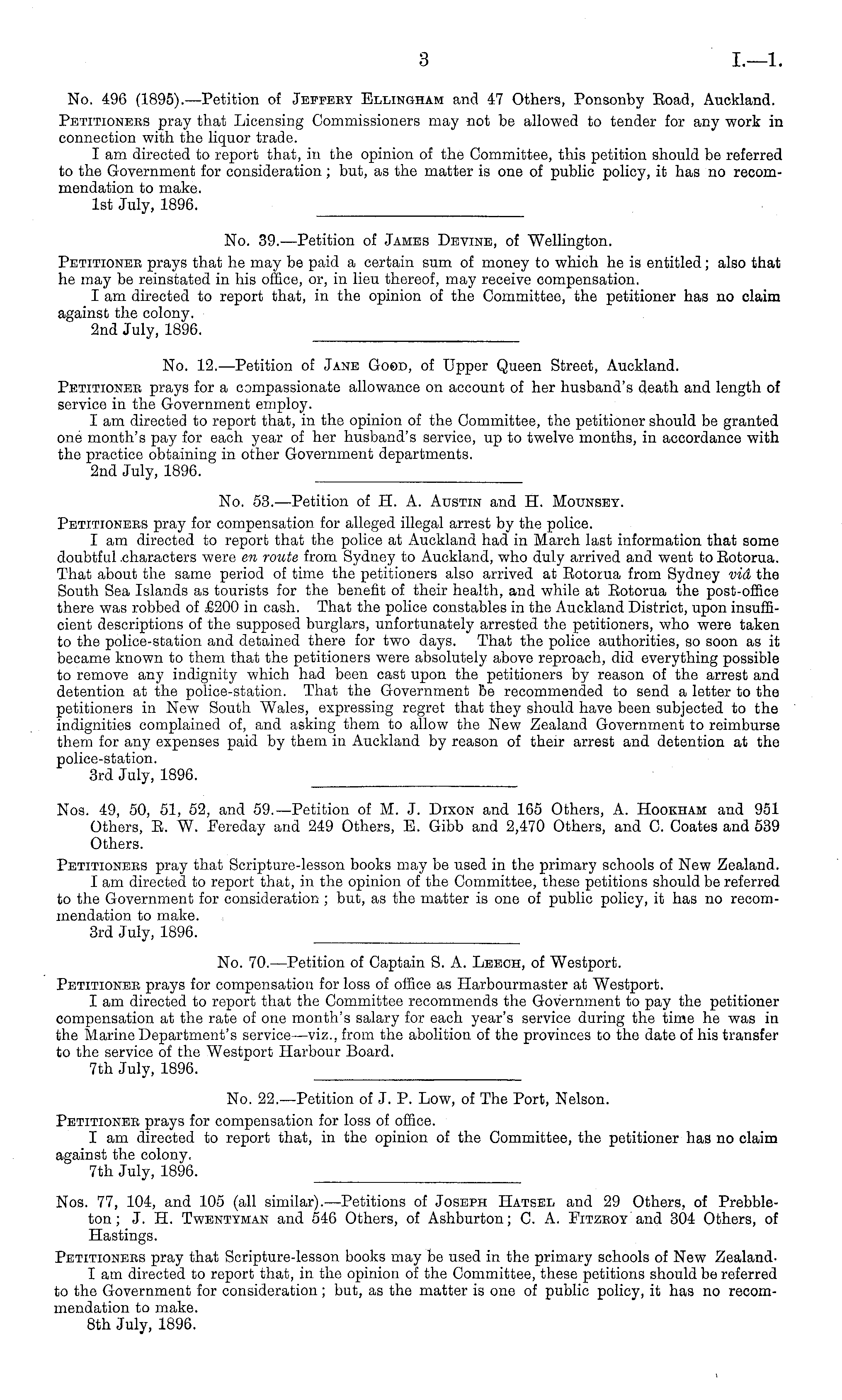 Nos. 77, 104, and 105 (all similar). —Petitions of Joseph Hatsbl and 29 Others, of Prebbleton ; J. H. Twentyman and 546 Others, of Ashburton; C. A. Fitzboy and 304 Others, of Hastings. Petitioners pray that Scripture-lesson books may be used in the primary schools of New ZealandI am directed to report that, in the opinion of the Committee, these petitions should be referred to the Government for consideration; but, as the matter is one of public policy, it has no recommendation to make. Bth July, 1896.
