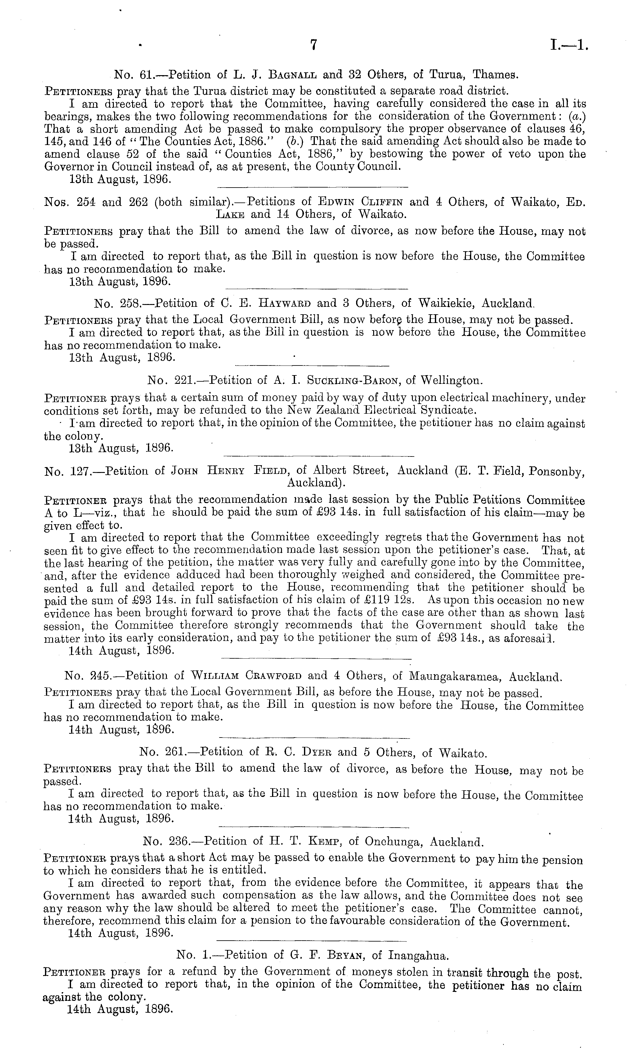 No. I.—Petition of G. F. Bkyan, of Inangahua. Petitioner prays for a refund by the Government of moneys stolen in transit through the post. I am directed to report that, in the opinion of the Committee, the petitioner has no claim against the colony. 14th August, 1896.