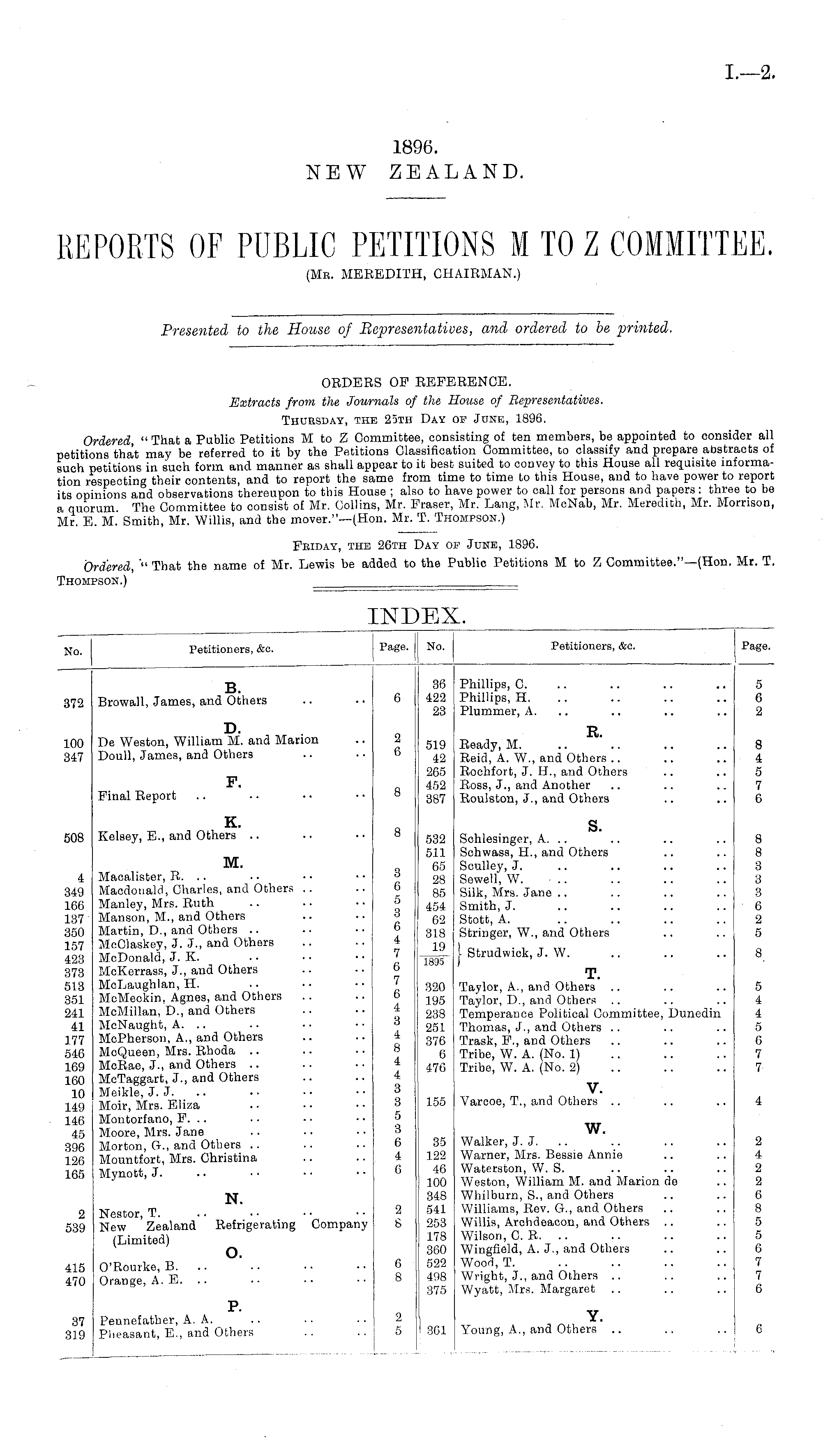 ORDERS OF REFERENCE. Extracts from the Journals of the House of Representatives. Thubsday, the 25th Day op June, 1896. Ordered, " That a Public Petitions M to Z Committee, consisting of ten members, be appointed to consider all petitions that may be referred to it by the Petitions Classification Committee, to classify and prepare abstracts of such petitions in such form and manner as shall appear to it best suited to convey to this House all requisite information respecting their contents, and to report the same from time to time to this House, and to have power to report its opinions and observations thereupon to this House ; also to have power to call for persons and papers: three to be a quorum. The Committee to consist of Mr. Collins, Mr. Fraser, Mr. Lang, Mr. McNab, Mr. Meredith, Mr. Morrison, Mr. E. M. Smith, Mr. Willis, and the mover."—(Hon. Mr. T. Thompson.)