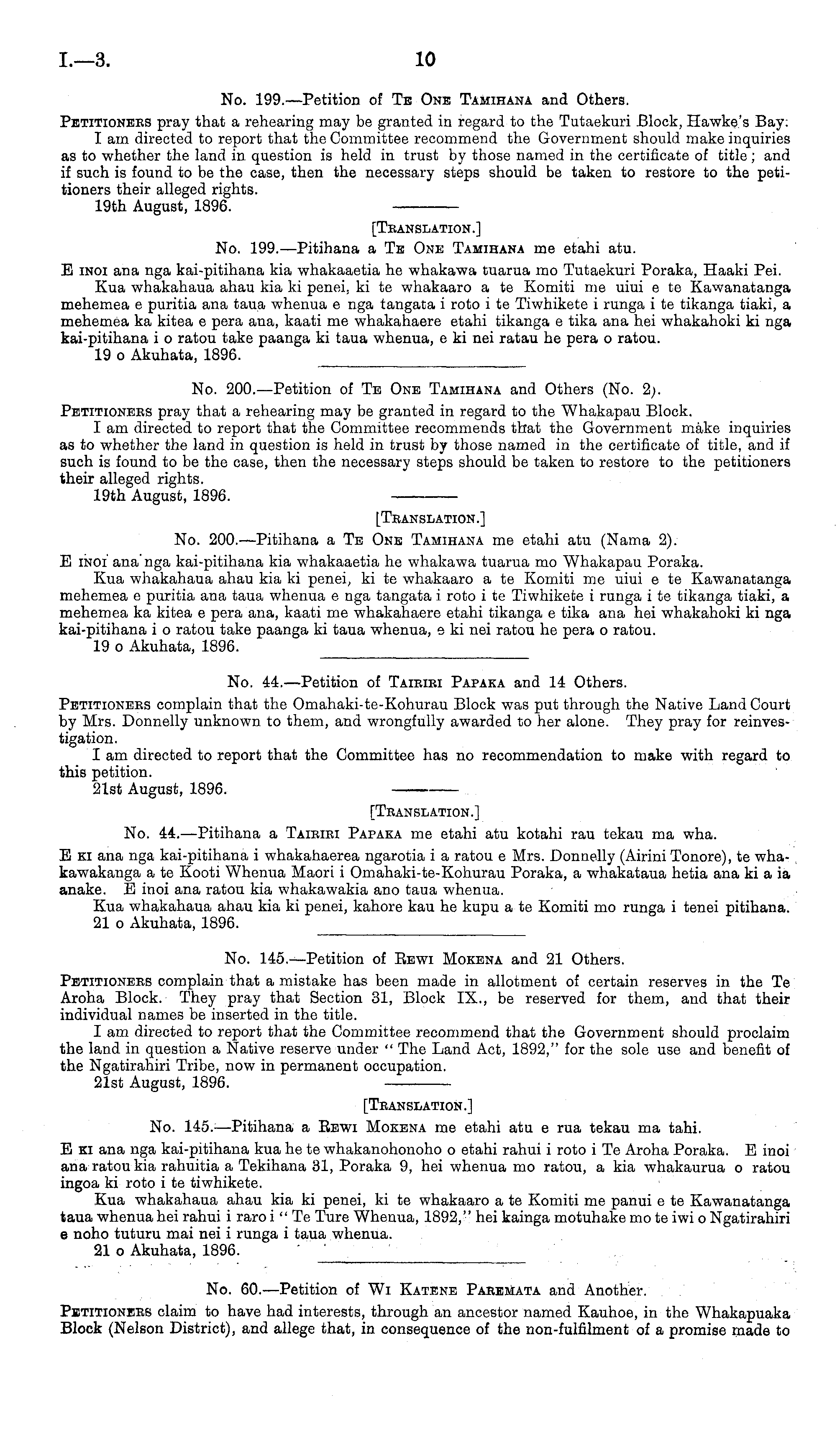 [Translation.] No. 199.—Pitihana a Te One Tamihana me etahi atu. E inoi ana nga kai-pitihana kia whakaaetia he whakawa tuarua mo Tutaekuri Poraka, Haaki Pei. Kua whakahaua ahau kia ki penei, kite whakaaro a te Komiti me uiui c te Kawanatanga mehemea c puritia ana taua whenua c nga tangata i roto i te Tiwhikete i runga i te tikanga tiaki, a mehemea ka kitea c pera ana, kaati me whakahaere etahi tikanga c tika ana hei whakahoki ki nga kai-pitihana i o ratou take paanga ki taua whenua, c ki nei ratau he pera o ratou. 19 o Akuhata, 1896.