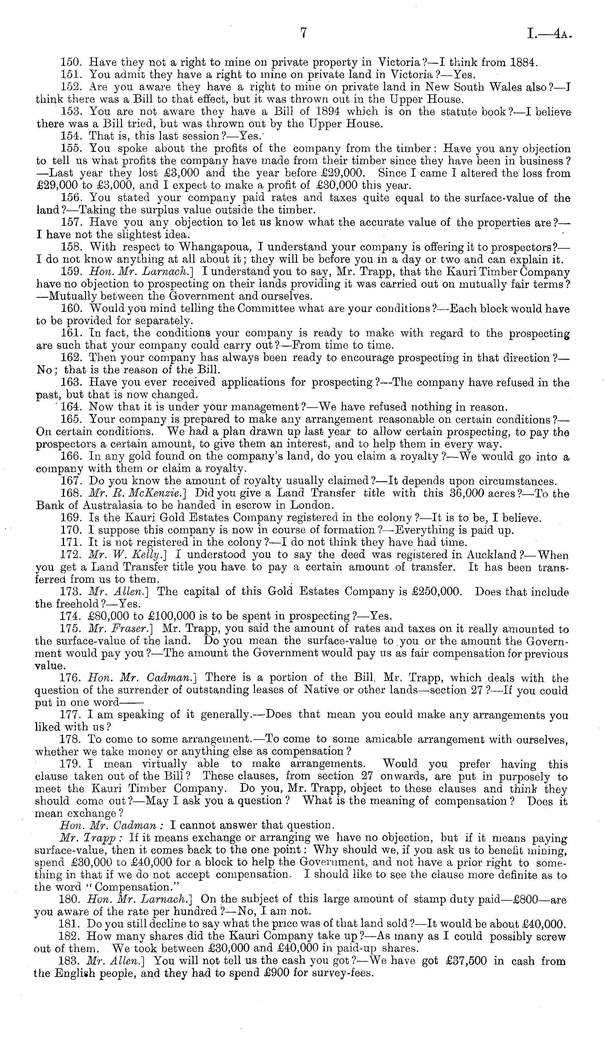 150. Have they not a right to mine on private property in Victoria ?—I think from 1884. 151. You admit they have a right to mine on private land in Victoria?— Yes. 152. Are you aware they have a right to mine on private land in New South Wales also?—T think there was a Bill to that effect, but it was thrown out in the Upper House. 153. You are not aware they have a Bill of 1894 which is on the statute book? —I believe there was a Bill tried, but was thrown out by the Upper House. 154. That is, this last session? —Yes. 155. You spoke about the profits of the company from the timber : Have you any objection to tell us what profits the company have made from their timber since they have been in business ? —Last year they lost £3,000 and the year before £29,000. Since I came I altered the loss from £29,000 to £3,000, and I expect to make a profit of £30,000 this year. 156. You stated your company paid rates and taxes quite equal to the surface-value of the land ? —Taking the surplus value outside the timber. 157. Have you any objection to let us know what the accurate value of the properties are?— I have not the slightest idea. 158. With respect to Whangapoua, I understand your company is offering it to prospectors?— Ido not know anything at all about it; they will be before you in a day or two and can explain it. 159. Hon. Mr. Larnach.] I understand you to say, Mr. Trapp, that the Kauri Timber Company have no objection to prospecting on their lands providing it was carried out on mutually fair terms? —Mutually between the Government and ourselves. 160. Would you mind telling the Committee what are your conditions ?—Each block would have to be provided for separately. 161. In fact, the conditions your company is ready to make with regard to the prospecting are such that your company could carry out ?—Prom time to time. 162. Then your company has always been ready to encourage prospecting in that direction?— No ; that is the reason of the Bill. 163. Have you ever received applications for prospecting?— The company have refused in the past, but that is now changed. ' 164. Now that it is under your management ?—We have refused nothing in reason. 165. Your company is prepared to make any arrangement reasonable on certain conditions?— On certain conditions. We had a plan drawn up last year to allow certain prospecting, to pay the prospectors a certain amount, to give them an interest, and to help them in every way. 166. In any gold found on the company's land, do you claim a royalty ? —We would go into a company with them or claim a royalty. 167. Do you know the amount of royalty usually claimed?—lt depends upon circumstances. 168. Mr. B. McKenzie.] Did you give a Land Transfer title with this 36,000 acres?—To the Bank of Australasia to be handed in escrow in London. 169. Is the Kauri Gold Estates Company registered in the colony ?—lt is to be, I believe. 170. 1 suppose this company is now in course of formation ?—Everything is paid up. 171. It is not registered in the colony? —I do not think they have had time. 172. Mr. W. Kelly.] I understood you to say the deed was registered in Auckland?— When you get a Land Transfer title you have to pay a certain amount of transfer. It has been transferred from us to them. 173. Mr. Allen.] The capital of this Gold Estates Company is £250,000. Does that include the freehold ?—Yes. 174. £80,000 to £100,000 is to be spent in prospecting ?—Yes. 175. Mr. Fraser.] Mr. Trapp, you said the amount of rates and taxes on it really amounted to the surface-value of the land. Do you mean the surface-value to you or the amount the Government would pay you ?—The amount the Government would pay us as fair compensation for previous value. 176. Hon. Mr. Cadman.] There is a portion of the Bill. Mr. Trapp, which deals with the question of the surrender of outstanding leases of Native or other lands—section 27 ?—lf you could put in one word 177. I am speaking of it generally.—Does that mean you could make any arrangements you liked with us? 178. To come to some arrangement.—To come to some amicable arrangement with ourselves, whether we take money or anything else as compensation ? 179. I mean virtually able to make arrangements. Would you prefer having this clause taken out of the Bill ? These clauses, from section 27 onwards, are put in purposely to meet the Kauri Timber Company. Do you, Mr. Trapp, object to these clauses and think they should come out? —May I ask you a question ? What is the meaning of compensation ? Does it mean exchange ? Hon. Mr. Cadman : I cannot answer that question. Mr. Trapp : If it means exchange or arranging we have no objection, but if it means paying surface-value, then it comes back to the one point: Why should we, if you ask us to benefit mining, spend £30,000 to £40,000 for a block to help the Government, and not have a prior right to something in that if we do not accept compensation. I should like to see the clause more definite as to the word "Compensation." 180. Hon. Mr. Larnach.] On the subject of this large amount of stamp duty paid—£Boo—are you aware of the rate per hundred ? —No, I am not. 181. Do you still decline to say what the price was of that land sold ?—lt would be about £40,000. 182. How many shares did the Kauri Company take up?—As many as I could possibly screw out of them. We took between £30,000 and £40,000 in paid-up shares. 183. Mr. Allen.] You will not tell us the cash you got ?—We have got £37,500 in cash from the English people, and they had to spend £900 for survey-fees.