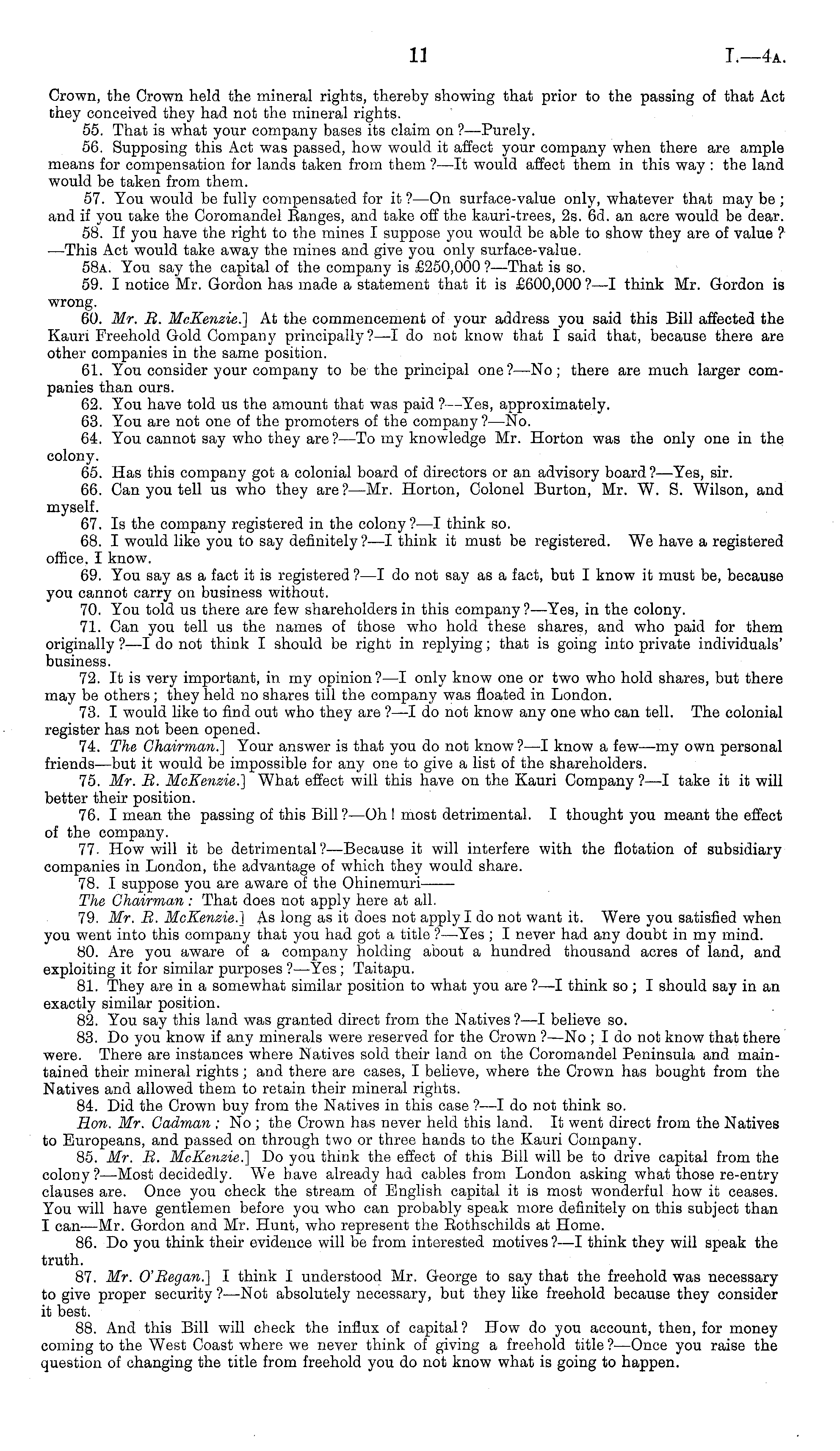 Crown, the Grown held the mineral rights, thereby showing that prior to the passing of that Act they conceived they had not the mineral rights. 55. That is what your company bases its claim on ?—Purely. 56. Supposing this Act was passed, how would it affect your company when there are ample means for compensation for lands taken from them ?—lt would affect them in this way : the land would be taken from them. 57. You would be fully compensated for it ?—On surface-value only, whatever that may be ; and if you take the Coromandel Eanges, and take off the kauri-trees, 2s. fed. an acre would be dear. 58. If you have the right to the mines I suppose you would be able to show they are of value ? —This Act would take away the mines and give you only surf ace-value. 58a. You say the capital of the company is £250,000 ? —That is so. 59. I notice Mr. Gordon has made a statement that it is £600,000 ? —I think Mr. Gordon is wrong. 60. Mr. B. McKenzie.] At the commencement of your address you said this Bill affected the Kauri Freehold Gold Company principally?—l do not know that I said that, because there are other companies in the same position. 61. You consider your company to be the principal one?—No; there are much larger companies than ours. 62. You have told us the amount that was paid ? —Yes, approximately. 63. You are not one of the promoters of the company ?—No. 64. You cannot say who they are ? —To my knowledge Mr. Horton was the only one in the colony. 65. Has this company got a colonial board of directors or an advisory board?— Yes, sir. 66. Can you tell us who they are ? —Mr. Horton, Colonel Burton, Mr. W. S. Wilson, and myself. 67. Is the company registered in the colony? —I think so. 68. I would like you to say definitely ?—I think it must be registered. We have a registered office. I know. 69. You say as a fact it is registered ? —I do not say as a fact, but I know it must be, because you cannot carry on business without. 70. You told us there are few shareholders in this company ?—Yes, in the colony. 71. Can you tell us the names of those who hold these shares, and who paid for them originally ?—I do not think I should be right in replying; that is going into private individuals' business. 72. It is very important, in my opinion?—l only know one or two who hold shares, but there may be others; they held no shares till the company was floated in London. 73. I would like to find out who they are ? —I do not know any one who can tell. The colonial register has not been opened. 74. The Chairman.] Your answer is that you do not know ?—I know a few—my own personal friends —but it would be impossible for any one to give a list of the shareholders. 75. Mr. B. McKenzie.] What effect will this have on the Kauri Company ?—I take it it will better their position. 76. I mean the passing of this Bill? —Oh ! most detrimental. I thought you meant the effect of the company. 77. How will it be detrimental?— Because it will interfere with the flotation of subsidiary companies in London, the advantage of which they would share. 78. I suppose you are aware of the Ohinemuri The Chairman: That does not apply here at all. 79. Mr. B. McKenzie.] As long as it does not apply Ido not want it. Were you satisfied when you went into this company that you had got a title ?—Yes ; I never had any doubt in my mind. 80. Are you aware of a company holding about a hundred thousand acres of land, and exploiting it for similar purposes ?—Yes ; Taitapu. 81. They are in a somewhat similar position to what you are ? —I think so ; I should say in an exactly similar position. 82. You say this land was granted direct from the Natives?—l believe so. 83. Do you know if any minerals were reserved for the Crown ?—No ; I do not know that there were. There are instances where Natives sold their land on the Coromandel Peninsula and maintained their mineral rights ; and there are cases, I believe, where the Crown has bought from the Natives and allowed them to retain their mineral rights. 84. Did the Crown buy from the Natives in this case ? —I do not think so. Hon. Mr. Cadman ; No ; the Crown has never held this land. It went direct from the Natives to Europeans, and passed on through two or three hands to the Kauri Company. 85. Mr. B. McKenzie.] Do you think the effect of this Bill will be to drive capital from the colony ?—Most decidedly. W 7 e have already had cables from London asking what those re-entry clauses are. Once you check the stream of English capital it is most wonderful how it ceases. You will have gentlemen before you who can probably speak more definitely on this subject than I can —Mr. Gordon and Mr. Hunt, who represent the Eothschilds at Home. 86. Do you think their evidence will be from interested motives ?—I think they will speak the truth. 87. Mr. O'Began.] I think I understood Mr. George to say that the freehold was necessary to give proper security ?—Not absolutely necessary, but they like freehold because they consider it best. 88. And this Bill will check the influx of capital ? How do you account, then, for money coming to the West Coast where we never think of giving a freehold title ? —Once you raise the question of changing the title from freehold you do not know what is going to happen.