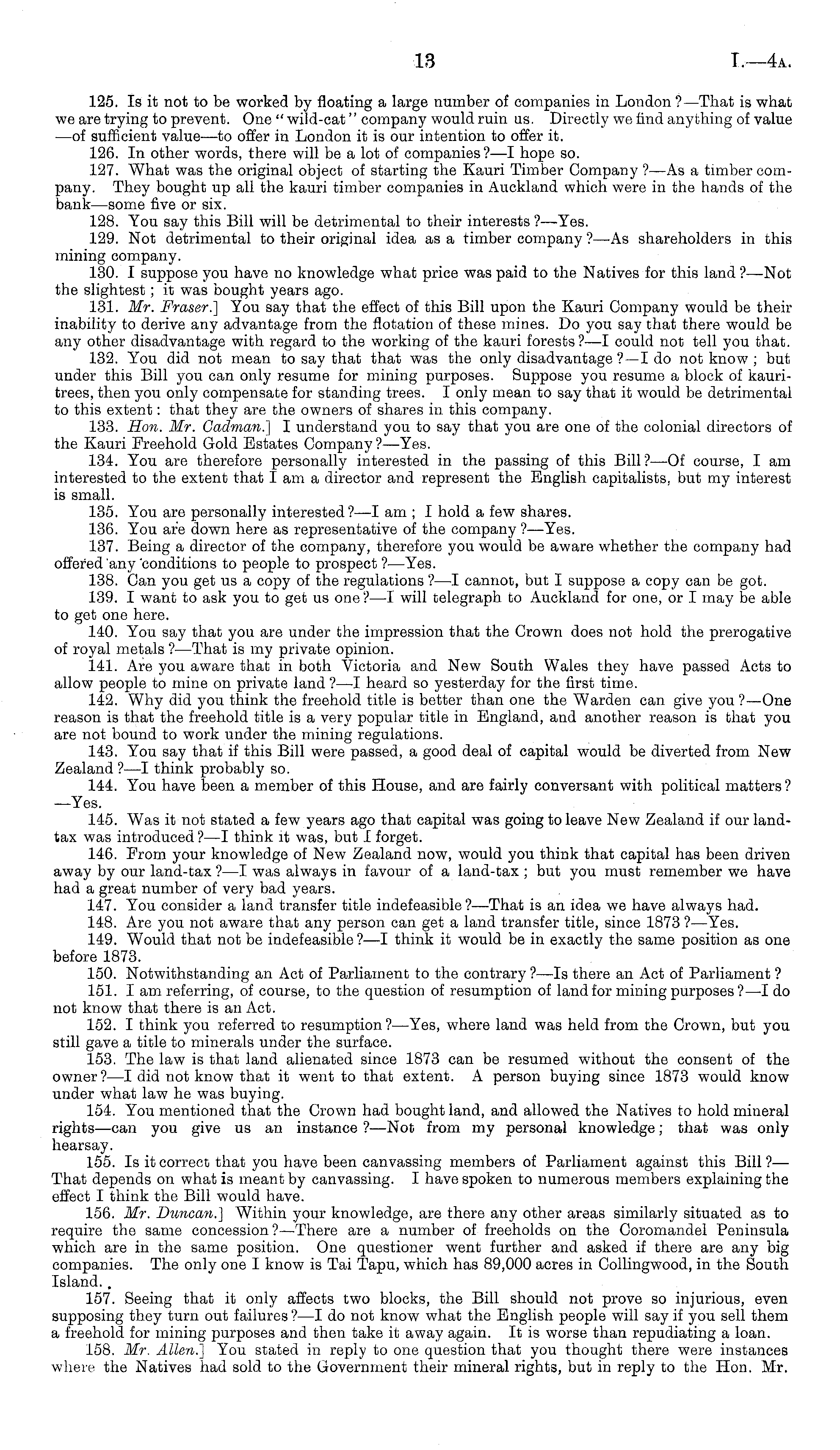 125. Is it not to be worked by floating a large number of companies in London ? —That is what we are trying to prevent. One "wild-eat" company would ruin us. Directly we find anything of value —of sufficient value—to offer in London it is our intention to offer it. 126. In other words, there will be a lot of companies?—l hope so. 127. What was the original object of starting the Kauri Timber Company ?—As a timber company. They bought up all the kauri timber companies in Auckland which were in the hands of the bank—some five or six. 128. You say this Bill will be detrimental to their interests ? —Yes. 129. Not detrimental to their original idea as a timber company ? —As shareholders in this mining company. 130. I suppose you have no knowledge what price was paid to the Natives for this land ?—Not the slightest; it was bought years ago. 131. Mr. Fraser.] You say that the effect of this Bill upon the Kauri Company would be their inability to derive any advantage from the flotation of these mines. Do you say that there would be any other disadvantage with regard to the working of the kauri forests ?—I could not tell you that. 132. You did not mean to say that that was the only disadvantage ?—I do not know ; but under this Bill you can only resume for mining purposes. Suppose you resume a block of kauritrees, then you only compensate for standing trees. I only mean to say that it would be detrimental to this extent: that they are the owners of shares in this company. 133. Hon. Mr. Gadman.] I understand you to say that you are one of the colonial directors of the Kauri Freehold Gold Estates Company ?—Yes. 134. You are therefore personally interested in the passing of this Bill ?—Of course, I am interested to the extent that I am a director and represent the English capitalists, but my interest is small. 135. You are personally interested?—l am ; I hold a few shares. 136. You are down here as representative of the company ?—Yes. 137. Being a director of the company, therefore you would be aware whether the company had offered'any'conditions to people to prospect? —Yes. 138. Can you get us a copy of the regulations ?—I cannot, but I suppose a copy can be got. 139. I want to ask you to get us one? —I will telegraph to Auckland for one, or I may be able to get one here. 140. You say that you are under the impression that the Crown does not hold the prerogative of royal metals ? —That is my private opinion. 141. Are you aware that in both Victoria and New South Wales they have passed Acts to allow people to mine on private land ?—I heard so yesterday for the first time. 142. Why did you think the freehold title is better than one the Warden can give you ?—One reason is that the freehold title is a very popular title in England, and another reason is that you are not bound to work under the mining regulations. 143. You say that if this Bill were passed, a good deal of capital would be diverted from New Zealand ?—I think probably so. 144. You have been a member of this House, and are fairly conversant with political matters? —Yes. 145. Was it not stated a few years ago that capital was going to leave New Zealand if our landtax was introduced?—l think it was, but I forget. 146. Prom your knowledge of New Zealand now, would you think that capital has been driven away by our land-tax ?—I was always in favour of a land-tax ; but you must remember we have had a great number of very bad years. 147. You consider a land transfer title indefeasible? —That is an idea we have always had. 148. Are you not aware that any person can get a land transfer title, since 1873 ?—Yes. 149. Would that not be indefeasible ?—I think it would be in exactly the same position as one before 1873. 150. Notwithstanding an Act of Parliament to the contrary ?—ls there an Act of Parliament ? 151. lam referring, of course, to the question of resumption of land for mining purposes ?—I do not know that there is an Act. 152. I think you referred to resumption?— Yes, where land was held from the Crown, but you still gave a title to minerals under the surface. 153. The law is that land alienated since 1873 can be resumed without the consent of the owner? —I did not know that it went to that extent. A person buying since 1873 would know under what law he was buying. 154. You mentioned that the Crown had bought land, and allowed the Natives to hold mineral rights—can you give us an instance ? —Not from my personal knowledge; that was only hearsay. 155. Is it correct that you have been canvassing members of Parliament against this Bill ? — That depends on what is meant by canvassing. I have spoken to numerous members explaining the effect I think the Bill would have. 156. Mr. Duncan.] Within your knowledge, are there any other areas similarly situated as to require the same concession ?—There are a number of freeholds on the Coromandel Peninsula which are in the same position. One questioner went further and asked if there are any big companies. The only one I know is Tai Tapu, which has 89,000 acres in Collingwood, in the South Island. . 157. Seeing that it only affects two blocks, the Bill should not prove so injurious, even supposing they turn out failures ?—I do not know what the English people will say if you sell them a freehold for mining purposes and then take it away again. It is worse than repudiating a loan. 158. Mr. Allen.] You stated in reply to one question that you thought there were instances where the Natives had sold to the Government their mineral rights, but in reply to the Hon. Mr.