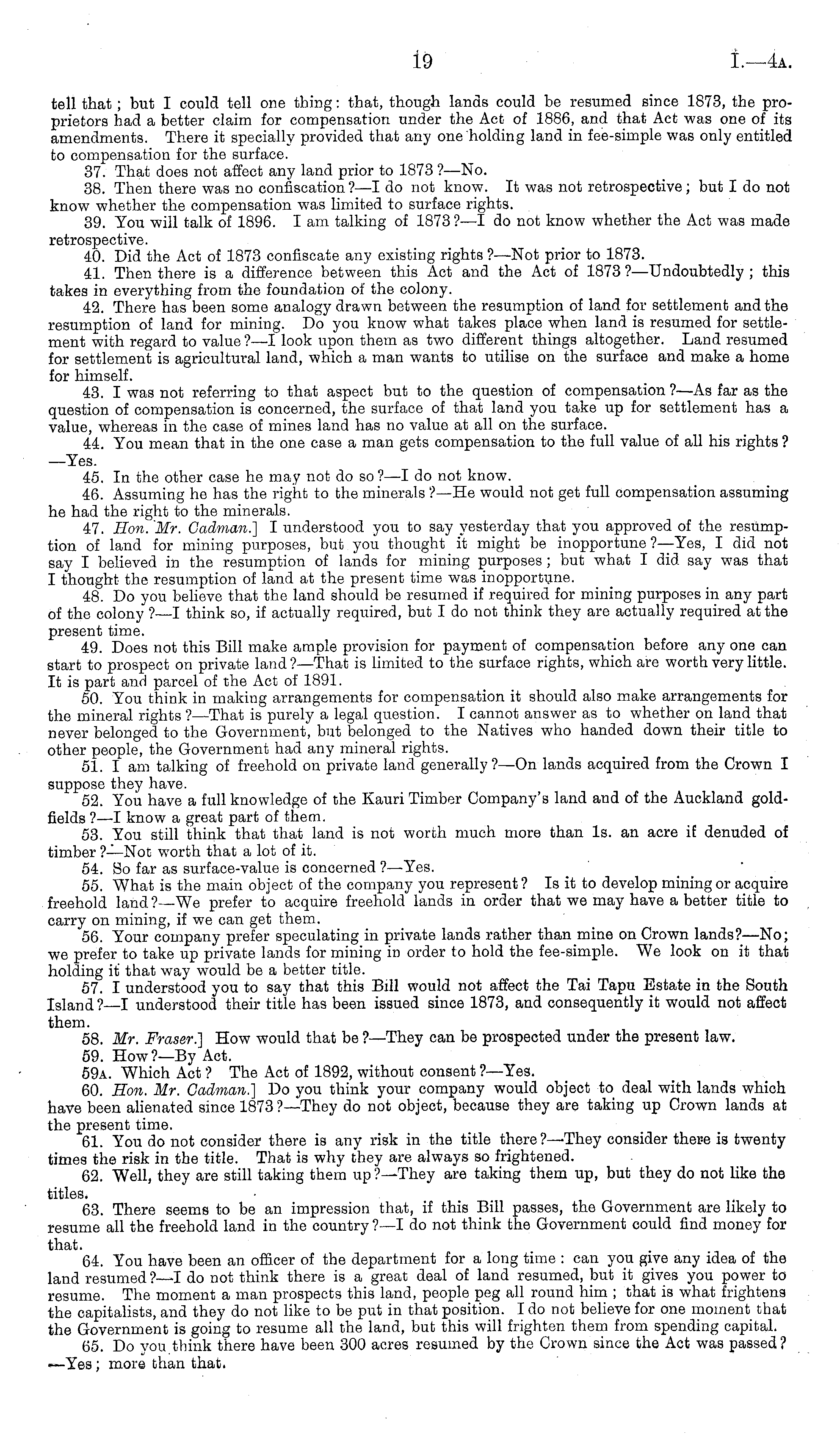 tell that; but I could tell one thing: that, though lands could be resumed since 1873, the proprietors had a better claim for compensation under the Act of 1886, and that Act was one of its amendments. There it specially provided that any one holding land in fee-simple was only entitled to compensation for the surface. 37. That does not affect any land prior to 1873 ?—No. 38. Then there was no confiscation ? —I do not know. It was not retrospective; but Ido not know whether the compensation was limited to surface rights. 39. You will talk of 1896. lam talking of 1873 ? —I do not know whether the Act was made retrospective. 40. Did the Act of 1873 confiscate any existing rights ? —Not prior to 1873. 41. Then there is a difference between this Act and the Act of 1873?— Undoubtedly; this takes in everything from the foundation of the colony. 42. There has been some analogy drawn between the resumption of land for settlement and the resumption of land for mining. Do you know what takes place when land is resumed for settlement with regard to value ?—I look upon them as two different things altogether. Land resumed for settlement is agricultural land, which a man wants to utilise on the surface and make a home for himself. 43. I was not referring to that aspect but to the question of compensation ?—As far as the question of compensation is concerned, the surface of that land you take up for settlement has a value, whereas in the case of mines land has no value at all on the surface. 44. You mean that in the one case a man gets compensation to the full value of all his rights ? —Yes. 45. In the other case he may not do so ?—I do not know. 46. Assuming he has the right to the minerals ? —He would not get full compensation assuming he had the right to the minerals. 47. Hon. 'Mr. G adman.] I understood you to say yesterday that you approved of the resumption of land for mining purposes, but you thought it might be inopportune ?—Yes, I did not say I believed in the resumption of lands for mining purposes ; but what I did say was that I thought the resumption of land at the present time was inopportune. 48. Do you believe that the land should be resumed if required for mining purposes in any part of the colony ? —I think so, if actually required, but Ido not think they are actually required at the present time. 49. Does not this Bill make ample provision for payment of compensation before any one can start to prospect on private land? —That is limited to the surface rights, which are worth very little. It is part and parcel of the Act of 1891. 50. You think in making arrangements for compensation it should also make arrangements for the mineral rights ? —That is purely a legal question. I cannot answer as to whether on land that never belonged to the Government, but belonged to the Natives who handed down their title to other people, the Government had any mineral rights. 51. I am talking of freehold on private land generally? —On lands acquired from the Crown I suppose they have. 52. You have a full knowledge of the Kauri Timber Company's land and of the Auckland goldfields ?—I know a great part of them. 53. You still think that that land is not worth much more than Is. an acre if denuded of timber ?—Not worth that a lot of it. 54. So far as surface-value is concerned ?—Yes. 55. What is the main object of the company you represent? Is it to develop mining or acquire freehold land ?—We prefer to acquire freehold lands in order that we may have a better title to carry on mining, if we can get them. 56. Your company prefer speculating in private lands rather than mine on Crown lands?—No; we prefer to take up private lands for mining in order to hold the fee-simple. We look on it that holding it that way would be a better title. 57. I understood you to say that this Bill would not affect the Tai Tapu Estate in the South Island? —I understood their title has been issued since 1873, and consequently it would not affect them. 58. Mr. Fraser.] How would that be ? —They can be prospected under the present law. 59. How?—By Act. 59a. Which Act ? The Act of 1892, without consent ? —Yes. 60. Hon. Mr. Oadmcm.] Do you think your company would object to deal with lands which have been alienated since 1873 ? —They do not object, because they are taking up Crown lands at the present time. 61. You do not consider there is any risk in the title there?— They consider ther-e is twenty times the risk in the title. That is why they are always so frightened. 62. Well, they are still taking them up? —They are taking them up, but they do not like the titles. 63. There seems to be an impression that, if this Bill passes, the Government are likely to resume all the freehold land in the country ?—I do not think the Government could find money for that. 64. You have been an officer of the department for a long time : can you give any idea of the land resumed ? —I do not think there is a great deal of land resumed, but it gives you power to resume. The moment a man prospects this land, people peg all round him ; that is what frightens the capitalists, and they do not like to be put in that position. Ido not believe for one moment that the Government is going to resume all the land, but this will frighten them from spending capital. 65. Do you think there have been 300 acres resumed by the Crown since the Act was passed? ■ —Yes ; more than that.