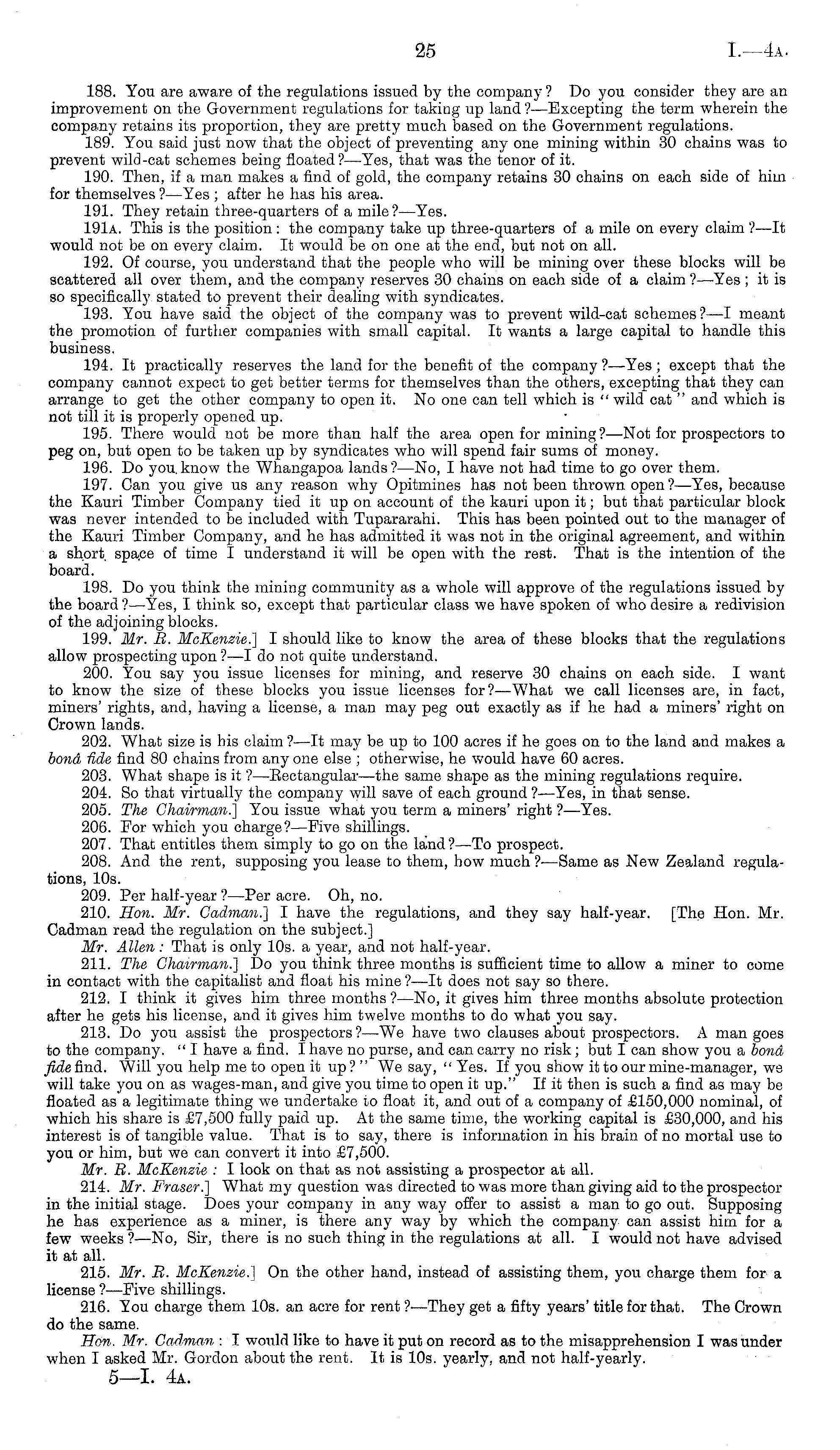 188. You are aware of the regulations issued by the company ? Do you consider they are an improvement on the Government regulations for taking up land ?—Excepting the term wherein the company retains its proportion, they are pretty much based on the Government regulations. 189. You said just now that the object of preventing any one mining within 30 chains was to prevent wild-cat schemes being floated?— Yes, that was the tenor of it. 190. Then, if a man makes a find of gold, the company retains 30 chains on each side of him for themselves ? —Yes ; after he has his area. 191. They retain three-quarters of a mile? —Yes. 191 a. This is the position : the company take up three-quarters of a mile on every claim ?—lt would not be on every claim. It would be on one at the end, but not on all. 192. Of course, you understand that the people who will be mining over these blocks will be scattered all over them, and the company reserves 30 chains on each side of a claim ? —Yes ; it is so specifically stated to prevent their dealing with syndicates. 193. You have said the object of the company was to prevent wild-cat schemes ?—I meant the promotion of further companies with small capital. It wants a large capital to handle this business. 194. It practically reserves the land for the benefit of the company ?—Yes; except that the company cannot expect to get better terms for themselves than the others, excepting that they can arrange to get the other company to open it. No one can tell which is " wild cat " and which is not till it is properly opened up. 195. There would not be more than half the area open for mining?— Not for prospectors to peg on, but open to be taken up by syndicates who will spend fair sums of money. 196. Do you.know the Whangapoa lands? —No, I have not had time to go over them. 197. Can you give us any reason why Opitmines has not been thrown open?— Yes, because the Kauri Timber Company tied it up on account of the kauri upon it; but that particular block was never intended to be included with Tupararahi. This has been pointed out to the manager of the Kauri Timber Company, and he has admitted it was not in the original agreement, and within a short space of time I understand it will be open with the rest. That is the intention of the board. 198. Do you think the mining community as a whole will approve of the regulations issued by the board ? —Yes, I think so, except that particular class we have spoken of who desire a redivision of the adjoining blocks. 199. Mr. R. McKenzie.] I should like to know the area of these blocks that the regulations allow prospecting upon ?—I do not quite understand. 200. You say you issue licenses for mining, and reserve 30 chains on each side. I want to know the size of these blocks you issue licenses for? —What we call licenses are, in fact, miners' rights, and, having a license, a man may peg out exactly as if he had a miners' right on Crown lands. 202. What size is bis claim ?—lt may be up to 100 acres if he goes on to the land and makes a bond fide find 80 chains from any one else ; otherwise, he would have 60 acres. 203. What shape is it ?—Eectangular—the same shape as the mining regulations require. 204. So that virtually the company will save of each ground ? —Yes, in that sense. 205. The Chairman.] You issue what you term a miners' right ? —Yes. 206. For which you charge?— Five shillings. 207. That entitles them simply to go on the land?—To prospect. 208. And the rent, supposing you lease to them, how much ? —Same as New Zealand regulations, 10s. 209. Per half-year ?—Per acre. Oh, no. 210. Hon. Mr. Oadmcm.] I have the regulations, and they say half-year. [The Hon. Mr. Cadman read the regulation on the subject.] Mr. Allen : That is only 10s. a year, and not half-year. 211. The Chairman.] Do you think three months is sufficient time to allow a miner to come in contact with the capitalist and float his mine ?—lt does not say so there. 212. I think it gives him three months ? —No, it gives him three months absolute protection after he gets his license, and it gives him twelve months to do what you say. 213. Do you assist the prospectors?—We have two clauses about prospectors. A man goes to the company. " I have a find. I have no purse, and can carry no risk; but I can show you a bond fide find. Will you help me to open it up ? " We say, " Yes. If you show it to our mine-manager, we will take you on as wages-man, and give you time to open it up." If it then is such a find as may be floated as a legitimate thing we undertake io float it, and out of a company of £150,000 nominal, of which his share is £7,500 fully paid up. At the same time, the working capital is £30,000, and his interest is of tangible value. That is to say, there is information in his brain of no mortal use to you or him, but we can convert it into £7,500. Mr. B. McKenzie : I look on that as not assisting a prospector at all. 214. Mr. Fraser.] What my question was directed to was more than giving aid to the prospector in the initial stage. Does your company in any way offer to assist a man to go out. Supposing he has experience as a miner, is there any way by which the company can assist him for a few weeks ?—No, Sir, there is no such thing in the regulations at all. I would not have advised it at all. 215. Mr. B. McKenzie.] On the other hand, instead of assisting them, yon charge them for a license ?—Five shillings. 216. You charge them 10s. an acre for rent ?—They get a fifty years' title for that. The Crown do the same. Hon. Mr. Cadman : I would like to have it put on record as to the misapprehension I was under when I asked Mr. Gordon about the rent. It is 10s. yearly, and not half-yearly. s—l. 4a.