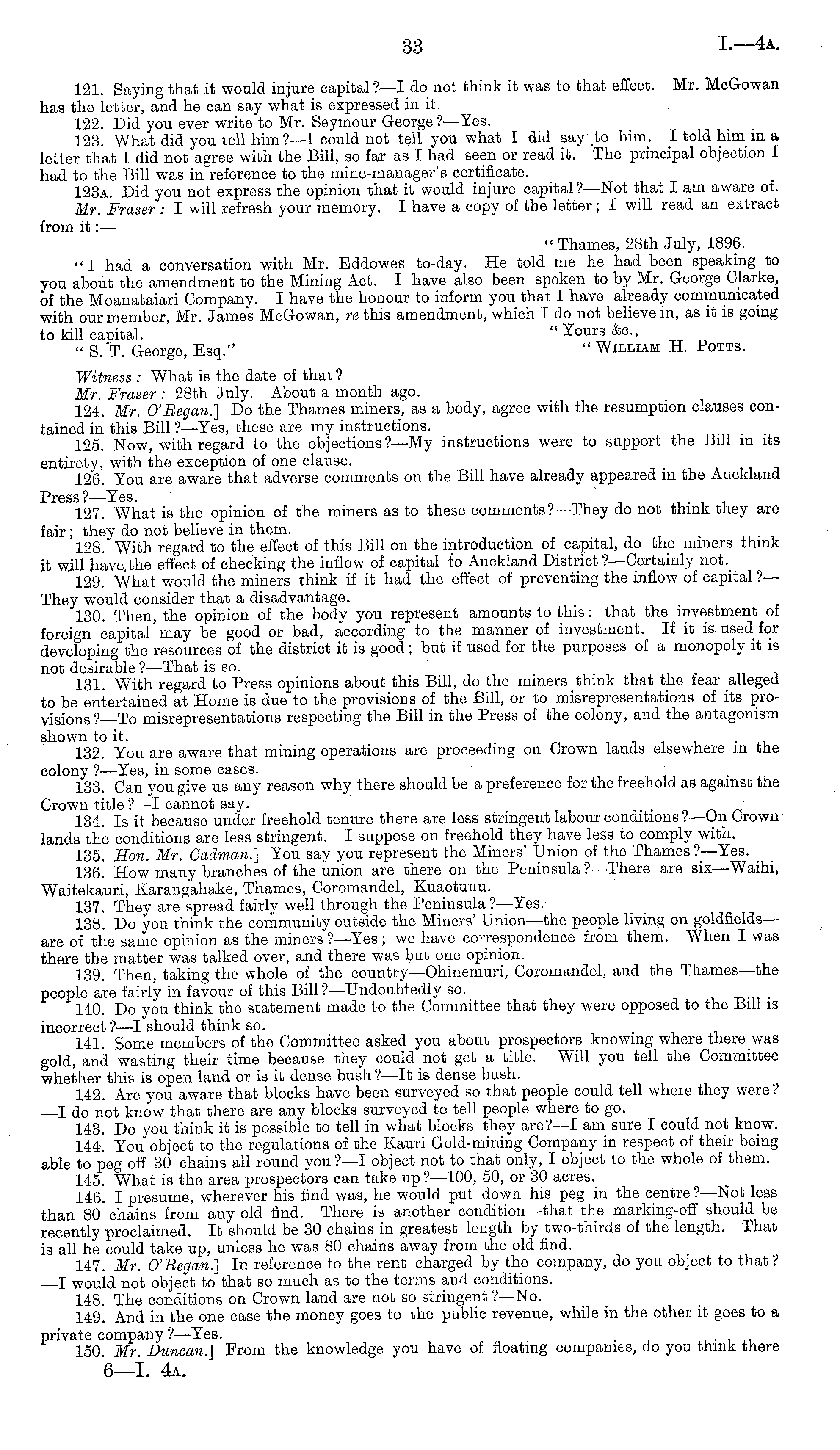 121. Saying that it would injure capital?—l do not think it was to that effect. Mr. McGowan has the letter, and he can say what is expressed in it. 122. Did you ever write to Mr. Seymour George? —Yes. 123. What did you tell him ?—I could not tell you what I did say .to him. I told him in a letter that I did not agree with the Bill, so far as I had seen or read it. The principal objection I had to the Bill was in reference to the mine-manager's certificate. 123 a. Did you not express the opinion that it would injure capital ?—Not that I am aware of. Mr. Fraser : I will refresh your memory. I have a copy of the letter; I will read an extract from it:— " Thames, 28th July, 1896. "I had a conversation with Mr. Eddowes to-day. He told me he had been speaking to you about the amendment to the Mining Act. I have also been spoken to by Mr. George Clarke, of the Moanataiari Company. I have the honour to inform you that I have already communicated with our member, Mr. James McGowan, re this amendment, which I do not believe in, as it is going to kill capital. " Yours &c, " S. T. George, Esq." " William H. Potts. Witness : What is the date of that ? Mr. Fraser : 28th July. About a month ago. 124. Mr. o'Began.] Do the Thames miners, as a body, agree with the resumption clauses contained in this Bill ? —Yes, these are my instructions. 125. Now, with regard to the objections?—My instructions were to support the Bill in its entirety, with the exception of one clause. 126. You are aware that adverse comments on the Bill have already appeared in the Auckland Press?— Yes. . 127. What is the opinion of the miners as to these comments? —They do not think they are fair ; they do not believe in them. , 128. With regard to the effect of this Bill on the introduction of capital, do the miners think it will have.the effect of checking the inflow of capital to Auckland District?— Certainly not. 129. What would the miners think if it had the effect of preventing the inflow of capital ?— They would consider that a disadvantage. 130. Then, the opinion of the body you represent amounts to this: that the investment of foreign capital may be good or bad, according to the manner of investment. If it is. used for developing the resources of the district it is good; but if used for the purposes of a monopoly it is not desirable ?—That is so. 131. With regard to Press opinions about this Bill, do the miners think that the tear alleged to be entertained at Home is due to the provisions of the Bill, or to misrepresentations of its provisions?—To misrepresentations respecting the Bill in the Press of the colony, and the antagonism shown to it. , 132. You are aware that mining operations are proceeding on Crown lands elsewhere m the colony ?—Yes, in some cases. 133. Can you give us any reason why there should be a preference for the freehold as against the Crown title ?—I cannot say. 134. Is it because under freehold tenure there are less stringent labour conditions ?—On Crown lands the conditions are less stringent. I suppose on freehold they have less to comply with. 135. Hon. Mr. Gadman.] You say you represent the Miners' Union of the Thames ?■ —Yes. 136. How many branches of the union are there on the Peninsula ?—There are six—Waihi, Waitekauri, Karangahake, Thames, Coromandel, Kuaotunu. 137. They are spread fairly well through the Peninsula ?—Yes. 138. Do you think the community outside the Miners' Union—the people living on goldfields— are of the same opinion as the miners? —Yes; we have correspondence from them. When I was there the matter was talked over, and there was but one opinion. 139. Then, taking the whole of the country —Ohinemuri, Coromandel, and the Thames—the people are fairly in favour of this Bill ?—Undoubtedly so. 140. Do you think the statement made to the Committee that they were opposed to the Bill is incorrect? —I should think so. 141. Some members of the Committee asked you about prospectors knowing where there was gold, and wasting their time because they could not get a title. Will you tell the Committee whether this is open land or is it dense bush ?—lt is dense bush. 142. Are you aware that blocks have been surveyed so that people could tell where they were? I do not know that there are any blocks surveyed to tell people where to go. 143. Do you think it is possible to tell in what blocks they are?—l am sure I could not know. 144. You object to the regulations of the Kauri Gold-mining Company in respect of their being able to peg off 30 chains all round you ?—I object not to that only, I object to the whole of them. 145. What is the area prospectors can take up?— 100, 50, or 30 acres. 146. I presume, wherever his find was, he would put down his peg in the centre ?—Not less than 80 chains from any old find. There is another condition—that the marking-off should be recently proclaimed. It should be 30 chains in greatest length by two-thirds of the length. That is all he could take up, unless he was 80 chains away from the old find. 147. Mr. O'Began.] In reference to the rent charged by the company, do you object to that ? I would not object to that so much as to the terms and conditions. 148. The conditions on Crown land are not so stringent ?—No. 149. And in the one case the money goes to the public revenue, while in the other it goes to a private company ? —Yes. . , 150. Mr. Duncan.] From the knowledge you have of floating companies, do you think there 6—l. 4a.