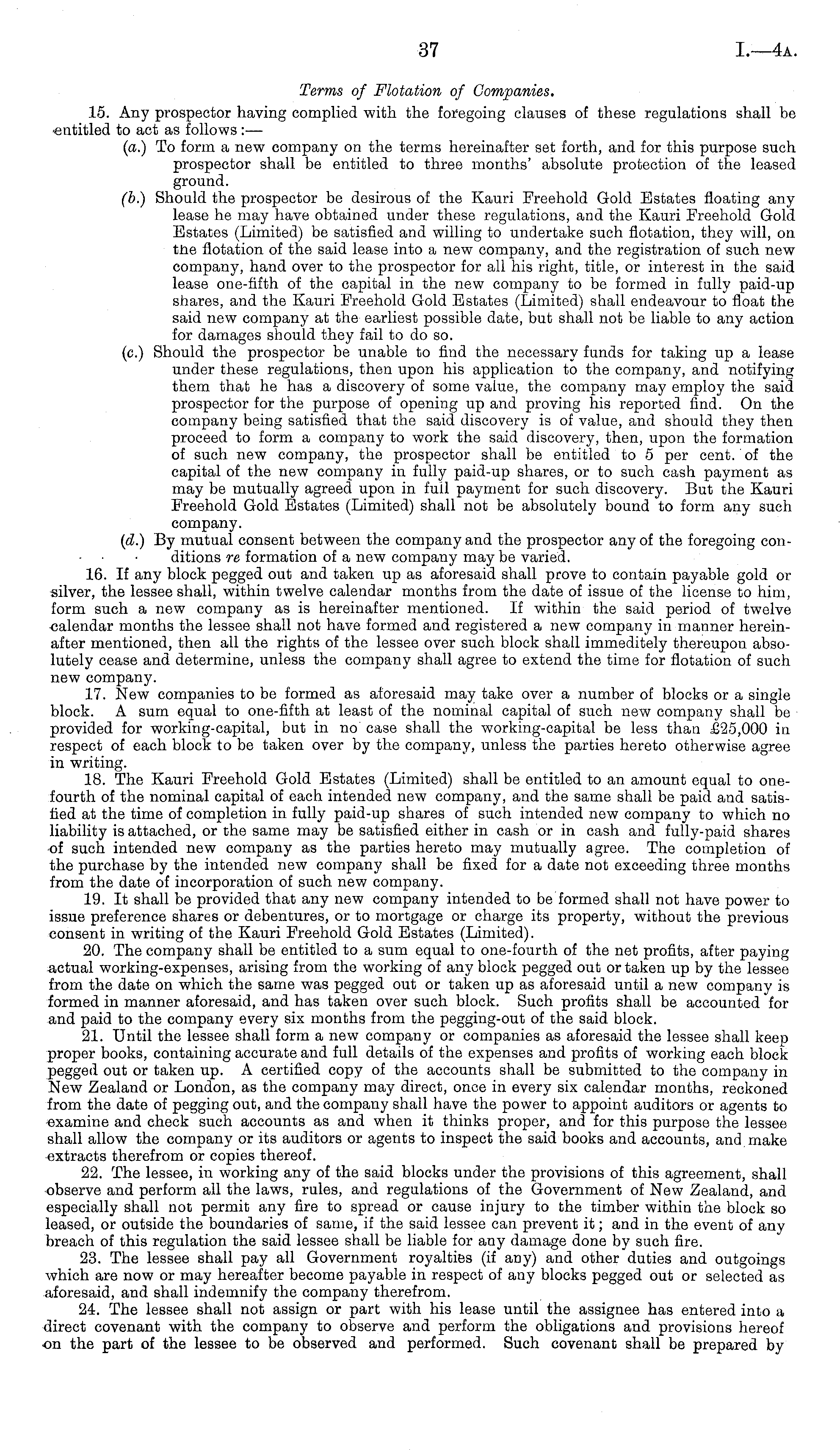 Terms of Flotation of Companies. 15. Any prospector having complied with the foregoing clauses of these regulations shall be •entitled to act as follows : — (a.) To form a new company on the terms hereinafter set forth, and for this purpose such prospector shall be entitled to three months' absolute protection of the leased ground. (b.) Should the prospector be desirous of the Kauri Freehold Gold Estates floating any lease he may have obtained under these regulations, and the Kauri Freehold Gold Estates (Limited) be satisfied and willing to undertake such notation, they will, on trie notation of the said lease into a new company, and the registration of such new company, hand over to the prospector for all his right, title, or interest in the said lease one-fifth of the capital in the new company to be formed in fully paid-up shares, and the Kauri Freehold Gold Estates (Limited) shall endeavour to float the said new company at the earliest possible date, but shall not be liable to any action for damages should they fail to do so. (c.) Should the prospector be unable to find the necessary funds for taking up a lease under these regulations, then upon his application to the company, and notifying them that he has a discovery of some value, the company may employ the said prospector for the purpose of opening up and proving his reported find. On the company being satisfied that the said discovery is of value, and should they then proceed to form a company to work the said discovery, then, upon the formation of such new company, the prospector shall be entitled to 5 per cent, of the capital of the new company in fully paid-up shares, or to such cash payment as may be mutually agreed upon in full payment for such discovery. But the Kauri Freehold Gold Estates (Limited) shall not be absolutely bound to form any such company. (d.) By mutual consent between the company and the prospector any of the foregoing conditions re formation of a new company may be varied. 16. If any block pegged out and taken up as aforesaid shall prove to contain payable gold or silver, the lessee shall, within twelve calendar months from the date of issue of the license to him, form such a new company as is hereinafter mentioned. If within the said period of twelve calendar months the lessee shall not have formed and registered a new company in manner hereinafter mentioned, then all the rights of the lessee over such block shall immeditely thereupon absolutely cease and determine, unless the company shall agree to extend the time for flotation of such new company. 17. New companies to be formed as aforesaid may take over a number of blocks or a single block. A sum equal to one-fifth at least of the nominal capital of such new company shall be provided for working-capital, but in no case shall the working-capital be less than £25,000 in respect of each block to be taken over by the company, unless the parties hereto otherwise agree in writing. 18. The Kauri Freehold Gold Estates (Limited) shall be entitled to an amount equal to onefourth of the nominal capital of each intended new company, and the same shall be paid and satisfied at the time of completion in fully paid-up shares of such intended new company to which no liability is attached, or the same may be satisfied either in cash or in cash and fully-paid shares •of such intended new company as the parties hereto may mutually agree. The completion of the purchase by the intended new company shall be fixed for a date not exceeding three months from the date of incorporation of such new company. 19. It shall be provided that any new company intended to be formed shall not have power to issue preference shares or debentures, or to mortgage or charge its property, without the previous consent in writing of the Kauri Freehold Gold Estates (Limited). 20. The company shall be entitled to a sum equal to one-fourth of the net profits, after paying actual working-expenses, arising from the working of any block pegged out or taken up by the lessee from the date on which the same was pegged out or taken up as aforesaid until a new company is formed in manner aforesaid, and has taken over such block. Such profits shall be accounted for and paid to the company every six months from the pegging-out of the said block. 21. Until the lessee shall form a new company or companies as aforesaid the lessee shall keep proper books, containing accurate and full details of the expenses and profits of working each block pegged out or taken up. A certified copy of the accounts shall be submitted to the company in New Zealand or London, as the company may direct, once in every six calendar months, reckoned from the date of pegging out, and the company shall have the power to appoint auditors or agents to examine and check such accounts as and when it thinks proper, and for this purpose the lessee shall allow the company or its auditors or agents to inspect the said books and accounts, and make extracts therefrom or copies thereof. 22. The lessee, in working any of the said blocks under the provisions of this agreement, shall observe and perform all the laws, rules, and regulations of the Government of New Zealand, and especially shall not permit any fire to spread or cause injury to the timber within the block so leased, or outside the boundaries of same, if the said lessee can prevent it; and in the event of any breach of this regulation the said lessee shall be liable for any damage done by such fire. 23. The lessee shall pay all Government royalties (if any) and other duties and outgoings which are now or may hereafter become payable in respect of any blocks pegged out or selected as aforesaid, and shall indemnify the company therefrom. 24. The lessee shall not assign or part with his lease until the assignee has entered into a, direct covenant with the company to observe and perform the obligations and provisions hereof •on the part of the lessee to be observed and performed. Such