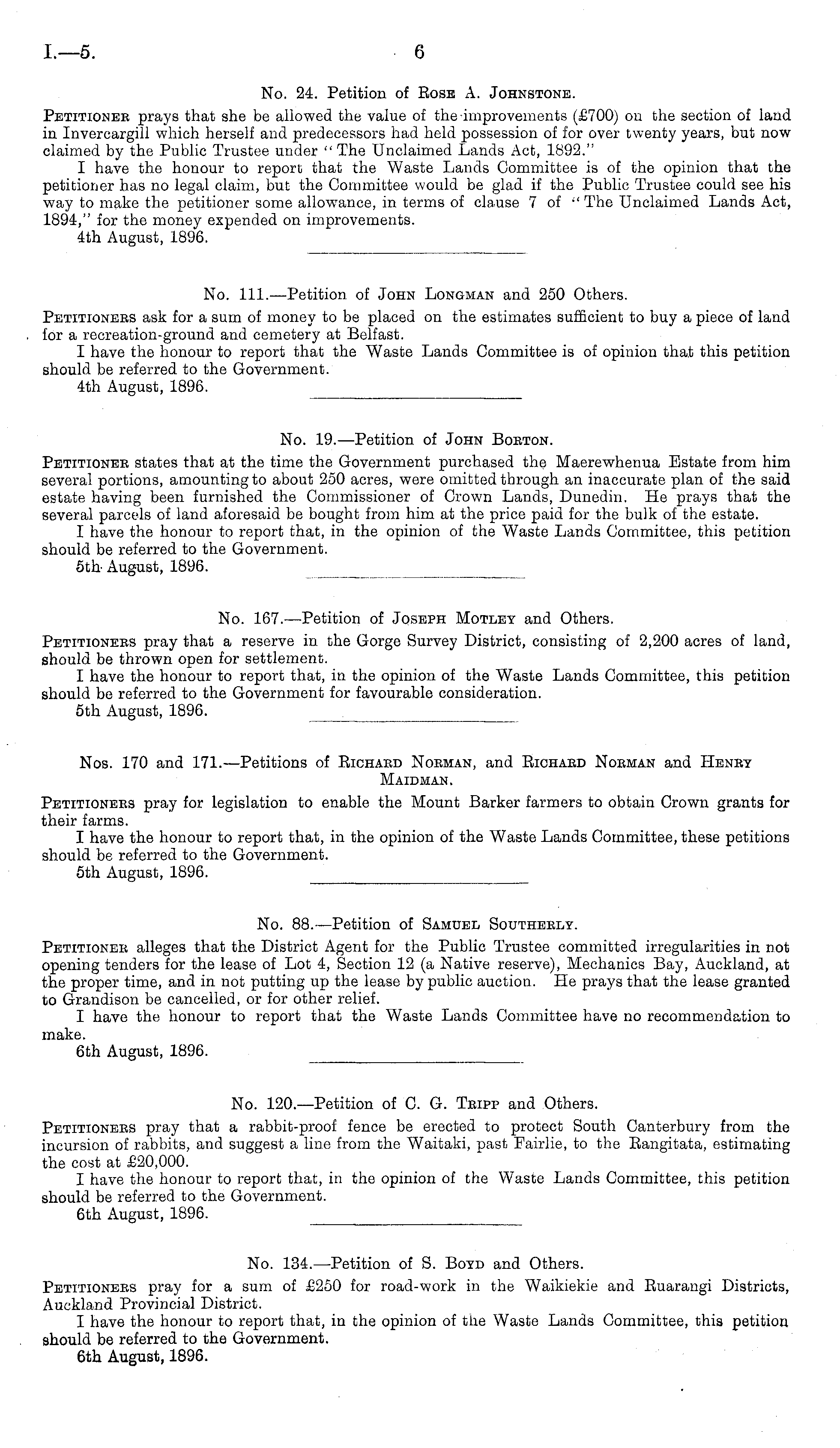 No. 19.—Petition of John Borton. Petitioner states that at the time the Government purchased the Maerewhenua Estate from him several portions, amounting to about 250 acres, were omitted through an inaccurate plan of the said estate having been furnished the Commissioner of Crown Lands, Dunedin. He prays that the several parcels of land aforesaid be bought from him at the price paid for the bulk of the estate. I have the honour to report that, in the opinion of the Waste Lands Committee, this petition should be referred to the Government. sth- August, 1896.