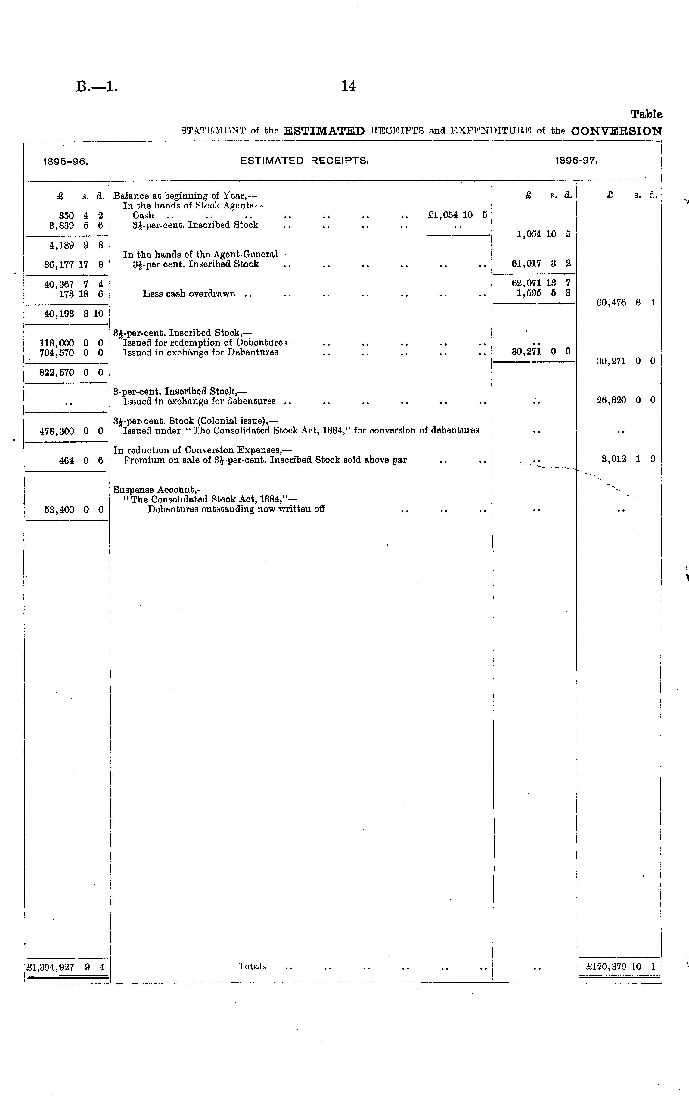 1895-96. ESTIMATED RECEIPTS, 189> i~97. £ s. d. 350 4 2 3,839 5 6 Balance at beginning of Year, — In the hands of Stock Agents— Cash .. .. .. .. .. .. .. £1,054 10 5 3J-per-cent. Inscribed Stock £ s. d. 1,054 10 5 £ s. d. 4,189 9 8 36,177 17 8 In the hands of the Agent-General— 3J-per cent. Inscribed Stock 61,017 3 2 40,367 7 4 173 18 6 Less cash overdrawn .. 62,071 13 7 1,595 5 3 40,193 8 10 3£-per-cent. Inscribed Stock, — Issued for redemption of Debentures Issued in exchange for Debentures 60,476 8 4 118,000 0 0 704,570 0 0 30,271 0 0 30,271 0 0 822,570 0 0 3-per-cent. Inscribed Stock, — Issued in exchange for debentures .. 26,620 0 0 3J-per-cent. Stock (Colonial issue), — Issued under " The Consolidated Stock Act, 1884," for conversion of debentures 478,300 0 0 464 0 6 In reduction of Conversion Expenses,— Premium on sale of 34-per-cent. Inscribed Stock sold above par 3,012 1 9 Suspense Account, — " The Consolidated Stock Act, 1884,"— Debentures outstanding now written off 53,400 0 0 Totals £1,394,927 9 4 £120,379 10 1