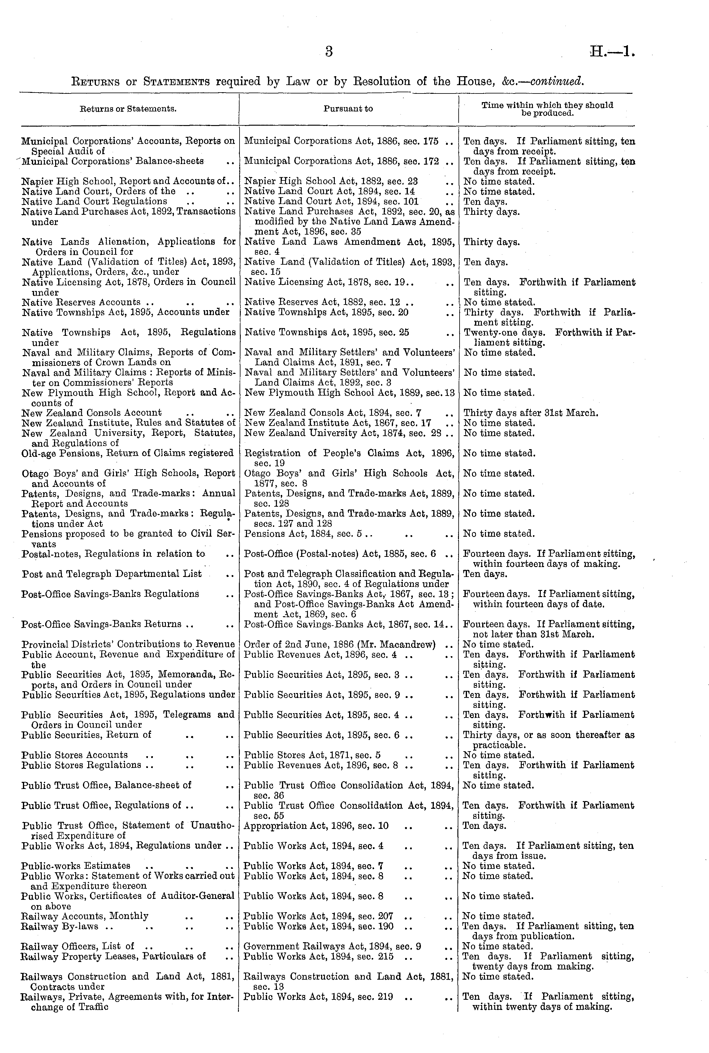 Beturns or Statements. Pursuant to Time within which they should be produced. Municipal Corporations' Accounts, Reports on Special Audit of Municipal Corporations' Balance-sheets Municipal Corporations Act, 1886, see. 175 .. Ten days. If Parliament sitting, ten days from receipt. Ten days. If Parliament sitting, ten days from receipt. No time stated. No time stated. Ten days. Thirty days. Municipal Corporations Act, 1886, sec. 172 .. Napier High School, Report and Accounts of.. Native Land Court, Orders of the Native Land Court Regulations Native Land Purchases Act, 1892, Transactions under Napier High School Act, 1882, sec. 23 Native Land Court Act, 1894, sec. 14 Native Land Court Act, 1894, sec. 101 Native Land Purchases Act, 1892, sec. 20, as modified by the Native Land Laws Amendment Act, 1896, sec. 35 Native Land Laws Amendment Act, 1895, sec. 4 Native Land (Validation of Titles) Act, 1893, sec. 15 Native Licensing Act, 1878, sec. 19.. Native Lands Alienation, Applications for Orders in Council for Native Land (Validation of Titles) Act, 1893, Applications, Orders, &c, under Native Licensing Act, 1878, Orders in Council under Native Reserves Accounts Native Townships Act, 1895, Accounts under Thirty days. Ten days. Native Reserves Act, 1882, sec. 12 .. Native Townships Act, 1895, sec. 20 Ten days. Forthwith if Parliament sitting. No time stated. Thirty days. Forthwith if Parliament sitting. Twenty-one days. Forthwith if Parliament sitting. No time stated. Native Townships Act, 1895, Regulations under Naval and Military Claims, Reports of Commissioners of Crown Lands on Naval and Military Claims : Reports of Minister on Commissioners' Reports New Plymouth High School, Report and Accounts of New Zealand Consols Account New Zealand Institute, Rules and Statutes of New Zealand University, Report, Statutes, and Regulations of Old-age Pensions, Return of Claims registered Native Townships Act, 1895, sec. 25 Naval and Military Settlers' and Volunteers' Land Claims Act, 1891, sec. 7 Naval and Military Settlers' and Volunteers' Land Claims Act, 1892, sec. 3 New Plymouth High School Act, 1889, sec. 13 No time stated. No time stated. New Zealand Consols Act, 1894, sec. 7 New Zealand Institute Act, 1867, sec. 17 New Zealand University Act, 1874, sec. 23 .. Thirty days after 31st March. No time stated. No time stated. Otago Boys' and Girls' High Schools, Report and Accounts of Patents, Designs, and Trade-marks: Annual Report and Accounts Patents, Designs, and Trade-marks: Regulations under Act Pensions proposed to be granted to Civil Servants Postal-notes, Regulations in relation to Registration of People's Claims Act, 1896, sec. 19 Otago Boys' and Girls' High Schools Act, 1877, sec. 8 Patents, Designs, and Trade-marks Act, 1889, sec. 128 Patents, Designs, and Trade-marks Act, 1889, sees. 127 and 128 Pensions Act, 1884, sec. 5 .. No time stated. No time stated. No time stated. No time stated. No time stated. Post-Offioe (Postal-notes) Act, 1885, sec. 6 .. Fourteen days. If Parliament sitting, within fourteen days of making. Ten days. Post and Telegraph Departmental List Post-Office Savings-Banks Regulations Post and Telegraph Classification and Regulation Act, 1890, sec. 4 of Regulations under Post-Office Savings-Banks Act,- 1867, sec. 13 ; and Post-Office Savings-Banks Act Amendment Act, 1869, sec. 6 Post-Office Savings-Banks Act, 1867, sec. 14.. Fourteen days. If Parliament sitting, within fourteen days of date. Post-Office Savings-Banks Returns Fourteen days. If Parliament sitting, not later than 31st March. No time stated. Ten days. Forthwith if Parliament sitting. Ten days. Forthwith ii Parliament sitting. Ten days. Forthwith if Parliament sitting. Ten days. Forthwith if Parliament sitting. Thirty days, or as soon thereafter as practicable. No time stated. Ten days. Forthwith if Parliament sitting. No time stated. Provincial Districts' Contributions to Revenue Public Account, Revenue and Expenditure of the Public Securities Act, 1895, Memoranda, Reports, and Orders in Council under Public Securities Act, 1895, Regulations under Order of 2nd June, 1886 (Mr. Maoandrew) .. Public Revenues Act, 1896, sec. 4 .. Public Securities Act, 1895, sec. 3 .. Public Securities Act, 1895, sec. 9 .. Public Securities Act, 1895, Telegrams and Orders in Council under Public Securities, Return of Public Securities Act, 1895, sec. 4 .. Public Securities Act, 1895, sec 6 .. Public Stores Accounts Public Stores Regulations Public Stores Act, 1871, see. 5 Public Revenues Act, 1896, sec. 8 .. Public Trust Office, Balance-sheet of Public Trust Office, Regulations of .. Public Trust Office Consolidation Act, 1894, sec. 36 Public Trust Office Consolidation Act, 1894, sec. 55 Appropriation Act, 1896, sec. 10 Ten days. Forthwith if Parliament sitting. Ten days. Public Trust Office, Statement of Unauthorised Expenditure of Public Works Act, 1894, Regulations under .. Public Works Act, 1894, sec. 4 Ten days. If Parliament sitting, ten days from issue. No time stated. No time stated. Public-works Estimates Public Works: Statement of Works carried out and Expenditure thereon Public Works, Certificates of Auditor-General on above Railway Accounts, Monthly Railway By-laws Public Works Act, 1894, sec. 7 Public Works Act, 1894, sec. 8 Public Works Act, 1894, sec. 8 No time stated. Public Works Act, 1894, sec. 207 .. Public Works Act, 1894, sec. 190 No time stated. Ten days. If Parliament sitting, ten days from publication. No time stated. Ten days. If Parliament sitting, twenty days from making. No time stated. Railway Officers, List of .. Railway Property Leases, Particulars of Government Railways Act, 1894, sec. 9 Public Works Act, 1894, sec. 215 .. Railways Construction and Land Act, 1881, Railways Construction and Land Act, 1881,