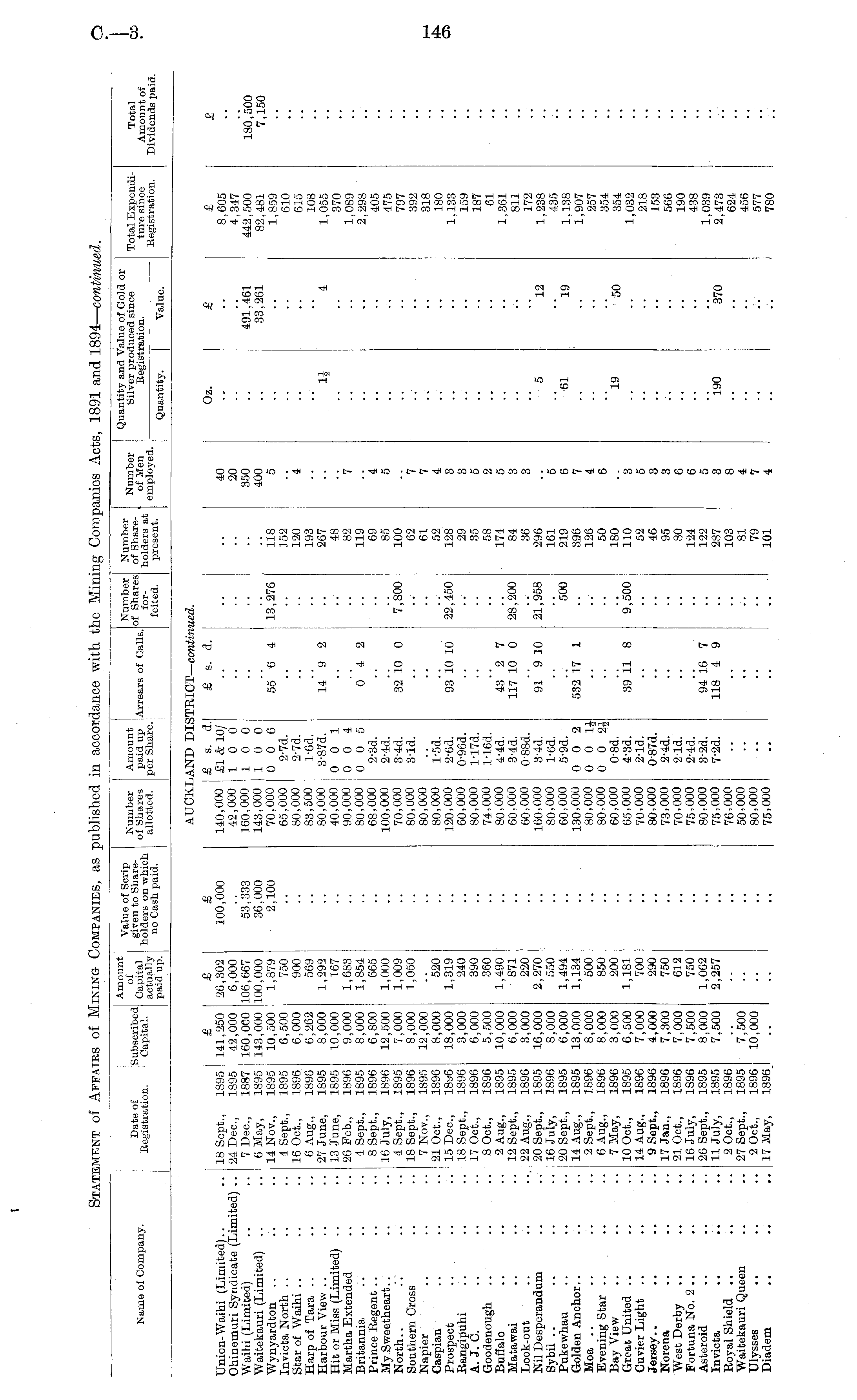 Name of Company. Date of Registration. Amount value of Scrip Number Amount ! Number Number N]lmh »- S C b fl S^ 6d Capital «*SSSS tSd™I-Arrears of Calls. of Shares ofShare- *,™ta Quantity and Value of Gold or Silver produced since Registration. Total Expendi- Total ture since Amount of Registration. Dividends paid. Quantity. Value. AUCKLAND DIS iTRICT— contim ,ed. Union-Waihi (Limited) Ohinemuri Syndicate (Limited) .. Waihi (Limited) Waitekauri (Limited) Wynyardton Invicta North Star of Waihi Harp of Tara Harbour View Hit or Miss (Limited) Martha Extended Britannia Prince Regent My Sweetheart.. North.. Southern Gross Napier Caspian Prospect ... Rangipuhi A. J. C. Goodenough Buffalo Matawai Look-out Nil Desperandum Sybil .. Pukewhau Golden Anchor.. Moa Evening Star Bay View Great United Cuvier Light Jersey.. Norena West Derby Fortuna No. 2 .. Asteroid Invicta Royal Shield Waitekauri Queen Ulysses Diadem 18 Sept., 24 Dec, 7 Dec, 6 May, 14 Nov., 4 Sept., 16 Oct., 6 Aug., 27 June, 13 June, 26 Feb., 4 Sept., 8 Sept., 16 July, 4 Sept., 18 Sept., 7 Nov., 21 Oct., 15 Dec, 18 Sept., 17 Oct., 8 Oct., 2 Aug., 12 Sept., 22 Aug., 20 Sept., 16 July, 20 Sept., 14 Aug., 2 Sept., 6 Aug., 7 May, 10 Oct., 14 Aug., 9 Sept., 17 Jan., 21 Oct., 16 July, 26 Sept., 11 July, 2 Oct., 27 Sept., 2 Oct., 17 May, 1895 1895 1887 1895 1895 1895 1896 1898 1895 1895 1896 1895 1896 1896 1895 1896 1895 1896 18a6 1896 1896 1896 1895 1895 1896 1895 1896 1895 1895 1896 1896 1896 1895 1896 1896 1896 1896 1896 1895 1895 1896 1895 1896 1896 £ 141, 250 42,000 160,000 143,000 10,500 6,500 6,000 6,262 8,000 10,000 9,000 8,000 6,800 12,500 7,000 8,000 12,000 8,000 18,000 3,000 6,000 5,500 10,000 6,000 3,000 16,000 8,000 6,000 13,000 8,000 8,000 3,000 6,500 7,000 4,000 7,300 7,000 7,500 8,000 7,500 £ 26,302 6,000 106,667 100,000 1,879 750 900 569 1,292 167 1,683 1,854 665 1,000 1,009 1,050 520 1,319 240 390 360 1,490 871 220 2,270 550 1,494 1,134 500 850 200 1,181 700 290 750 612 750 1,062 2,257 £ 100,000 53,333 36,000 2,100 I £ s. d. 140,000 '■ £1&10/ 42,000 i 1 0 0 160,000 10 0 143,000 | 1 0 0 70,000 0 0 6 65,000 2-7d. 80,000 2-7d. 83,500 l-6d. 80,000 3-87d. 40,000 0 0 1 90,000 0 0 4 80,000 0 0 5 68,000 2-3d. 100,000 2-4d. 70,000 3-4d. 80,000 3-ld. 80,000 80,000 l-5d. 120,000 2-6d. 60,000 0-96d. 80,000 l-17d. 74,000 l-16d. 80,000 4-4d. 60,000 3-4d. 60,000 0-88d. 160,000 3-4d. 80,000 l-6d. 60,000 5-9d. 130,000 0 0 2 80,000 0 0 lj 80,000 0 0 2J 60,000 0-8d. 65,000 ' 4-3d. 70,000 2-ld. 80,000 0-87d. 73,000 2-4d. 70.000 2-ld. 75,000 2-4d. 80.000 3-2d. 75.000 7-2d. 76.000 j 50.000 80.000 i .. 75.000 i £ s. d. | •• •- •■ 55 6 4 14 9 2 •• 0 4 2 i 32 10 0 ! 93 10 10 43 2 7 117 10 0 13*276 7,800 22*450 118 152 120 193 267 48 82 119 69 85 100 62 61 52 128 29 35 58 174 84 36 296 161 219 396 126 50 180 110 52 46 95 80 124 122 287 103 81 79 101 40 20 350 400 5 "i 7 4 5 7 7 4 3 3 5 2 5 3 3 Oz. 1* £ 491,461 33,261 4 £ 8,605 4,347 442,500 82,481 1,859 610 615 108 1,055 370 1,089 2,298 405 475 797 392 318 180 1,133 159 187 61 1,361 811 172 1,238 435 1,138 1,907 257 354 354 1,032 218 153 566 190 438 1,039 2,473 624 456 577 £ 180*500 7,150 28,200 91 9 10 21*958 5 6 7 4 6 5 12 532 17 1 *500 '•'•61 19 •• •• 39 11 8 9,500 3 5 3 3 6 6 5 3 8 4 7 4 "l9 50 •• 94*16 7 118 4 9 190 370 7,500 10,000 .. - 1 .. I