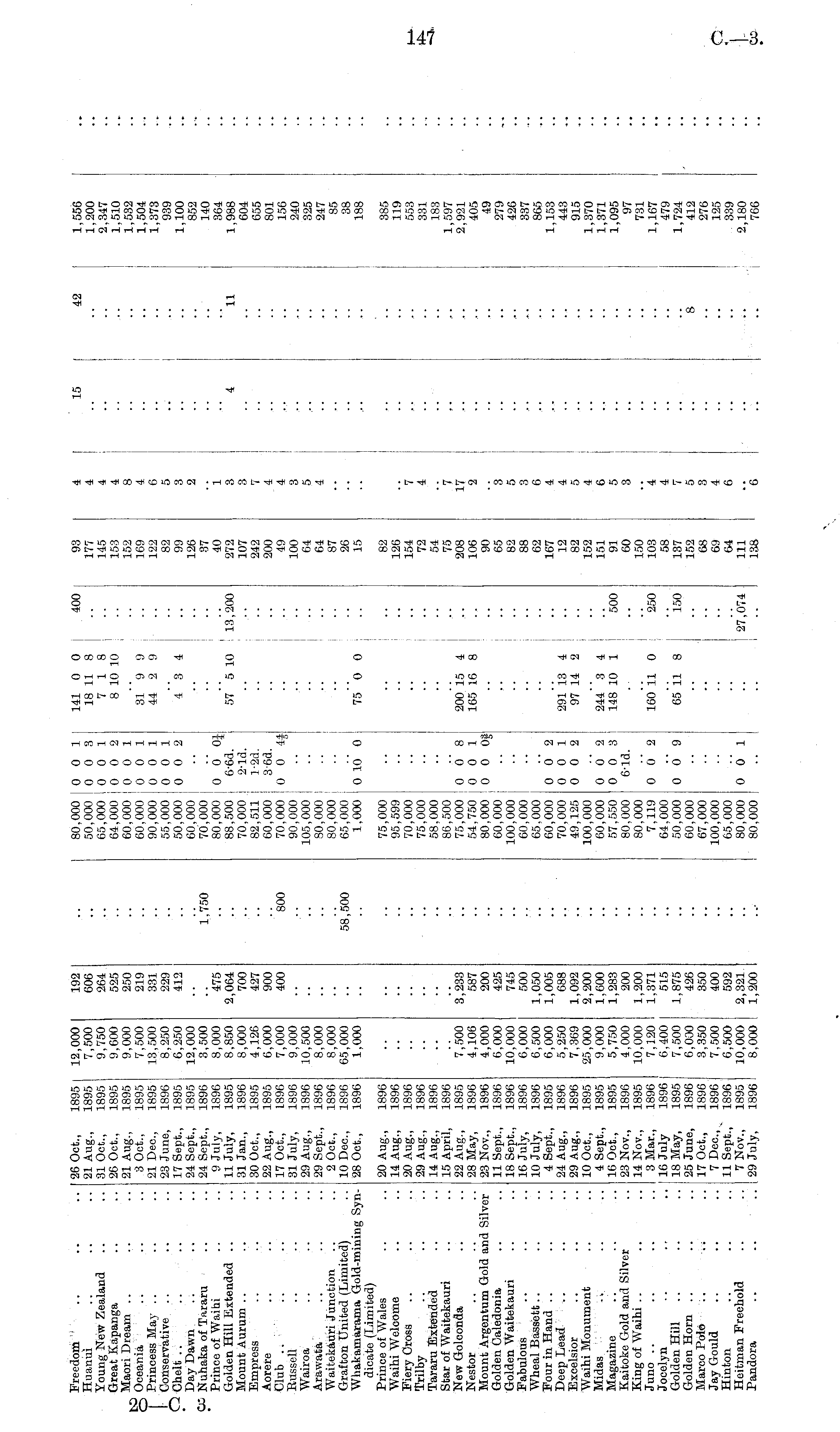 Freedom Huanui Young New Zealand Great Kapanga Maori Dream Oceania Princess May Conservative Chelt Day Dawn Nuhaka of Tararu Prince of Waihi Golden Hill Extended Mount Aurum Empress Aorere Club .. Russell Wairoa Arawata Waitekauri Junction Grafton United (Limited) Whakamarama Gold-mining Syndicate (Limited) Prince of Wales Waihi Welcome Fiery Cross Trilby Tararu Extended Star of Waitekauri New Golconda Nestor Mount Argentum Gold and Silver Golden Caledonia Golden Waitekauri Fabulous Wheal Bassett Four in Hand Deep Lead Excelsior Waihi Monument Midas '.:'''•. ; ;.'i Magazine Kaitoke Gold and Silver King of Waihi Juno Jocelyn Golden Hill .. Golden Horn Marco Polo .. .; Jay Gould Hinton Heitman Freehold Pandora 26 Oct., 1895 21 Aug., 1895 31 Oct., 1895 26 Oct., 1895 21 Aug., 1895 3 Oct., 1895 21 Dec, 1895 23 June, 1896 17 Sept., 1895 24 Sept., 1895 24 Sept., 1896 9 July, 1896 11 July, 1895 31 Jan., 1896 30 Oct., 1895 22 Aug., 1895 17 Oct., 1896 31 July, 1896 29 Aug., 1896 29 Sept., 1896 2 Oct., 1896 10 Dec, 1896 28 Oct., 1896 20 Aug., 1896 14 Aug., 1896 20 Aug., 1896 29 Aug., 1896 14 Aug., 1896 15 April, 1896 22 Aug., 1895 28 May, 1896 23 Nov., 1896 11 Sept., 1896 18 Sept., 1896 16 July, 1896 10 July, 1896 4 Sept., 1895 24 Aug., 1896 29 Aug., 1896 10 Oct., 1895 4 Sept., 1895 16 Oct., 1895 23 Nov., 1896 14 Nov., 1895 3 Mar., 1896 16 July 1896 18 May, 1895 25 June, 1896 17 Oct., 1896 7 Dec, 1896 11 Sept., 1896 7 Nov., 1895 29 July, 1896 12,000 7,500 9,750 9,600 9,000 7,500 13,500 8,250 6,250 12,000 3,500 8,000 8,850 8,000 4,126 6,000 7,000 9,000 10,500 8,000 8,000 65,000 1,000 192 606 264 525 250 219 331 229 412 475 2,064 700 427 900 400 1*750 *800 58,500 80,000 0 0 1 50,000 [ 0 0 3 65,000 0 0 1 64,000 0 0 2 60,000 : 0 0 1 60,000 0 0 1 90,000 0 0 1 55,000 ! 0 0 1 50,000 0 0 2 60,000 ; 70,000 80,000 0 0 OJ 88,500 6-6d. 70,000 2-ld. 82,511 i l-2d. 60,000 3-6d. 70,000 0 0 4# 90,000 105,000 30,000 80,000 65,000 1,000 i 0 10 0 75,000 95,599 70,000 75,000 58,000 86.500 75,000 0 0 8 54,750 0 0 1 80,000 0 0 Of 60,000 100,000 60,000 : 65,000 60,000 0 0 2 70,000 0 0 1 49,125 0 0 2 100,000 60,000 0 0 2; 57,550 0 0 3 i 80,000 6-ld. 80.000 7,119 0 0 2 64,000 50,000 0 0 9 60,000 67,000 100,000 65,000 80,000 0 0 1 80,000 I 141 0 0 400 18 11 8 7 18 8 10 10 31 9 9 44 2 9 4 3 4 57 5 10 I 13,200 V. 75 0 0 .' .. .. .. 93 177 145 153 152 169 122 82 99 126 37 40 272 107 242 200 49 100 64 64 87 26 15 82 126 154 72 54 75 208 106 90 65 82 88 62 167 12 82 152 151 91 60 150 103 58 137 152 68 69 64 111 138 4 4 4 4 8 4 6 5 3 2 1 3 3 7 4 4 3 5 4 7 4 I 15 4 42 "ll 8 "i 1,556 1,200 2,347 1,510 1,532 1,504 1,373 939 1,100 852 140 364 1,988 604 655 801 156 240 325 247 85 38 188 385 119 553 331 183 1,597 2,921 405 49 279 426 337 865 1,153 443 915 1,370 1,371 1,095 97 731 1,167 479 1,724 412 276 125 339 2,180 766 .. 7,500 4,106 4,000 6,000 10,000 6,000 6,500 6,000 5,250 7,369 25,000 9,000 5,750 4,000 10,000 7,120 6,400 7,500 6,000 3,350 7,500 6,500 10,000 8,000 3,233 587 200 425 745 500 1,050 1,005 688 1,092 2,200 1,600 1,283 200 1,200 1,371 515 1,875 426 350 400 592 2,321 1,200 200 15 4 165 16 8 7 17 2 .. 291 13 4 97 14 2 3 5 3 6 4 4 5 4 6 5 3 244 3 4 148 10 1 500 160 11 0 250 4 4 7 5 3 4 6 65 11 8 150 . •• .. 27,074 *6