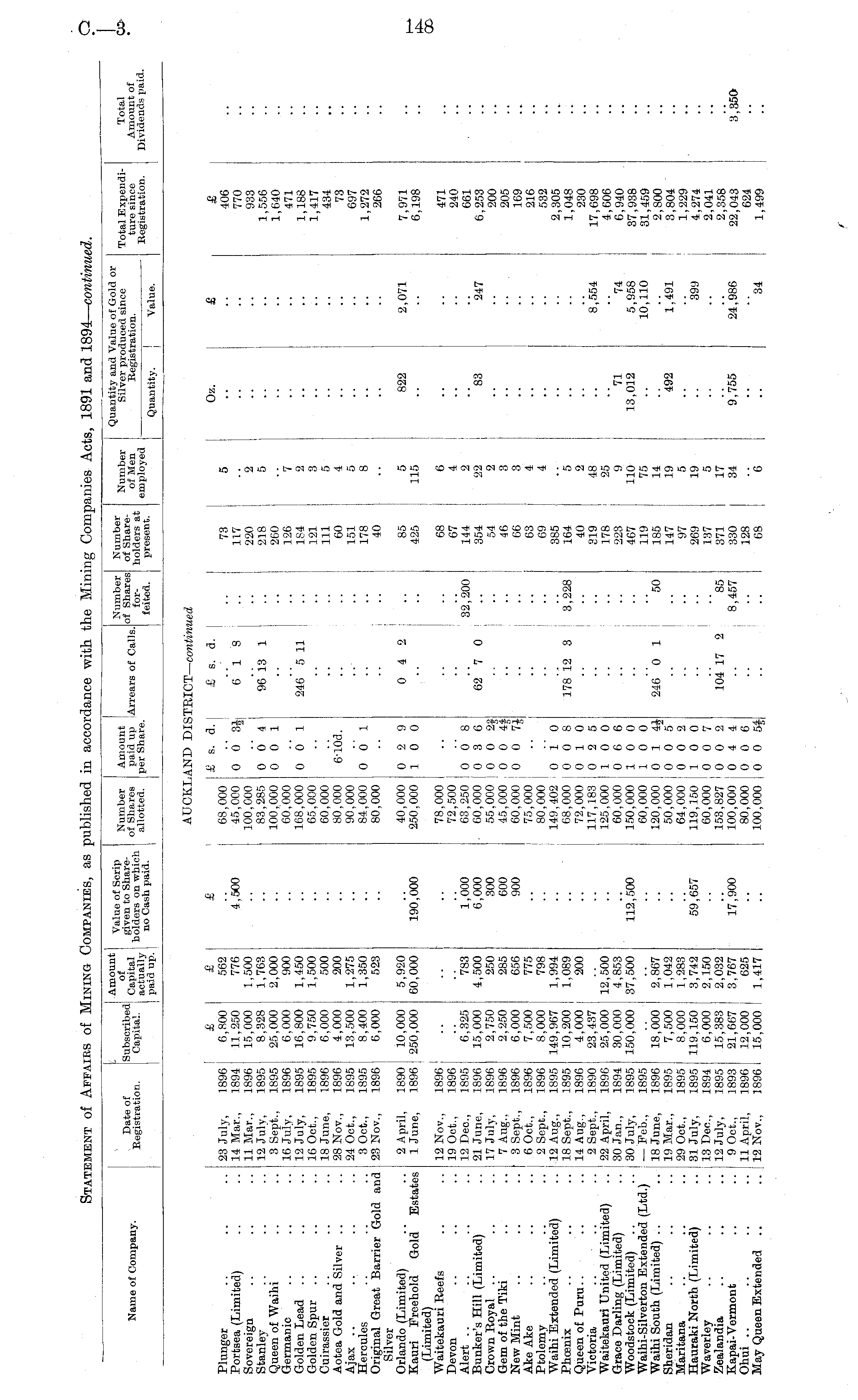 Name of Company. Date of Registration. Amount value of Scrip Nu mber Amount ! Number Number paid up ; no Cash paid. allotted, pel bhaie. letted. present. Number of Men Quantity and Value of Gold or Silver produced since Registration. Total Expendi- Total ture since Amount of Registration. Dividends paid. Quantity. I I Value. AUCK1 .AND DIS ITRICT — continued £ 6,800 11,250 15,000 8,328 25,000 6,000 16,800 9,750 6,000 4,000 13,500 8,400 6,000 £ 562 776 1,500 1,763 2,000 900 1,450 1,500 500 200 1,275 1,350 523 £ 68,000 45,000 100,000 83,285 100,000 60,000 168,000 65,000 60,000 80,000 90,000 84,000 80,000 £ s. d. I £ s. d. 6 18 96 13 1 246 5 11 '.'. 73 117 220 218 260 126 184 121 111 60 151 178 40 Oz. £ £ 406 770 933 1,556 1,640 471 1,188 1,417 434 73 697 1,272 266 Plunger Portsea (Limited) Sovereign Stanley Queen of Waihi Germanic Golden Lead Golden Spur Cuirassier Aotea Gold and Silver Ajax Hercules Original Great Barrier Gold and Silver Orlando (Limited) Kauri Freehold Gold Estates (Limited) Waitekauri Reefs Devon Alert .. Bunker's Hill (Limited) Crown Royal Gem of the Tiki New Mint Ake Ake Ptolemy Waihi Extended (Limited) Phcenix Queen of Puru Victoria Waitekauri United (Limited) Grace Darling (Limited) Woodstock (Limited) Waihi-Silverton Extended (Ltd.) Waihi South (Limited) Sheridan Maritana Hauraki North (Limited) Waverley Zealandia Kapai-Vermont Ohui .. May Queen Extended .. 23 July, 14 Mar., 11 Mar., 12 July, 3 Sept., 16 July, 12 July, 16 Oct., 18 June, 28 Nov., 24 Oct., 3 Oct., 23 Nov., 2 April, 1 June, 12 Nov., 19 Oct.. 12 Dec, 21 June, 17 July, 7 Aug., 3 Sept., 6 Oct., 2 Sept., -12 Aug., 18 Sept., 14 Aug., 2 Sept., 22 April, 30 Jan., 30 July, — Feb., 18 June, 19 Mar., 29 Oct., 31 July, 13 Dec, 12 July, 9 Oct., 11 April, 12 Nov., 1896 1894 1896 1895 1895 1896 1895 1895 1896 1896 1895 1895 1896 1890 1896 1896 1896 1895 1896 1896 1896 1896 1896 1896 1895 1895 1896 1890 1896 1894 1895 1895 1896 1895 1895 1895 1894 1895 1893 1896 1896 10,000 250,000 6,325 15,000 2,750 2,250 6,000 7,500 8,000 149,967 10,200 4,000 23,437 25,000 30,000 150,000 5,920 60,000 783 4,500 250 285 656 775 798 1,994 1,089 200 4,500 190,000 1,000 6,000 300 600 900 40,000 250,000 78,000 72,500 63,250 60,000 55,000 45,000 60,000 75,000 80,000 149,402 68,000 72,000 117,183 125,000 60,000 150,000 60,000 120,000 50,000 64,000 119,150 60,000 153,827 100,000 80,000 100,000 0 0 3J 0 0 4 0 0 1 0 0 1 610d. 0 0 1 0 2 9 10 0 I .. 0 0 8 ; 0 3 6 0 0 2f 0 0 4# 0 0 7j 0 4 2 32*200 62 7 0 178 12 3 3,228 246 0 1 I 50 104 17 2 "85 8,457 85 425 68 67 144 354 54 46 66 63 69 385 164 40 319 178 223 467 119 185 147 97 269 137 371 330 128 68 5 2 5 7 2 3 5 4 5 8 5 115 6 4 2 22 2 3 3 4 4 822 **83 2,071 247 7,971 6,198 471 240 661 6,253 200 205 169 216 532 2,305 1,048 230 17,698 4,606 6,940 37,938 31,459 2,800 3,804 1,229 4,274 2,041 2,358 22,043 624 1,499 •■ I 18,000 7,500 8,000 119,150 6,000 15,383 21,667 12,000 15,000 12,500 4,853 37,500 2,867 1,042 1,283 3,742 2,150 2,032 3,767 625 1,417 112*500 0 10 0 0 8 0 10 0 2 5 1 0 0 0 6 6 10 0 1 0 0 0 1 4J 0 0 5 0 0 2 10 0 0 0 7 0 0 2 0 4 4 0 0 6 0 0 6* 5 2 48 25 9 110 75 14 19 5 19 5 17 34 **71 13,012 *492 9 1755 8*554 74 5,958 10,110 1,491 59*657 399 17*900 24,986 3*350 *6 34