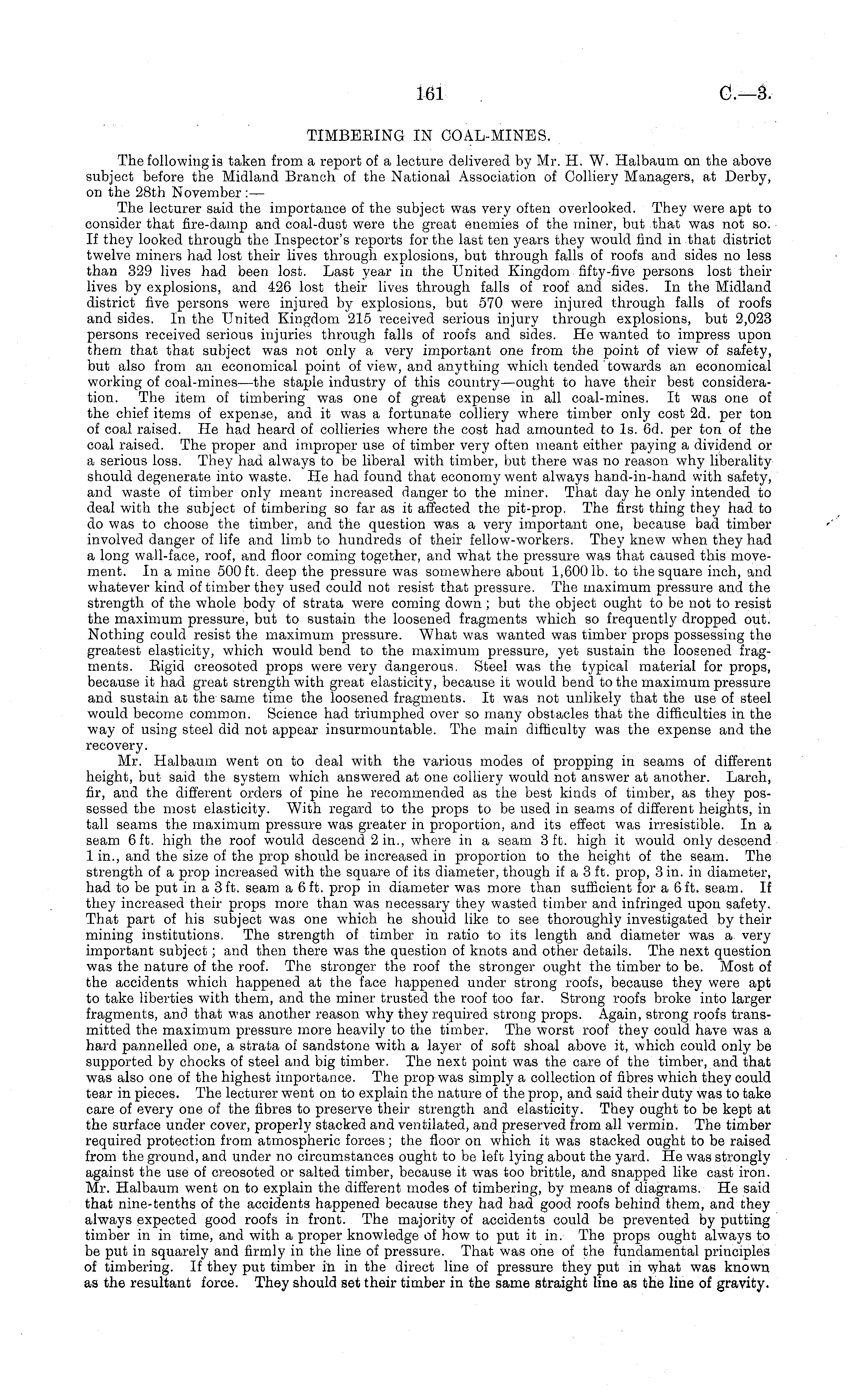 TIMBERING IN COAL-MINES. The following is taken from a report of a lecture delivered by Mr. H. W. Halbaum on the above subject before the Midland Branch of the National Association of Colliery Managers, at Derby, on the 28th November :— The lecturer said the importance of the subject was very often overlooked. They were apt to consider that fire-damp and coal-dust were the great enemies of the miner, but that was not so. If they looked through the Inspector's reports for the last ten years they would find in that district twelve miners had lost their lives through explosions, but through falls of roofs and sides no less than 329 lives had been lost. Last year in the United Kingdom fifty-five persons lost their lives by explosions, and 426 lost their lives through falls of roof and sides. In the Midland district five persons were injured by explosions, but 570 were injured through falls of roofs and sides. In the United Kingdom 215 received serious injury through explosions, but 2,023 persons received serious injuries through falls of roofs and sides. He wanted to impress upon them that that subject was not only a very important one from the point of view of safety, but also from an economical point of view, and anything which tended ' towards an economical working of coal-mines —the staple industry of this country—ought to have their best consideration. The item of timbering was one of great expense in all coal-mines. It was one of the chief items of expense, and it was a fortunate colliery where timber only cost 2d. per ton of coal raised. He had heard of collieries where the cost had amounted to Is. 6d. per ton of the coal raised. The proper and improper use of timber very often meant either paying a dividend or a serious loss. They had always to be liberal with timber, but there was no reason why liberality should degenerate into waste. He had found that economy went always hand-in-hand with safety, and waste of timber only meant increased danger to the miner. That day he only intended to deal with the subject of timbering so far as it affected the pit-prop. The first thing they had to do was to choose the timber, and the question was a very important one, because bad timber involved danger of life and limb to hundreds of their fellow-workers. They knew when they had a long wall-face, roof, and floor coming together, and what the pressure was that caused this movement. In a mine 500 ft. deep the pressure was somewhere about 1,6001b. to the square inch, and whatever kind of timber they used could not resist that pressure. The maximum pressure and the strength of the whole body of strata were coming down; but the object ought to be not to resist the maximum pressure, but to sustain the loosened fragments which so frequently dropped out. Nothing could resist the maximum pressure. What was wanted was timber props possessing the greatest elasticity, which would bend to the maximum pressure, yet sustain the loosened fragments. Rigid creosoted props were very dangerous. Steel was the typical material for props, because it had great strength with great elasticity, because it would bend to the maximum pressure and sustain at the same time the loosened fragments. It was not unlikely that the use of steel would become common. Science had triumphed over so many obstacles that the difficulties in the way of using steel did not appear insurmountable. The main difficulty was the expense and the recovery. Mr. Halbaum went on to deal with the various modes of propping in seams of different height, but said the system which answered at one colliery would not answer at another. Larch, fir, and the different orders of pine he recommended as the best kinds of timber, as they possessed the most elasticity. With regard to the props to be used in seams of different heights, in tall seams the maximum pressure was greater in proportion, and its effect was irresistible. In a seam 6 ft. high the roof would descend 2 in., where in a seam 3 ft. high it would only descend 1 in., and the size of the prop should be increased in proportion to the height of the seam. The strength of a prop increased with the square of its diameter, though if a 3 ft. prop, 3 in. in diameter, had to be put in a 3 ft. seam a 6 ft. prop in diameter was more than sufficient for a 6ft. seam. If they increased their props more than was necessary they wasted timber and infringed upon safety. That part of his subject was one which he should like to see thoroughly investigated by their mining institutions. The strength of timber in ratio to its length and diameter was a very important subject; and then there was the question of knots and other details. The next question was the nature of the roof. The stronger the roof the stronger ought the timber to be. Most of the accidents which happened at the face happened under strong roofs, because they were apt to take liberties with them, and the miner trusted the roof too far. Strong roofs broke into larger fragments, and that was another reason why they required strong props. Again, strong roofs transmitted the maximum pressure more heavily to the timber. The worst roof they could have was a hard pannelled one, a strata of sandstone with a layer of soft shoal above it, which could only be supported by chocks of steel and big timber. The next point was the care of the timber, and that was also one of the highest importance. The prop was simply a collection of fibres which they could tear in pieces. The lecturer went on. to explain the nature of the prop, and said their duty was to take care of every one of the fibres to preserve their strength and elasticity. They ought to be kept at the surface under cover, properly stacked and ventilated, and preserved from all vermin. The timber required protection from atmospheric forces; the floor on which it was stacked ought to be raised from the ground, and under no circumstances ought to be left lying about the yard. He was strongly against the use of c