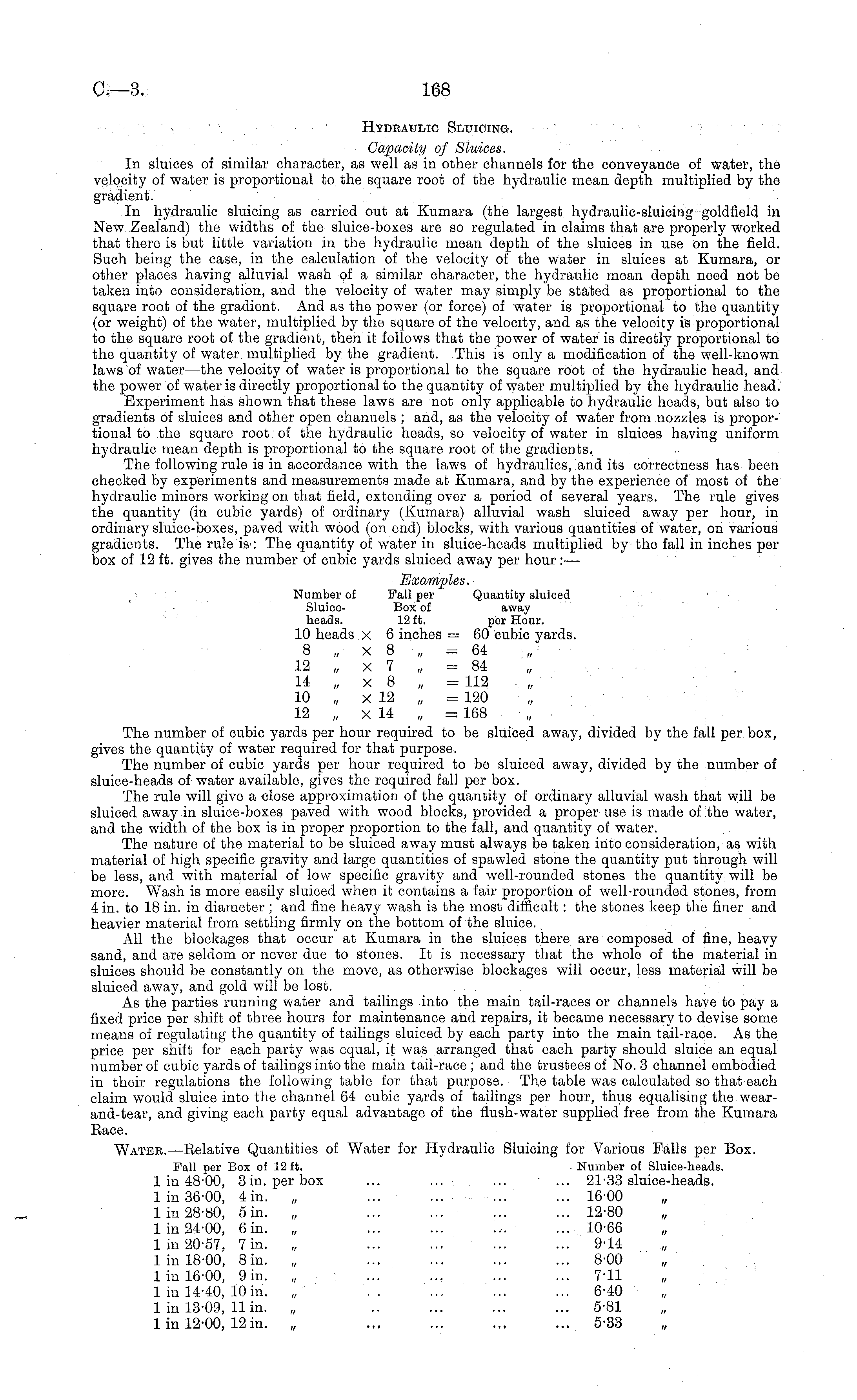 Hydraulic Sluicing. Capacity of Sluices. In sluices of similar character, as well as in other channels for the conveyance of water, the velocity of water is proportional to the square root of the hydraulic mean depth multiplied by the gradient. In hydraulic sluicing as carried out at Kumara (the largest hydraulic-sluicing goldfield in New Zealand) the widths of the sluice-boxes are so regulated in claims that are properly Worked that there is hut little variation in the hydraulic mean depth of the sluices in use on the field. Such being the case, in the calculation of the velocity of the water in sluices at Kumara, or other places having alluvial wash of a similar character, the hydraulic mean depth need not be taken into consideration, and the velocity of water may simply be stated as proportional to the square root of the gradient. And as the power (or force) of water is proportional to the quantity (or weight) of the water, multiplied by the square of the velocity, and as the velocity is proportional to the square root of the gradient, then it follows that the power of water is directly proportional to the quantity of water, multiplied by the gradient. This is only a modification of the well-known laws of water —the velocity of water is proportional to the square root of the hydraulic head, and the power of water is directly proportional to the quantity of water multiplied by the hydraulic head. Experiment has shown that these laws are not only applicable to hydraulic heads, but also to gradients of sluices and other open channels ; and, as the velocity of water from nozzles is proportional to the square root of the hydraulic heads, so velocity of water in sluices having uniform hydraulic mean depth is proportional to the square root of the gradients. The following rule is in accordance with the laws of hydraulics, and its correctness has been checked by experiments and measurements made at Kumara, and by the experience of most of the hydraulic miners working on that field, extending over a period of several years. The rule gives the quantity (in cubic yards) of ordinary (Kumara) alluvial wash sluiced away per hour, in ordinary sluice-boxes, paved with wood (on end) blocks, with various quantities of water, on various gradients. The rule is: The quantity of water in sluice-heads multiplied by the fall in inches per box of 12 ft. gives the number of cubic yards sluiced away per hour: — Examples. _ > Number of Fall per Quantity sluiced Sluice- Box of away heads. 12 ft. per Hour. 10 heads x 6 inches = 60 cubic yards. 8 „ x 8 „ = 64 12 „ X 7 „ = 84 14 „ x 8 „ = 112 10 „ xl 2 „ = 120 12 „ xl 4 „ = 168 The number of cubic yards per hour required to be sluiced away, divided by the fall per box, gives the quantity of water required for that purpose. The number of cubic yards per hour required to be sluiced away, divided by the number of sluice-heads of water available, gives the required fall per box. The rule will give a close approximation of the quantity of ordinary alluvial wash that will be sluiced away in sluice-boxes paved with wood blocks, provided a proper use is made of the water, and the width of the box is in proper proportion to the fall, and quantity of water. The nature of the material to be sluiced away must always be taken into consideration, as with material of high specific gravity and large quantities of spawled stone the quantity put through will be less, and with material of low specific gravity and well-rounded stones the quantity will be more. Wash is more easily sluiced when it contains a fair proportion of well-rounded stones, from 4 in. to 18 in. in diameter ; and fine heavy wash is the most difficult: the stones keep the finer and heavier material from settling firmly on the bottom of the sluice. All the blockages that occur at Kumara in the sluices there are composed of fine, heavy sand, and are seldom or never due to stones. It is necessary that the whole of the material in sluices should be constantly on the move, as otherwise blockages will occur, less material will be sluiced away, and gold will be lost. As the parties running water and tailings into the main tail-races or channels have to pay a fixed price per shift of three hours for maintenance and repairs, it became necessary to devise some means of regulating the quantity of tailings sluiced by each party into the main tail-race. As the price per shift for each party was equal, it was arranged that each party should sluice an equal number of cubic yards of tailings into the main tail-race ; and the trustees of No. 3 channel embodied in their regulations the following table for that purpose. The table was calculated so that each claim would sluice into the channel 64 cubic yards of tailings per hour, thus equalising the wear-and-tear, and giving each party equal advantage of the flush-water supplied free from the Kumara Race. Water. —Relative Quantities of Water for Hydraulic Sluicing for Various Palls per Box. Fall per Box of 12 ft. ■ Number of Sluice-heads. lin 48-00, 3in. per box ... ... ... ... 21-33 sluice-heads. lin 36-00, 4 in. „ ... ... ... ... 16-00 lin 28-80, 5 in. „ ... ... ... ... 12-80 lin 24-00, 6 in. „ ... ... ... ... 10-66 lin 20-57, 7 in. „ ... ... ... ... 9-14 lin 18-00, 8 in. „ ... ... ... ... 8-00 lin 16-00, 9 in. „ ... ... ... ... 7'll lin 14-40, 10 in. „ . . ... ... ... 6-40 lin 13-09, 11 in. „ .. ... ... ... 5-81 lin 12-00, 12 in. „ 5-33
