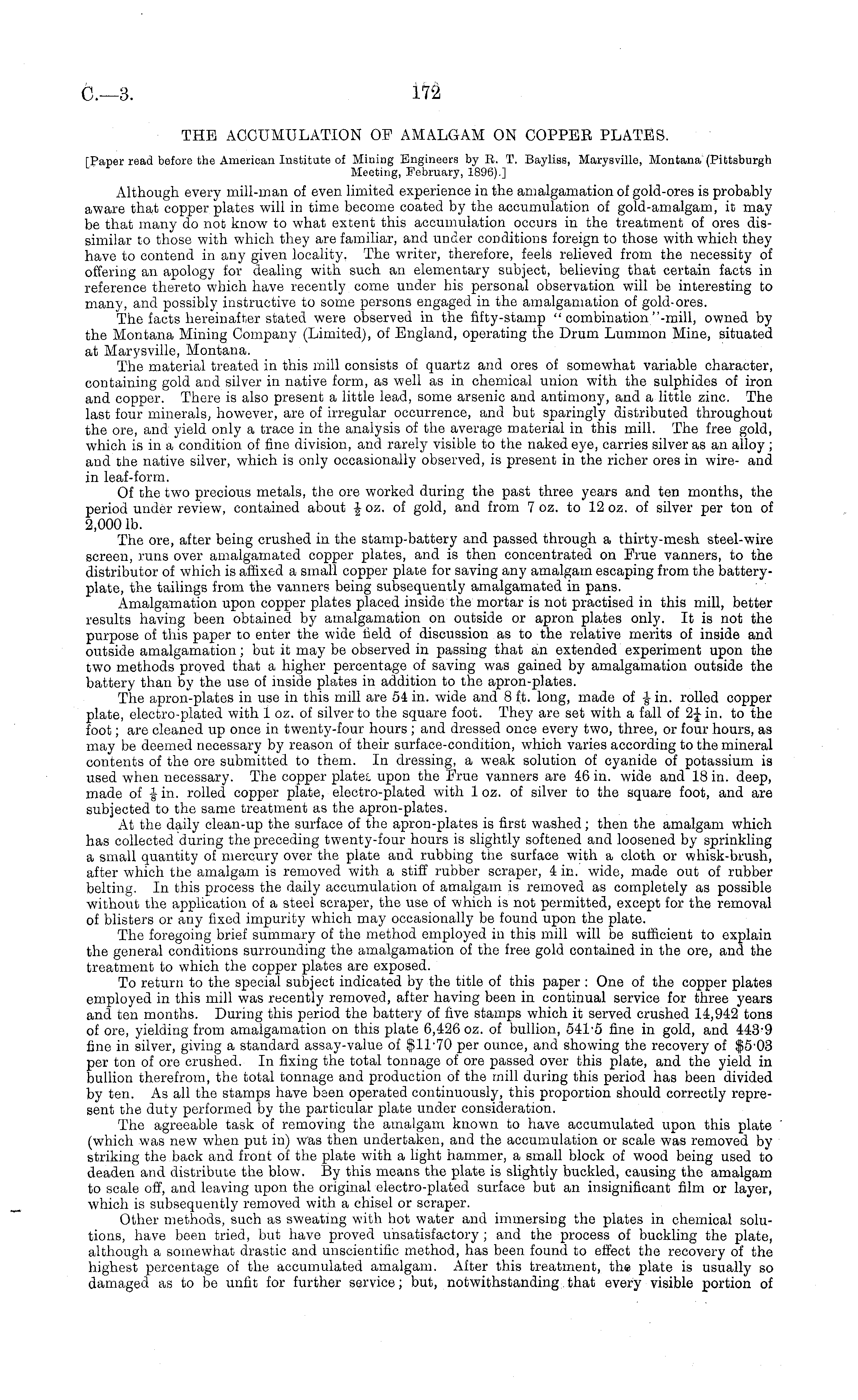 THE ACCUMULATION OF AMALGAM ON COPPER PLATES. [Paper read before the American Institute of Mining Engineers by R. T. Bayliss, Marysville, Montana (Pittsburgh Meeting, February, 1896).] Although every mill-man of even limited experience in the amalgamation of gold-ores is probably aware that copper plates will in time become coated by the accumulation of gold-amalgam, it may be that many do not know to what extent this accumulation occurs in the treatment of ores dissimilar to those with which they are familiar, and under conditions foreign to those with which they have to contend in any given locality. The writer, therefore, feels relieved from the necessity of offering an apology for dealing with such an elementary subject, believing that certain facts in reference thereto which have recently come under his personal observation will be interesting to many, and possibly instructive to some persons engaged in the amalgamation of gold-ores. The facts hereinafter stated were observed in the fifty-stamp " combination "-mill, owned by the Montana Mining Company (Limited), of England, operating the Drum Lummon Mine, situated at Marysville, Montana. The material treated in this mill consists of quartz and ores of somewhat variable character, containing gold and silver in native form, as well as in chemical union with the sulphides of iron and copper. There is also present a little lead, some arsenic and antimony, and a little zinc. The last four minerals, however, are of irregular occurrence, and but sparingly distributed throughout the ore, and yield only a trace in the analysis of the average material in this mill. The free gold, which is in a "condition of fine division, and rarely visible to the naked eye, carries silver as an alloy ; and the native silver, which is only occasionally observed, is present in the richer ores in wire- and in leaf-form. Of the two precious metals, the ore worked during the past three years and ten months, the period under review, contained about -J- oz. of gold, and from 7 oz. to 12 oz. of silver per ton of 2,000 lb. The ore, after being crushed in the stamp-battery and passed through a thirty-mesh steel-wire screen, runs over amalgamated copper plates, and is then concentrated on Frue vanners, to the distributor of which is affixed a small copper plate for saving any amalgam escaping from the batteryplate, the tailings from the vanners being subsequently amalgamated in pans. Amalgamation upon copper plates placed inside the mortar is not practised in this mill, better results having been obtained by amalgamation on outside or apron plates only. It is not the purpose of this paper to enter the wide field of discussion as to the relative merits of inside and outside amalgamation; but it may be observed in passing that an extended experiment upon the two methods proved that a higher percentage of saving was gained by amalgamation outside the battery than by the use of inside plates in addition to the apron-plates. The apron-plates in use in this mill are 54 in. wide and 8 ft. long, made of •§• in. rolled copper plate, electro-plated with 1 oz. of silver to the square foot. They are set with a fall of 2Jin. to the foot; are cleaned up once in twenty-four hours ; and dressed once every two, three, or four hours, as may be deemed necessary by reason of their surface-condition, which varies according to the mineral contents of the ore submitted to them. In dressing, a weak solution of cyanide of potassium is used when necessary. The copper platen upon the Frue vanners are 46 in. wide and 18 in. deep, made of in. rolled copper plate, electro-plated with 1 oz. of silver to the square foot, and are subjected to the same treatment as the apron-plates. At the daily clean-up the surface of the apron-plates is first washed ; then the amalgam which has collected during the preceding twenty-four hours is slightly softened and loosened by sprinkling a small quantity of mercury over the plate and rubbing the surface with a cloth or whisk-brush, after which the amalgam is removed with a stiff rubber scraper, 4 in. wide, made out of rubber belting. In this process the daily accumulation of amalgam is removed as completely as possible without the application of a steel scraper, the use of which is not permitted, except for the removal of blisters or any fixed impurity which may occasionally be found upon the plate. The foregoing brief summary of the method employed in this mill will be sufficient to explain the general conditions surrounding the amalgamation of the free gold contained in the ore, and the treatment to which the copper plates are exposed. To return to the special subject indicated by the title of this paper : One of the copper plates employed in this mill was recently removed, after having been in continual service for three years and ten months. During this period the battery of five stamps which it served crushed 14,942 tons of ore, yielding from amalgamation on this plate 6,426 oz. of bullion, 541-5 fine in gold, and 443-9 fine in silver, giving a standard assay-value of $11-70 per ounce, and showing the recovery of $5-03 per ton of ore crushed. In fixing the total tonnage of ore passed over this plate, and the yield in bullion therefrom, the total tonnage and production of the mill during this period has been divided by ten. As all the stamps have been operated continuously, this proportion should correctly represent the duty performed by the particular plate under consideration. The agreeable task of removing the amalgam known to have accumulated upon this plate (which was new when put in) was then undertaken, and the accumulation or scale was removed by striking the back and front of the plate with a light hammer, a small block of wood being used to deaden and distribute the blow. By this means the plate is slightly buckled, causing the amalgam to scale off, and leaving upon the original electro-plated surface but an insignificant film or layer, which is 