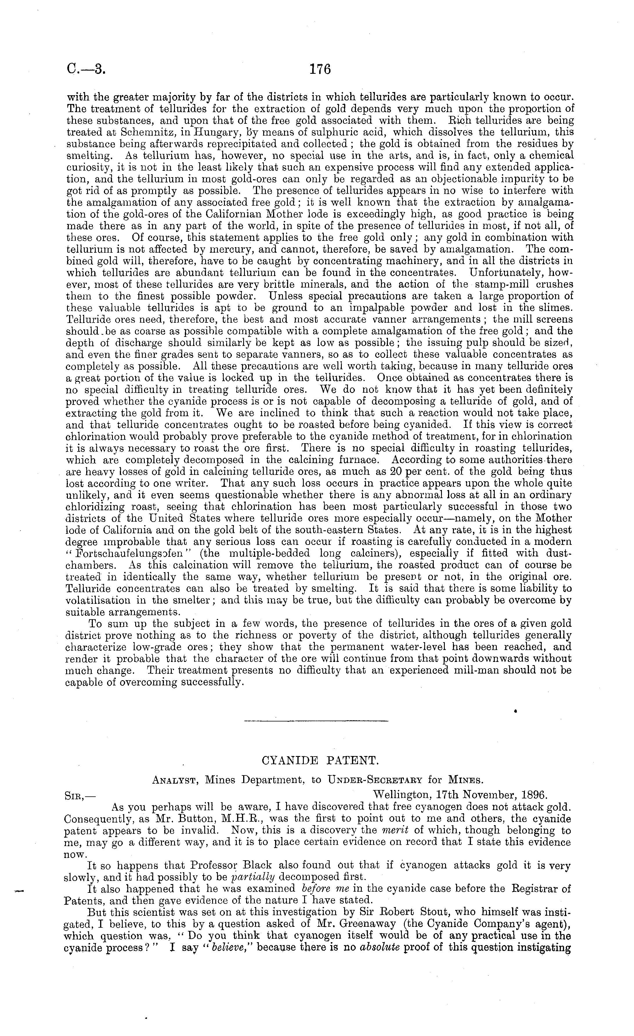 CYANIDE PATENT. Analyst, Mines Department, to Under-Secretary for Mines. Sir,— Wellington, 17th November, 1896. As you perhaps will be aware, I have discovered that free cyanogen does not attack gold. Consequently, as Mr. Button, M.H.R., was the first to point out to me and others, the cyanide patent appears to be invalid. Now, this is a discovery the merit of which, though belonging to me, may go a different way, and it is to place certain evidence on record that I state this evidence now. It so happens that Professor Black also found out that if cyanogen attacks gold it is very slowly, and it had possibly to be partially decomposed first. It also happened that he was examined before me in the cyanide case before the Registrar of Patents, and then gave evidence of the nature I have stated. But this scientist was set on at this investigation by Sir Robert Stout, who himself was instigated, I believe, to this by a question asked of Mr. Greenaway (the Cyanide Company's agent), which question was, " Do you think that cyanogen itself would be of any practical use in the cyanide process? " I say " believe," because there is no absolute proof of this question instigating