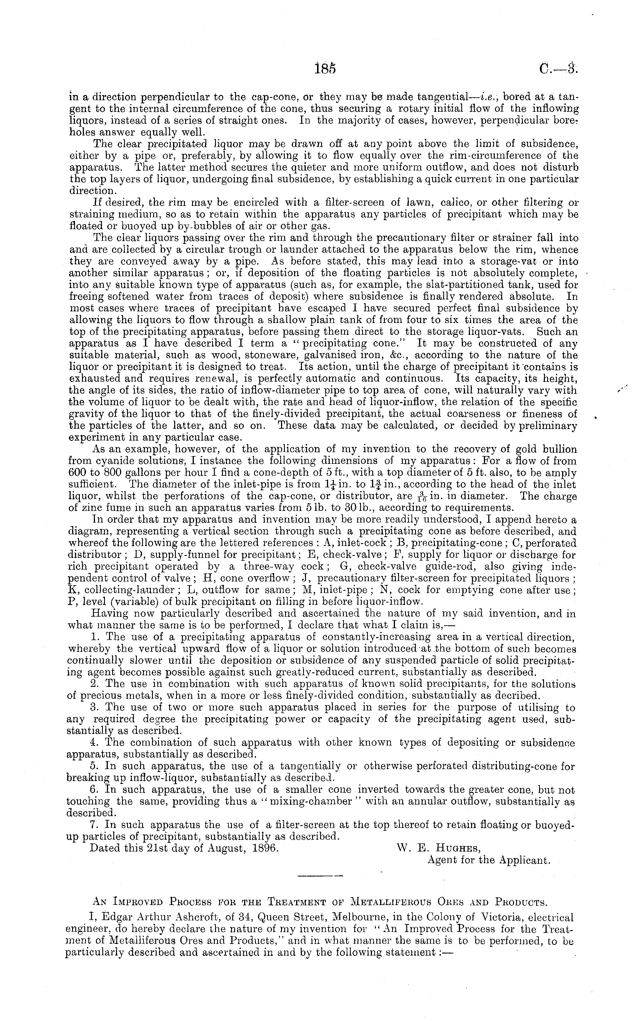 in a direction perpendicular to the cap-cone, or they may be made tangential— i.e., bored at a tangent to the internal circumference of the cone, thus securing a rotary initial flow of the inflowing liquors, instead of a series of straight ones. In the majority of cases, however, perpendicular boreholes answer equally well. The clear precipitated liquor may be drawn off at any point above the limit of subsidence, either by a pipe or, preferably, by allowing it to flow equally over the rim-circumference of the apparatus. The latter method secures the quieter and more uniform outflow, and does not disturb the top layers of liquor, undergoing final subsidence, by establishing a quick current in one particular direction. If desired, the rim may be encircled with a filter-screen of lawn, calico, or other filtering or straining medium, so as to retain within the apparatus any particles of precipitant which may be floated or buoyed up by-bubbles of air or other gas. The clear liquors passing over the rim and through the precautionary filter or strainer fall into and are collected by a circular trough or launder attached to the apparatus below the rim, whence they are conveyed away by a pipe. As before stated, this may lead into a storage-vat or into another similar apparatus ; or, if deposition of the floating particles is not absolutely complete, into any suitable known type of apparatus (such as, for example, the slat-partitioned tank, used for freeing softened water from traces of deposit) where subsidence is finally rendered absolute. In most cases where traces of precipitant have escaped I have secured perfect final subsidence by allowing the liquors to flow through a shallow plain tank of from four to six times the area of the top of the precipitating apparatus, before passing them direct to the storage liquor-vats. Such an apparatus as I have described I term a " precipitating cone." It may be constructed of any suitable material, such as wood, stoneware, galvanised iron, &c, according to the nature of the liquor or precipitant it is designed to treat. Its action, until the charge of precipitant it contains is exhausted and requires renewal, is perfectly automatic and continuous. Its capacity, its height, the angle of its sides, the ratio of inflow-diameter pipe to top area of cone, will naturally vary with the volume of liquor to be dealt with, the rate and head of liquor-inflow, the relation of the specific gravity of the liquor to that of the finely-divided precipitant, the actual coarseness or fineness of the particles of the latter, and so on. These data maybe calculated, or decided by preliminary experiment in any particular case. As an example, however, of the application of my invention to the recovery of gold bullion from cyanide solutions, I instance the following dimensions of my apparatus : For a flow of from 600 to 800 gallons per hour I find a cone-depth of 5 ft., with a top diameter of 5 ft. also, to be amply sufficient. The diameter of the inlet-pipe is from 1-J-in. to If in., according to the head of the inlet liquor, whilst the perforations of the cap-cone, or distributor, are rVin. in diameter. The charge of zinc fume in such an apparatus varies from 51b. to 301b., according to requirements. In order that my apparatus and invention may be more readily understood, I append hereto a diagram, representing a vertical section through such a precipitating cone as before described, and whereof the following are the lettered references : A, inlet-cock ; B, precipitating-cone ; C, perforated distributor ;D, supply-funnel for precipitant; E, check-valve ;F, supply for liquor or discbarge for rich precipitant operated by a three-way cock; G, check-valve guide-rod, also giving independent control of valve ; H, cone overflow ; J, precautionary filter-screen for precipitated liquors ; X, collecting-launder ; L, outflow for same; M, inlet-pipe; N, cock for emptying cone after use; P, level (variable) of bulk precipitant on filling in before liquor-inflow. Having now particularly described and ascertained the nature of my said invention, and in what manner the same is to be performed, I declare that what I claim is,— 1. The use of a precipitating apparatus of constantly-increasing area in a vertical direction, whereby the vertical upward flow of a liquor or solution introduced at the bottom of such becomes continually slower until the deposition or subsidence of any suspended particle of solid precipitating agent becomes possible against such greatly-reduced current, substantially as described. 2. The use in combination with such apparatus of known solid precipitants, for the solutions of precious metals, when in a more or less finely-divided condition, substantially as decribed. 3. The use of two or more such apparatus placed in series for the purpose of utilising to any required degree the precipitating power or capacity of the precipitating agent used, substantially as described. 4. The combination of such apparatus with other known types of depositing or subsidence apparatus, substantially as described. 5. In such apparatus, the use of a tangentially or otherwise perforated distributing-cone for breaking up inflow-liquor, substantially as described. 6. In such apparatus, the use of a smaller cone inverted towards the greater cone, but not touching the same, providing thus a "mixing-chamber " with an annular outflow, substantially as described. 7. In such apparatus the use of a filter-screen at the top thereof to retain floating or buoyed - up particles of precipitant, substantially as described. Dated this 21st day of August, 1896. W. E. Hughes, Agent for the Applicant.