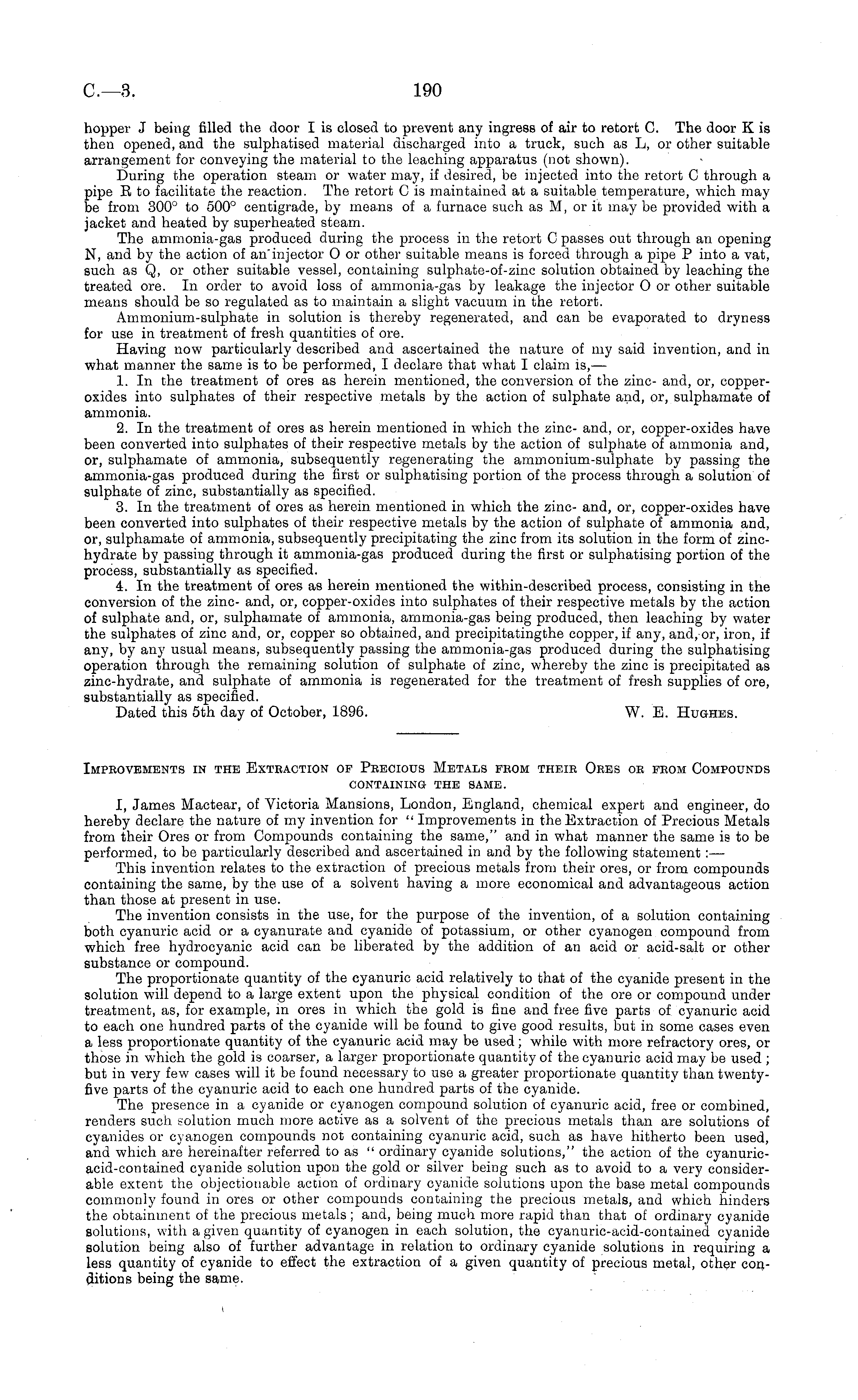 Improvements in the Extraction of Precious Metals prom their Ores or prom Compounds containing the same. I, James Mactear, of Victoria Mansions, London, England, chemical expert and engineer, do hereby declare the nature of my invention for " Improvements in the Extraction of Precious Metals from their Ores or from Compounds containing the same," and in what manner the same is to be performed, to be particularly described and ascertained in and by the following statement : — This invention relates to the extraction of precious metals from their ores, or from compounds containing the same, by the use of a solvent having a more economical and advantageous action than those at present in use. The invention consists in the use, for the purpose of the invention, of a solution containing both cyanuric acid or a cyanurate and cyanide of potassium, or other cyanogen compound from which free hydrocyanic acid can be liberated by the addition of an acid or acid-salt or other substance or compound. The proportionate quantity of the cyanuric acid relatively to that of the cyanide present in the solution will depend to a large extent upon the physical condition of the ore or compound under treatment, as, for example, in ores in which the gold is fine and free five parts of cyanuric acid to each one hundred parts of the cyanide will be found to give good results, but in some cases even a less proportionate quantity of the cyanuric acid may be used; while with more refractory ores, or those in which the gold is coarser, a larger proportionate quantity of the cyanuric acid may be used ; but in very few cases will it be found necessary to use a greater proportionate quantity than twentyfive parts of the cyanuric acid to each one hundred parts of the cyanide. The presence in a cyanide or cyanogen compound solution of cyanuric acid, free or combined, renders such solution much more active as a solvent of the precious metals than are solutions of cyanides or cyanogen compounds not containing cyanuric acid, such as have hitherto been used, and which are hereinafter referred to as " ordinary cyanide solutions," the action of the cyanuric-acid-contained cyanide solution upon the gold or silver being such as to avoid to a very considerable extent the objectionable action of ordinary cyanide solutions upon the base metal compounds commonly found in ores or other compounds containing the precious metals, and which hinders the obtainment of the precious metals; and, being much more rapid than that of ordinary cyanide solutions, with a given quantity of cyanogen in each solution, the cyanuric-acid-contained cyanide solution being also of further advantage in relation to ordinary cyanide solutions in requiring a less quantity of cyanide to effect the extraction of a given quantity of precious metal, other conditions being the same.