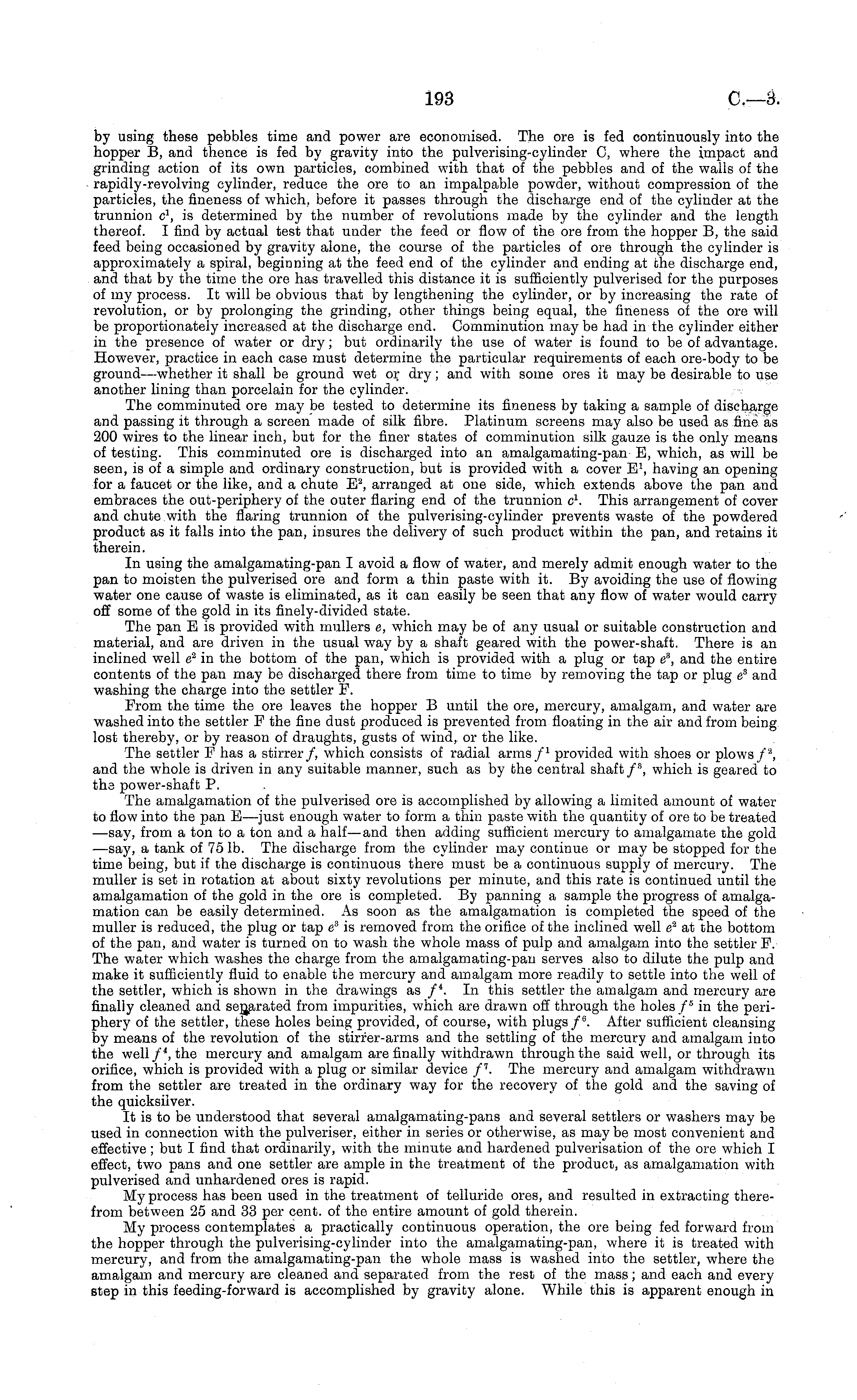 by using these pebbles time and power are economised. The ore is fed continuously into the hopper B, and thence is fed by gravity into the pulverising-cylinder C, where the impact and grinding action of its own particles, combined with that of the pebbles and of the walls of the rapidly-revolving cylinder, reduce the ore to an impalpable powder, without compression of the particles, the fineness of which, before it passes through the discharge end of the cylinder at the trunnion c l , is determined by the number of revolutions made by the cylinder and the length thereof. I find by actual test that under the feed or flow of the ore from the hopper B, the said feed being occasioned by gravity alone, the course of the particles of ore through the cylinder is approximately a spiral, beginning at the feed end of the cylinder and ending at the discharge end, and that by the time the ore has travelled this distance it is sufficiently pulverised for the purposes of my process. It will be obvious that by lengthening the cylinder, or by increasing the rate of revolution, or by prolonging the grinding, other things being equal, the fineness of the ore will be proportionately increased at the discharge end. Comminution maybe had in the cylinder either in the presence of water or dry; but ordinarily the use of water is found to be of advantage. However, practice in each case must determine the particular requirements of each ore-body to be ground—whether it shall be ground wet or dry; and with some ores it may be desirable to use another lining than porcelain for the cylinder. The comminuted ore may be tested to determine its fineness by taking a sample of discharge and passing it through a screen made of silk fibre. Platinum screens may also be used as fine as 200 wires to the linear inch, but for the finer states of comminution silk gauze is the only means of testing. This comminuted ore is discharged into an amalgamating-pan E, which, as will be seen, is of a simple and ordinary construction, but is provided with a cover E l , having an opening for a faucet or the like, and a chute E 2 , arranged at one side, which extends above the pan and embraces the out-periphery of the outer flaring end of the trunnion c l . This arrangement of cover and chute with the flaring trunnion of the pulverising-cylinder prevents waste of the powdered product as it falls into the pan, insures the delivery of such product within the pan, and retains it therein. In using the amalgamating-pan I avoid a flow of water, and merely admit enough water to the pan to moisten the pulverised ore and form a thin paste with it. By avoiding the use of flowing water one cause of waste is eliminated, as it can easily be seen that any flow of water would carry off some of the gold in its finely-divided state. The pan E is provided with mullers c, which may be of any usual or suitable construction and material, and are driven in the usual way by a shaft geared with the power-shaft. There is an inclined well e 2 in the bottom of the pan, which is provided with a plug or tap e s , and the entire contents of the pan may be discharged there from time to time by removing the tap or plug e s and washing the charge into the settler F. From the time the ore leaves the hopper B until the ore, mercury, amalgam, and water are washed into the settler F the fine dust produced is prevented from floating in the air and from being lost thereby, or by reason of draughts, gusts of wind, or the like. The settler F has a stirrer/, which consists of radial arms/ 1 provided with shoes or plows/ 2 , and the whole is driven in any suitable manner, such as by the central shaft/ 8 , which is geared to the power-shaft P. The amalgamation of the pulverised ore is accomplished by allowing a limited amount of water to flow into the pan E—just enough water to form a thin paste with the quantity of ore to be treated —say, from a ton to a ton and a half—and then adding sufficient mercury to amalgamate the gold —say, a tank of 75 lb. The discharge from the cylinder may continue or may be stopped for the time being, but if the discharge is continuous there must be a continuous supply of mercury. The muller is set in rotation at about sixty revolutions per minute, and this rate is continued until the amalgamation of the gold in the ore is completed. By panning a sample the progress of amalgamation can be easily determined. As soon as the amalgamation is completed the speed of the muller is reduced, the plug or tap e s is removed from the orifice of the inclined well e 2 at the bottom of the pan, and water is turned on to wash the whole mass of pulp and amalgam into the settler F. The water which washes the charge from the amalgamating-pan serves also to dilute the pulp and make it sufficiently fluid to enable the mercury and amalgam more readily to settle into the well of the settler, which is shown in the drawings as f i . In this settler the amalgam and mercury are finally cleaned and separated from impurities, which are drawn off through the holes/ 5 in the periphery of the settler, these holes being provided, of course, with plugs/ 6 . After sufficient cleansing by means of the revolution of the stirfer-arms and the settling of the mercury and amalgam into the well/ 4 , the mercury and amalgam are finally withdrawn through the said well, or through its orifice, which is provided with a plug or similar device f 7 . The mercury and amalgam withdrawn from the settler are treated in the ordinary way for the recovery of the gold and the saving of the quicksilver. It is to be understood that several amalgamating-pans and several settlers or washers may be used in connection with the pulveriser, either in series or otherwise, as may be most convenient and effective; but I find that ordinarily, with the minute and hardened pulverisation of the ore which I effect, two pans and one settler are ample in the treatment of the product, as amalgamation with pulverised and
