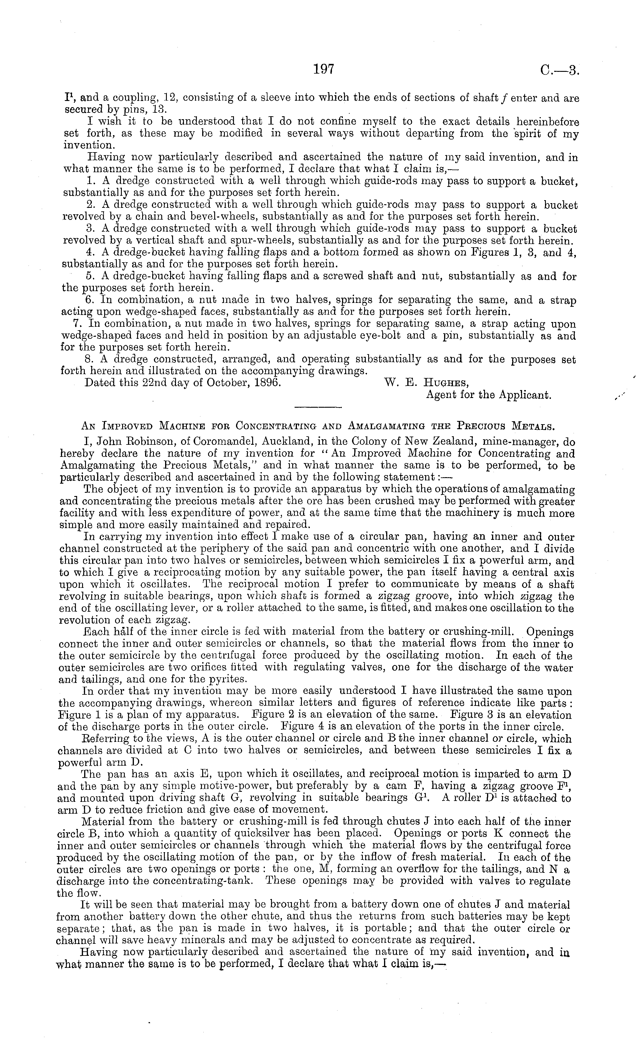 An Improved Machine for Concentrating and Amalgamating the Precious Metals. I, John Robinson, of Coromandel, Auckland, in the Colony of New Zealand, mine-manager, do hereby declare the nature of my invention for " An Improved Machine for Concentrating and Amalgamating the Precious Metals," and in what manner the same is to be performed, to be particularly described and ascertained in and by the following statement: — The object of my invention is to provide an apparatus by which the operations of amalgamating and concentrating the precious metals after the ore has been crushed may be performed with greater facility and with less expenditure of power, and at the same time that the machinery is much more simple and more easily maintained and repaired. In carrying my invention into effect I make use of a circular pan, having an inner and outer channel constructed at the periphery of the said pan and concentric with one another, and I divide this circular pan into two halves or semicircles, between which semicircles I fix a powerful arm, and to which I give a reciprocating motion by any suitable power, the pan itself having a central axis upon which it oscillates. The reciprocal motion I prefer to communicate by means of a shaft revolving in suitable bearings, upon which shaft is formed a zigzag groove, into which zigzag the end of the oscillating lever, or a roller attached to the same, is fitted, and makes one oscillation to the revolution of each zigzag. Each half of the inner circle is fed with material from the battery or crushing-mill. Openings connect the inner and outer semicircles or channels, so that the material flows from the inner to the outer semicircle by the centrifugal force produced by the oscillating motion. In each of the outer semicircles are two orifices fitted with regulating valves, one for the discharge of the water and tailings, and one for the pyrites. In order that my invention may be more easily understood I have illustrated the same upon the accompanying drawings, whereon similar letters and figures of reference indicate like parts : Figure lis a plan of my apparatus. Figure 2is an elevation of the same. Figure 3is an elevation of the discharge ports in the outer circle. Figure 4is an elevation of the ports in the inner circle. Referring to the views, A is the outer channel or circle and B the inner channel or circle, which channels are divided at C into two halves or semicircles, and between these semicircles I fix a powerful arm D. The pan has an axis E, upon which it oscillates, and reciprocal motion is imparted to arm D and the pan by any simple motive-power, but preferably by a cam F, having a zigzag groove F l , and mounted upon driving shaft G, revolving in suitable bearings G l . A roller D 1 is attached to arm D to reduce friction and give ease of movement. Material from the battery or crushing-mill is fed through chutes J into each half of the inner circle B, into which a quantity of quicksilver has been placed. Openings or ports X connect the inner and outer semicircles or channels through which the material flows by the centrifugal force produced by the oscillating motion of the pan, or by the inflow of fresh material. In each of the outer circles are two openings or ports : the one, M, forming an overflow for the tailings, and N a discharge into the concentrating-tank. These openings may be provided with valves to regulate the flow. It will be seen that material may be brought from a battery down one of chutes J and material from another battery down the other chute, and thus the returns from such batteries may be kept separate; that, as the pan is made in two halves, it is portable; and that the outer circle or channel will save heavy minerals and may be adjusted to concentrate as required. Having now particularly described and ascertained the nature of my said invention, and in what manner the same is to be performed, I declare that what I claim is,—.