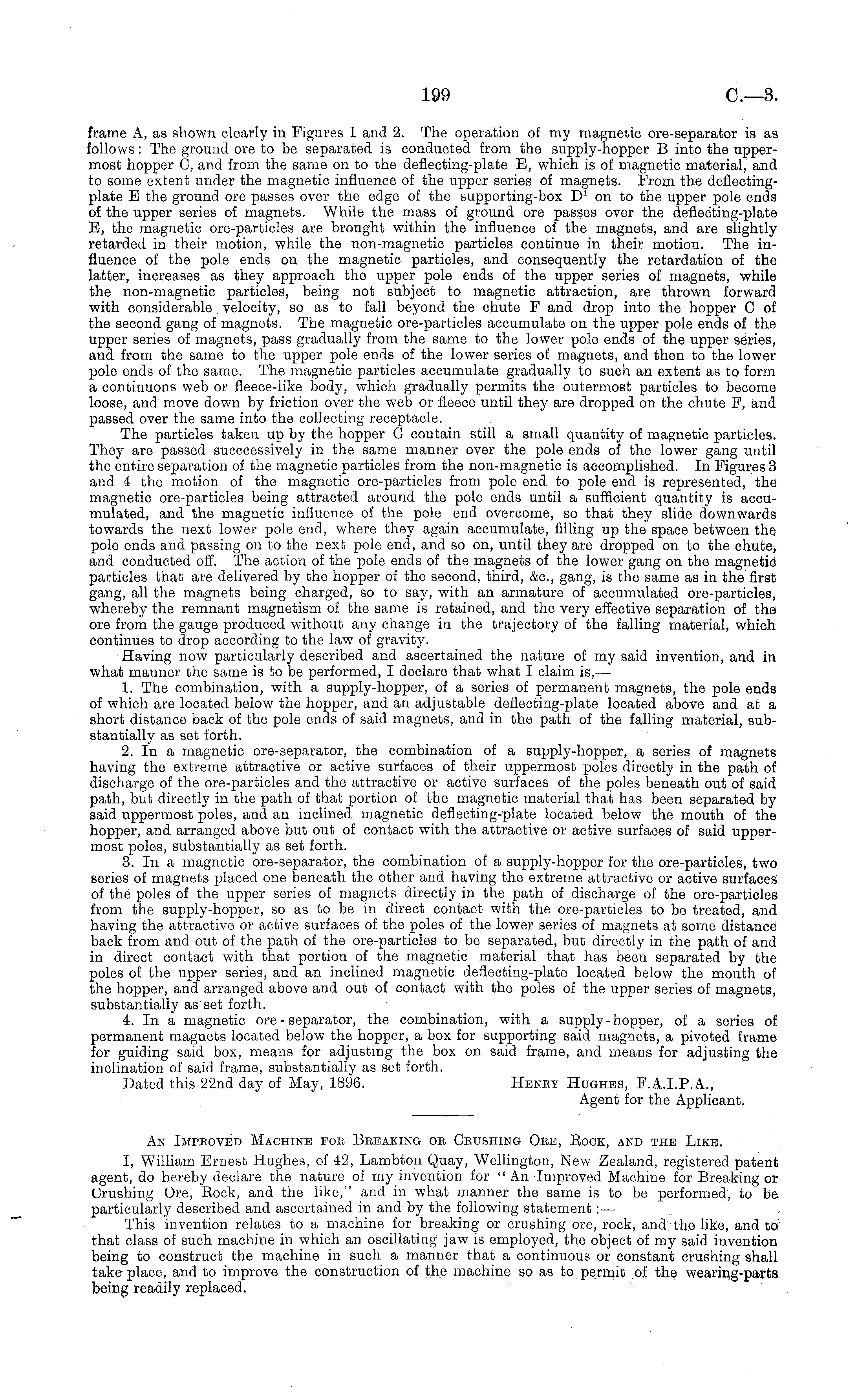 An Improved Machine for Breaking or Crushing Ore, Rock, and the Like. I, William Ernest Hughes, of 42, Lambton Quay, Wellington, New Zealand, registered patent agent, do hereby declare the nature of my invention for " An Improved Machine for Breaking or Orushing Ore, Rock, and the like," and in what manner the same is to be performed, to be particularly described and ascertained in and by the following statement : — This invention relates to a machine for breaking or crushing ore, rock, and the like, and to that class of such machine in which an oscillating jaw is employed, the object of my said invention being to construct the machine in such a manner that a continuous or constant crushing shall take place, and to improve the construction of the machine so as to permit of the wearing-parts being readily replaced,