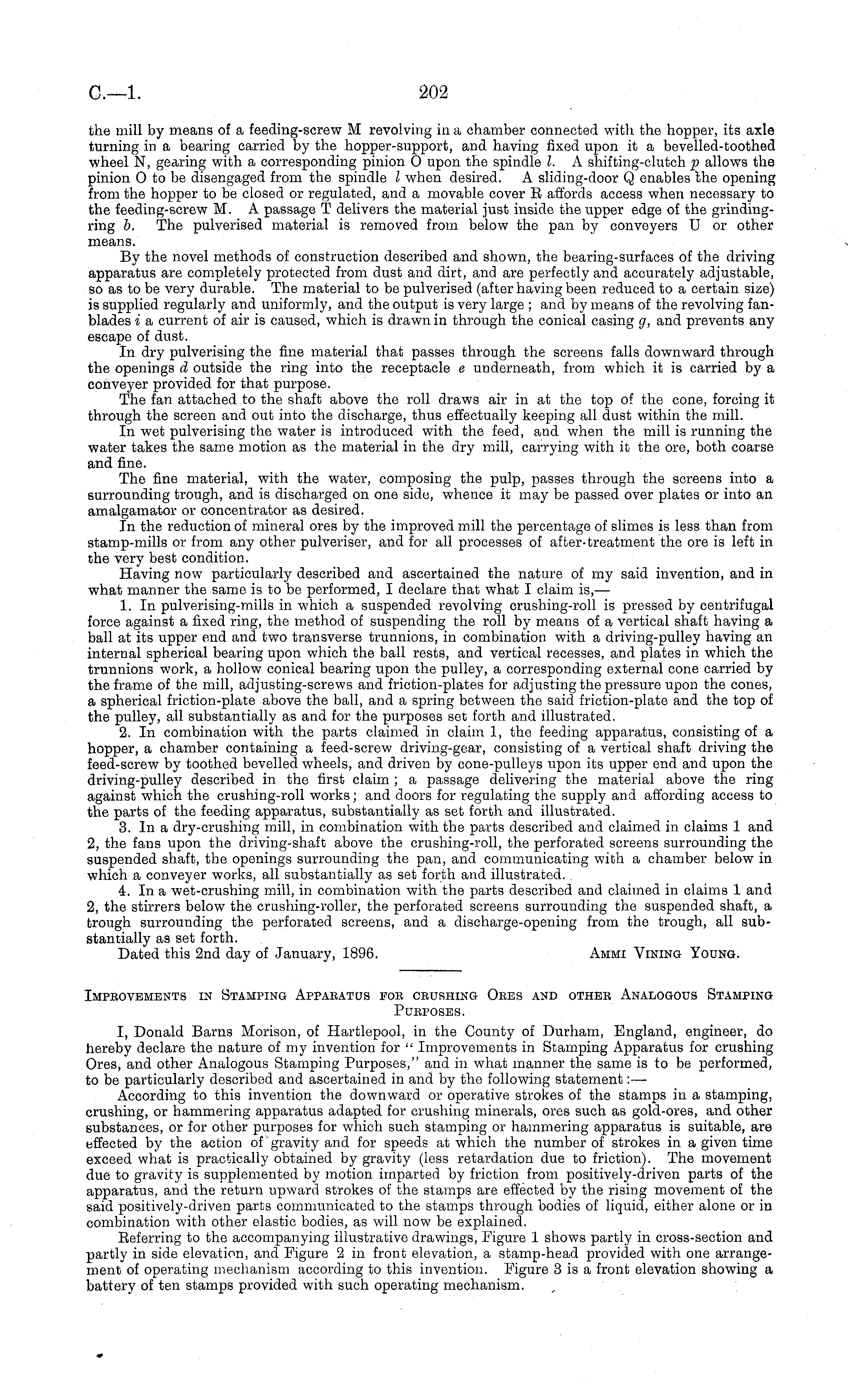 Improvements in Stamping Apparatus for crushing Ores and other Analogous Stamping Purposes. I, Donald Barns Morison, of Hartlepool, in the County of Durham, England, engineer, do hereby declare the nature of my invention for " Improvements in Stamping Apparatus for crushing Ores, and other Analogous Stamping Purposes," and in what manner the same is to be performed, to be particularly described and ascertained in and by the following statement: — According to this invention the downward or operative strokes of the stamps in a stamping, crushing, or hammering apparatus adapted for crushing minerals, ores such as gold-ores, and other substances, or for other purposes for which such stamping or hammering apparatus is suitable, are effected by the action of gravity and for speeds at which the number of strokes in a given time exceed what is practically obtained by gravity (less retardation due to friction). The movement due to gravity is supplemented by motion imparted by friction from positively-driven parts of the apparatus, and the return upward strokes of the stamps are effected by the rising movement of the said positively-driven parts communicated to the stamps through bodies of liquid, either alone or in combination with other elastic bodies, as will now be explained. Referring to the accompanying illustrative drawings, Figure 1 shows partly in cross-section and partly in side elevation, and Figure 2 in front elevation, a stamp-head provided with one arrangement of operating mechanism according to this invention. Figure 3is a front elevation showing a battery of ten stamps provided with such operating mechanism.
