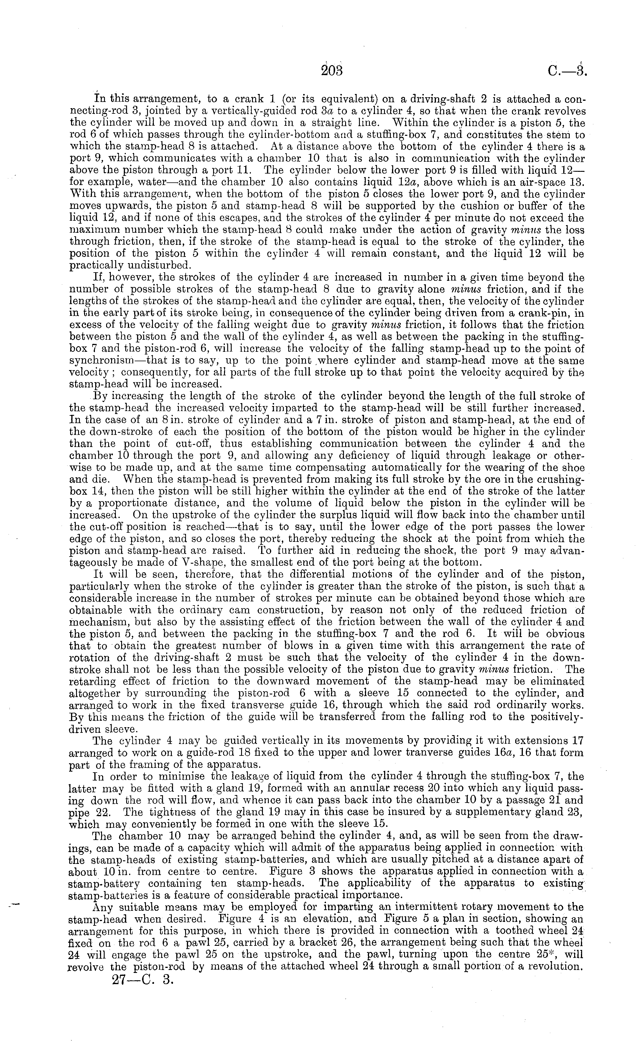 In this arrangement, to a crank 1 (or its equivalent) on a driving-shaft 2 is attached a con-necting-rod 3, jointed by a vertically-guided rod 3a to a cylinder 4, so that when the crank revolves the cylinder will be moved up and down in a straight line. Within the cylinder is a piston 5, the rod 6 of which passes through the cylinder-bottom and a stuffing-box 7, and constitutes the stem to which the stamp-head Bis attached. At a distance above the bottom of the cylinder 4 there is a port 9, which communicates with a chamber 10 that is also in communication with the cylinder above the piston through a port 11. The cylinder below the lower port 9is filled with liquid 12— for example, water —and the chamber 10 also contains liquid 12a, above which is an air-space 13. With this arrangement, when the bottom of the piston 5 closes the lower port 9, and the cylinder moves upwards, the piston 5 and stamp-head 8 will be supported by the cushion or buffer of the liquid 12, and if none of this escapes, and the strokes of the cylinder 4 per minute do not exceed the maximum number which the stamp-head 8 could make under the action of gravity minus the loss through friction, then, if the stroke of the stamp-head is equal to the stroke of the cylinder, the position of the piston 5 within the cylinder 4 will remain constant, and the liquid 12 will be practically undisturbed. If, however, the strokes of the cylinder 4 are increased in number in a given time beyond the number of possible strokes of the stamp-head 8 due to gravity alone minus friction, and if the lengths of the strokes of the stamp-head and the cylinder are equal, then, the velocity of the cylinder in the early part of its stroke being, in consequence of the cylinder being driven from a crank-pin, in excess of the velocity of the falling weight due to gravity minus friction, it follows that the friction between the piston 5 and the wall of the cylinder 4, as well as between the packing in the stuffingbox 7 and the piston-rod 6, will increase the velocity of the falling stamp-head up to the point of synchronism —that is to say, up to the point where cylinder and stamp-head move at the same velocity ; consequently, for all parts of the full stroke up to that point the velocity acquired by the stamp-head will be increased. By increasing the length of the stroke of the cylinder beyond the length of the full stroke of the stamp-head the increased velocity imparted to the stamp-head will be still further increased. In the case of an 8 in. stroke of cylinder and a 7 in. stroke of piston and stamp-head, at the end of the down-stroke of each the position of the bottom of the piston would be higher in the cylinder than the point of cut-off, thus establishing communication between the cylinder 4 and the chamber 10 through the port 9, and allowing any deficiency of liquid through leakage or otherwise to be made up, and at the same time compensating automatically for the wearing of the shoe and die. When the stamp-head is prevented from making its full stroke by the ore in the crushingbox 14, then the piston will be still higher within the cylinder at the end of the stroke of the latter by a proportionate distance, and the volume of liquid below the piston in the cylinder will be increased. On the upstroke of the cylinder the surplus liquid will flow back into the chamber until the cut-off position is reached—that is to say, until the lower edge of the port passes the lower edge of the piston, and so closes the port, thereby reducing the shock at the point from which the piston and stamp-head are raised. To further aid in reducing the shock, the port 9 may advantageously be made of V-shape, the smallest end of the port being at the bottom. It will be seen, therefore, that the differential motions of the cylinder and of the piston, particularly when the stroke of the cylinder is greater than the stroke of the piston, is such that a considerable increase in the number of strokes per minute can be obtained beyond those which are obtainable with the ordinary cam construction, by reason not only of the reduced friction of mechanism, but also by the assisting effect of the friction between the wall of the cylinder 4 and the piston 5, and between the packing in the stuffing-box 7 and the rod 6. It will be obvious that to obtain the greatest number of blows in a given time with this arrangement the rate of rotation of the driving-shaft 2 must be such that the velocity of the cylinder 4 in the downstroke shall not be less than the possible velocity of the piston due to gravity minus friction. The retarding effect of friction to the downward movement of the stamp-head may be eliminated altogether by surrounding the piston-rod 6 with a sleeve 15 connected to the cylinder, and arranged to work in the fixed transverse guide 16, through which the said rod ordinarily works. By this means the friction of the guide will be transferred from the falling rod to the positivelydriven sleeve. The cylinder 4 may be guided vertically in its movements by providing it with extensions 17 arranged to work on a guide-rod 18 fixed to the upper and lower tranverse guides 16a, 16 that form part of the framing of the apparatus. In order to minimise the leakage of liquid from the cylinder 4 through the stuffing-box 7, the latter may be fitted with a gland 19, formed with an annular recess 20 into which any liquid passing down the rod will flow, and whence it can pass back into the chamber 10 by a passage 21 and pipe 22. The tightness of the gland 19 may in this case be insured by a supplementary gland 23, which may conveniently be formed in one with the sleeve 15. The chamber 10 may be arranged behind the cylinder 4, and, as will be seen from the drawings, can be made of a capacity which will admit of the apparatus being applied in connection with the stamp-heads of existing stamp-batteries, and which are usually pitched at a distance apart of about 10 in. from centre to centre.