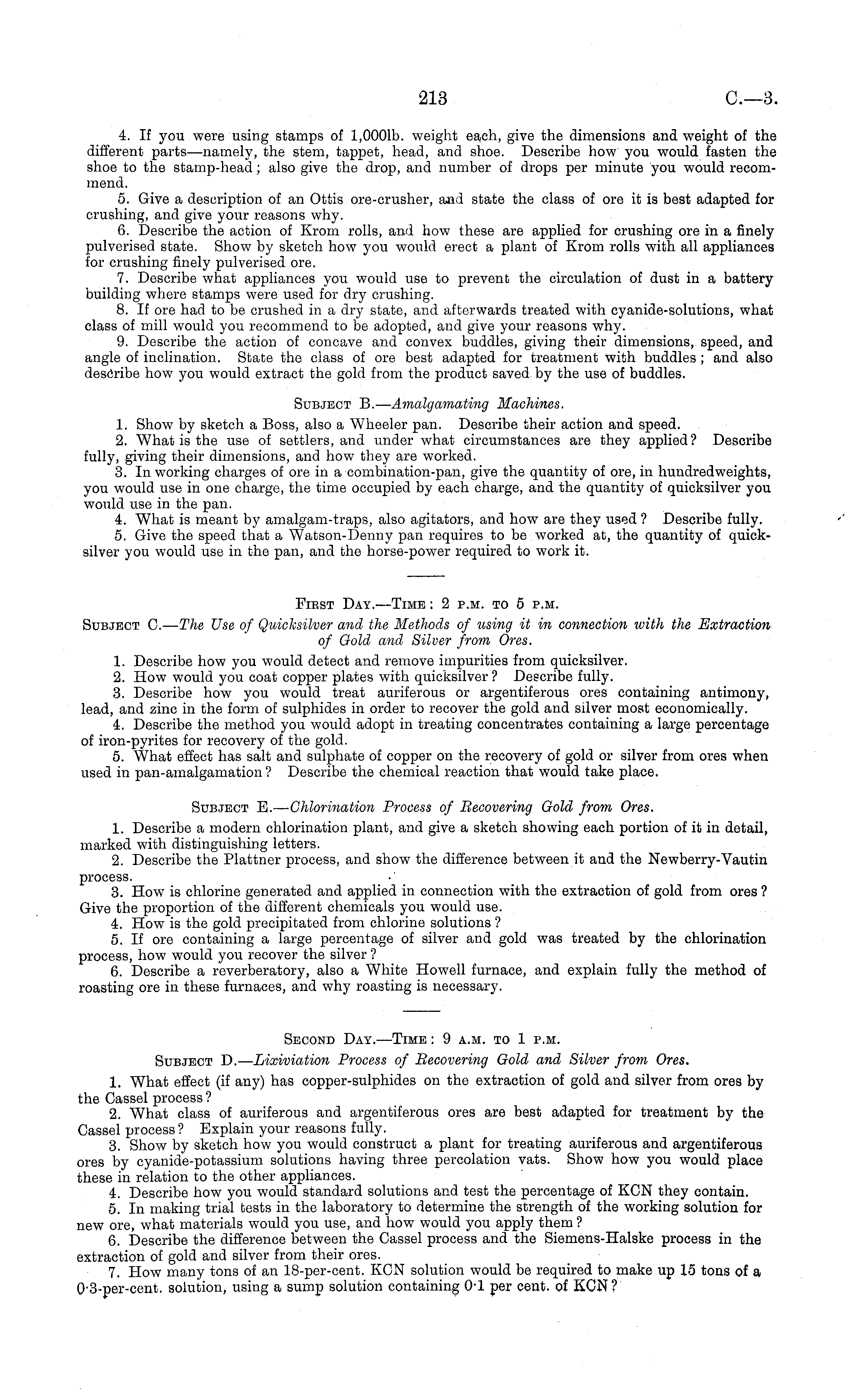 First Day.—Time ; 2 p.m. to 5 p.m. Subject C.— The Use of Quicksilver and the Methods of using it in connection with the Extraction of Gold and Silver from Ores. 1. Describe how you would detect and remove impurities from quicksilver. 2. How would you coat copper plates with quicksilver ? Describe fully. 3. Describe how you would treat auriferous or argentiferous ores containing antimony, lead, and zinc in the form of sulphides in order to recover the gold and silver most economically. 4. Describe the method you would adopt in treating concentrates containing a large percentage of iron-pyrites for recovery of the gold. 5. What effect has salt and sulphate of copper on the recovery of gold or silver from ores when used in pan-amalgamation ? Describe the chemical reaction that would take place. Subject E.— Chlorination Process of Becovering Gold from Ores. 1. Describe a modern chlorination plant, and give a sketch showing each portion of it in detail, marked with distinguishing letters. 2. Describe the Plattner process, and show the difference between it and the Newberry-Vautin process. 3. How T is chlorine generated and applied in connection with the extraction of gold from ores ? Give the proportion of the different chemicals you would use. 4. How is the gold precipitated from chlorine solutions ? 5. If ore containing a large percentage of silver and gold was treated by the chlorination process, how would you recover the silver ? 6. Describe a reverberatory, also a White Howell furnace, and explain fully the method of roasting ore in these furnaces, and why roasting is necessary.