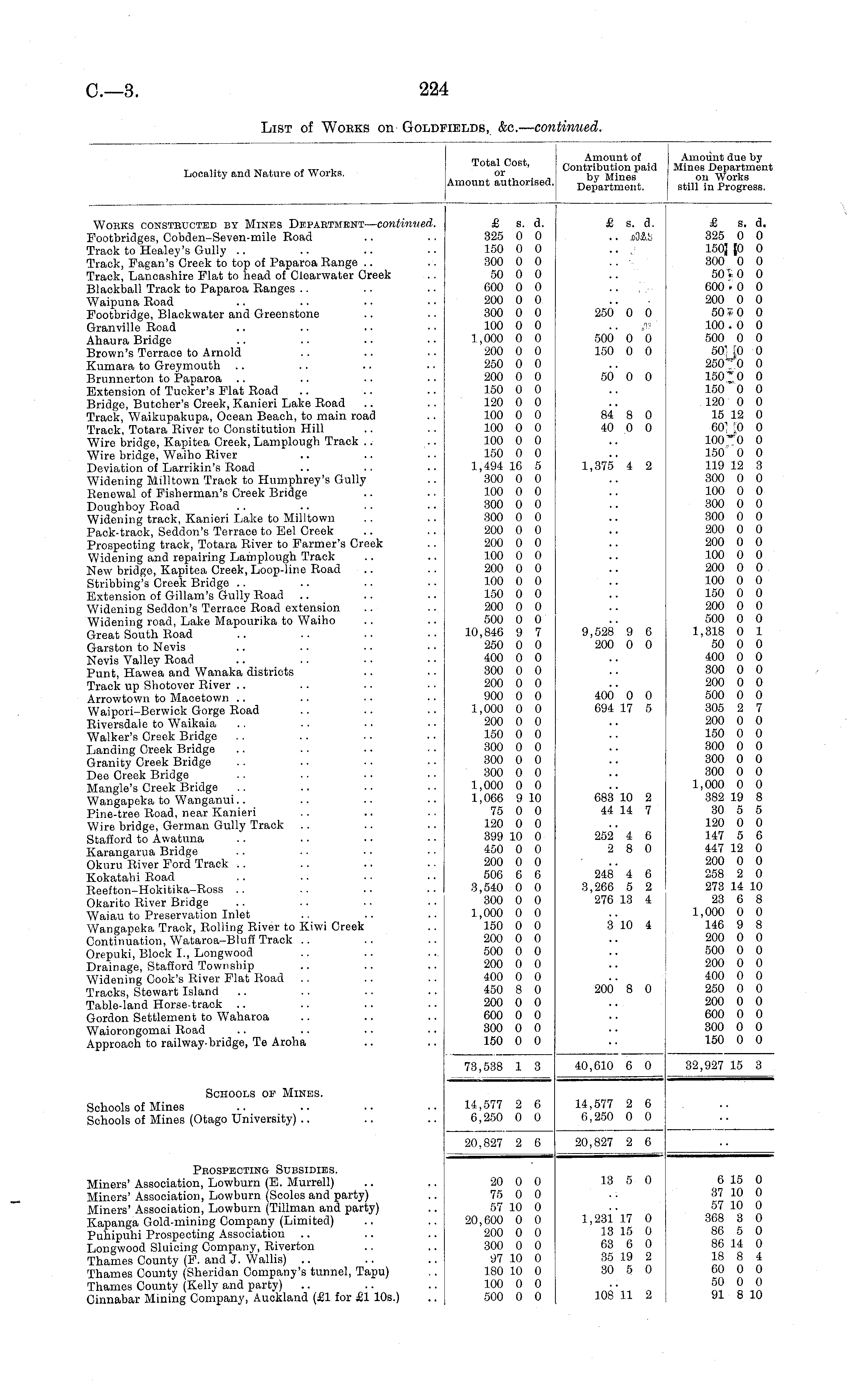 Locality and Nature of Works. Total Cost, or Amount authorised. Amount of Contribution paid by Mines Department. Amount due by Mines Departmeni on Works still in Progress. Woeks consteucted by Mines Depaetment— continued. Footbridges, Cobden-Seven-mile Road Track to Healey's Gully Track, Fagan's Creek to top of Paparoa Range Track, Lancashire Flat to head of Clearwater Creek Blackball Track to Paparoa Ranges Waipuna Road Footbridge, Blackwater and Greenstone Granville Road Ahaura Bridge Brown's Terrace to Arnold Kumara to Greymouth Brunnerton to Paparoa Extension of Tucker's Flat Road Bridge, Butcher's Creek, Kanieri Lake Road Track, Waikupakupa, Ocean Beach, to main road Track, Totara River to Constitution Hill Wire bridge, Kapitea Creek, Lamplough Track Wire bridge, Waiho River Deviation of Larrikin's Road Widening Milltown Track to Humphrey's Gully Renewal of Fisherman's Creek Bridge Doughboy Road Widening track, Kanieri Lake to Milltown Pack-track, Seddon's Terrace to Eel Creek Prospecting track, Totara River to Farmer's Creek Widening and repairing Lamplough Track New bridge, Kapitea Creek, Loop-line Road Stribbing's Creek Bridge Extension of Gillam's Gully Road Widening Seddon's Terrace Road extension Widening road, Lake Mapourika to Waiho Great South Road Garston to Nevis Nevis Valley Road Punt, Hawea and Wanaka districts Track up Shotover River Arrowtown to Macetown Waipori-Berwick Gorge Road Riversdale to Waikaia Walker's Creek Bridge Landing Creek Bridge Granity Creek Bridge Dee Creek Bridge Mangle's Creek Bridge Wangapeka to Wanganui Pine-tree Road, near Kanieri Wire bridge, German Gully Track Stafford to Awatuna Karangarua Bridge Okuru River Ford Track Kokatahi Road Reefton-Hokitika-Ross Okarito River Bridge Waiau to Preservation Inlet Wangapeka Track, Rolling River to Kiwi Creek Continuation, Wataroa-Bluff Track .. Orepuki, Block I., Longwood Drainage, Stafford Township Widening Cook's River Flat Road Tracks, Stewart Island Table-land Horse-track Gordon Settlement to Waharoa Waiorongomai Road Approach to railway-bridge, Te Aroha £ s. d. 325 0 0 150 0 0 300 0 0 50 0 0 600 0 0 200 0 0 300 0 0 100 0 0 1,000 0 0 200 0 0 250 0 0 200 0 0 150 0 0 120 0 0 100 0 0 100 0 0 100 0 0 150 0 0 1,494 16 5 300 0 0 100 0 0 300 0 0 300 0 0 200 0 0 200 0 0 100 0 0 200 0 0 100 0 0 150 0 0 200 0 0 500 0 0 10,846 9 7 250 0 0 400 0 0 300 0 0 200 0 0 900 0 0 1,000 0 0 200 0 0 150 0 0 300 0 0 300 0 0 300 0 0 1,000 0 0 1,066 9 10 75 0 0 120 0 0 399 10 0 450 0 0 200 0 0 506 6 6 3,540 0 0 300 0 0 1,000 0 0 150 0 0 200 0 0 500 0 0 200 0 0 400 0 0 450 8 0 200 0 0 600 0 0 300 0 0 150 0 0 £ s. d. .. .oOAh £ s. d. 325 0 0 150J fO 0 300 0 0 50 £ 0 0 600 i0 0 200 0 0 50 S 0 0 100 . 0 0 500 0 0 50' 10 0 250 l -0 0 150 " 0 0 150 " 0 0 120 0 0 15 12 0 60; p 0 100 "0 0 150' 0 0 119 12 3 300 0 0 100 0 0 300 0 0 300 0 0 200 0 0 200 0 0 100 0 0 200 0 0 100 0 0 150 0 0 200 0 0 500 0 0 1,318 0 1 50 0 0 400 0 0 300 0 0 200 0 0 500 0 0 305 2 7 200 0 0 150 0 0 300 0 0 300 0 0 300 0 0 1,000 0 0 382 19 8 30 5 5 120 0 0 147 5 6 447 12 0 200 0 0 258 2 0 273 14 10 23 6 8 1,000 0 0 146 9 8 200 0 0 500 0 0 200 0 0 400 0 0 250 0 0 200 0 0 600 0 0 300 0 0 150 0 0 250* 0 0 . . /I? 500* 0 0 150 0 0 50 0 0 84 8 0 40 0 0 1,375* 4 2 9,528 9 6 200 0 0 400* 0 0 694 17 5 688*10 2 44 14 7 252* 4 6 2 8 0 248 4 6 3,266 5 2 276 13 4 310 4 200 8 0 73,538 1 3 40,610 6 0 32,927 15 3 Schools oe Mines. Schools of Mines Schools of Mines (Otago University) 14,577 2 6 6,250 0 0 14,577 2 6 6,250 0 0 20,827 2 6 20,827 2 6 Prospecting Subsidies. Miners' Association, Lowburn (E. Murrell) Miners' Association, Lowburn (Scoles and party) Miners' Association, Lowburn (Tillman and party) Kapanga Gold-mining Company (Limited) Puhipuhi Prospecting Association Longwood Sluicing Company, Riverton Thames County (F. and J. Wallis) Thames County (Sheridan Company's tunnel, Tapu) Thames County (Kelly and party) Cinnabar Mining Company, Auckland (£1 for £1 10s.) 20 0 0 75 0 0 57 10 0 20,600 0 0 200 0 0 300 0 0 97 10 0 180 10 0 100 0 0 500 0 0 13 5 0 1,231 17 0 13 15 0 63 6 0 35 19 2 30 5 0 6 15 0 37 10 0 57 10 0 368 3 0 86 5 0 86 14 0 18 8 4 60 0 0 50 0 0 91 8 10 108 11 2