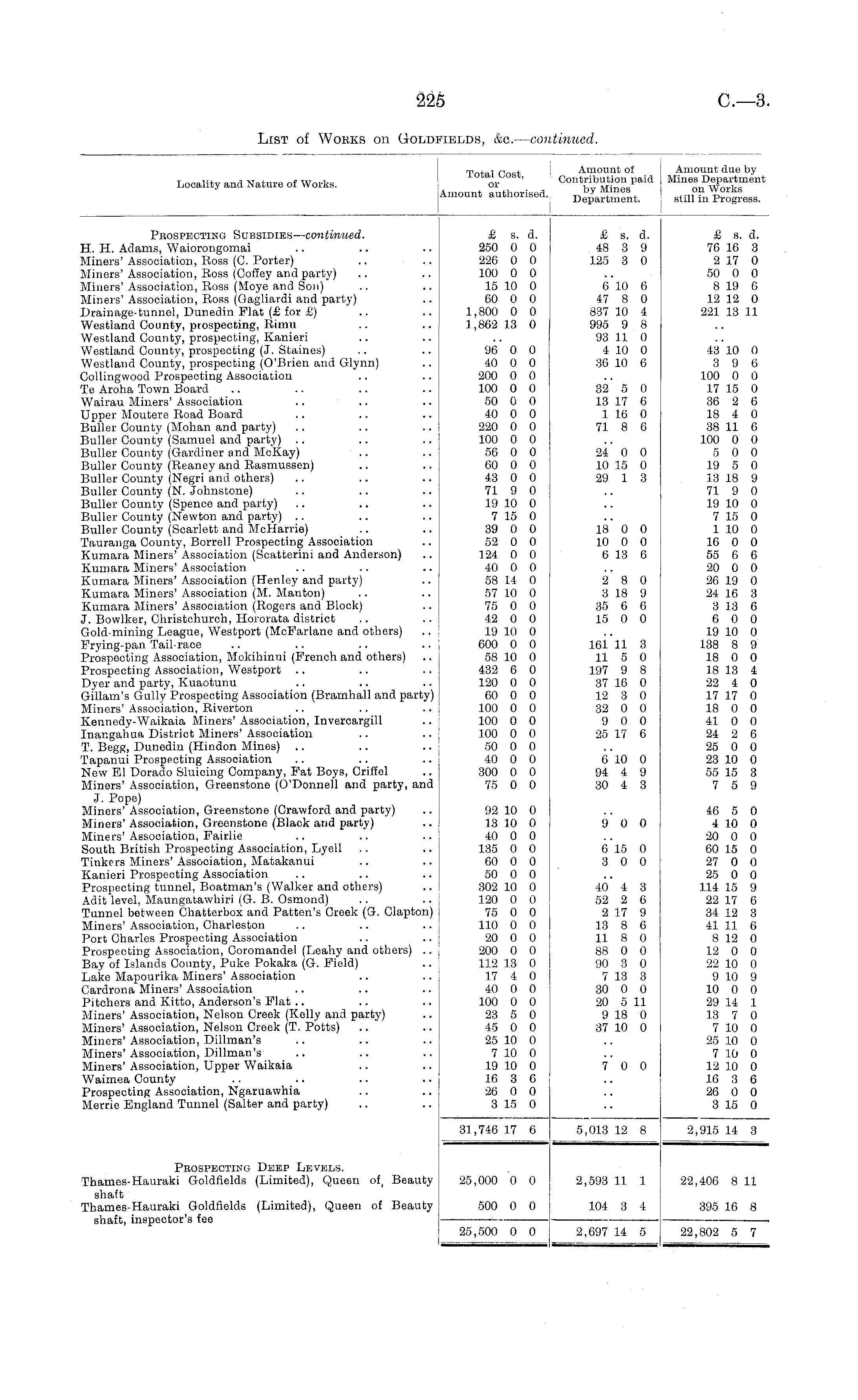 Locality and Nature of Works. rn„ t ., ri-.i. Amount of TotalCost, I contribution paid Amount authorised De b p y Jf t £f nt , Amount due by Mines Department on Works still in Progress. Prospecting Subsidies — continued. H. H. Adams, Waiorongomai Miners' Association, Ross (G. Porter) Miners' Association, Ross (Coffey and party) Miners' Association, Ross (Moye and Son) Miners' Association, Ross (Gagliardi and party) Drainage-tunnel, Dunedin Flat (£ for £) Westland County, prospecting, Rimu Westland County, prospecting, Kanieri Westland County, prospecting (J. Staines) Westland County, prospecting (O'Brien and Glynn) Collingwood Prospecting Association Te Aroha Town Board Wairau Miners' Association Upper Moutere Road Board Buller County (Mohan and party) Buller County (Samuel and party) Buller County (Gardiner and McKay) Buller County (Reaney and Rasmussen) Buller County (Negri and others) Buller County (N. Johnstone) Buller County (Spence and party) Buller County (Newton and party) Buller County (Scarlett and McHarrie) Tauranga County, Borrell Prospecting Association Kumara Miners' Association (Scatterini and Anderson) Kumara Miners'Association Kumara Miners' Association (Henley and party) Kumara Miners' Association (M. Manton) Kumara Miners' Association (Rogers and Block) J. Bowlker, Christchurch, Hororata district Gold-mining League, Westport (McFarlane and others) Frying-pan Tail-race Prospecting Association, Mokihinui (French and others) Prospecting Association, Westport Dyer and party, Kuaotunu Gillam's Gully Prospecting Association (Bramhall and party) Miners' Association, Riverton Kennedy-Waikaia Miners' Association, Invercargill Inangahua District Miners' Association T. Begg, Dunedin (Hindon Mines) Tapanui Prospecting Association New El Dorado Sluicing Company, Fat Boys, Criffel Miners' Association, Greenstone (O'Donnell and party, and J. Pope) Miners' Association, Greenstone (Crawford and party) Miners' Association, Greenstone (Black and party) Miners' Association, Fairlie South British Prospecting Association, Lyell Tinkers Miners' Association, Matakanui Kanieri Prospecting Association Prospecting tunnel, Boatman's (Walker and others) Adit level, Maungatawhiri (G. B. Osmond) Tunnel between Chatterbox and Patten's Creek (G. Clapton) Miners' Association, Charleston Port Charles Prospecting Association Prospecting Association, Coromandel (Leahy and others) .. Bay of Islands County, Puke Pokaka (G. Field) Lake Mapourika Miners' Association Gardrona Miners' Association Pitchers and Kitto, Anderson's Flat Miners' Association, Nelson Creek (Kelly and party) Miners' Association, Nelson Creek (T. Potts) Miners'Association, Dillman's Miners' Association, Dillman's Miners' Association, Upper Waikaia Waimea County Prospecting Association, Ngaruawhia Merrie England Tunnel (Salter and party) £ s. d. 250 0 0 226 0 0 100 0 0 15 10 0 60 0 0 1,800 0 0 1,862 13 0 £ s. d. 48 3 9 125 3 0 £ s. d. 76 16 3 2 17 0 50 0 0 8 19 6 12 12 0 221 13 11 6 10 6 47 8 0 837 10 4 995 9 8 93 11 0 4 10 0 36 10 6 96 0 0 40 0 0 200 0 0 100 0 0 50 0 0 40 0 0 220 0 0 100 0 0 56 0 0 60 0 0 43 0 0 71 9 0 19 10 0 7 15 0 39 0 0 52 0 0 124 0 0 40 0 0 58 14 0 57 10 0 75 0 0 42 0 0 19 10 0 600 0 0 58 10 0 432 6 0 120 0 0 60 0 0 100 0 0 100 0 0 100 0 0 50 0 0 40 0 0 300 0 0 75 0 0 32 5 0 13 17 6 1 16 0 71 8 6 24 0 0 10 15 0 29 1 3 18 0 0 10 0 0 6 13 6 2 8 0 3 18 9 35 6 6 15 0 0 43 10 0 3 9 6 100 0 0 17 15 0 36 2 6 18 4 0 38 11 6 100 0 0 5 0 0 19 5 0 13 18 9 71 9 0 19 10 0 7 15 0 1 10 0 16 0 0 55 6 6 20 0 0 26 19 0 24 16 3 3 13 6 6 0 0 19 10 0 138 8 9 18 0 0 18 13 4 22 4 0 17 17 0 18 0 0 41 0 0 24 2 6 25 0 0 23 10 0 55 15 3 7 5 9 161 11 3 11 5 0 197 9 8 37 16 0 12 3 0 32 0 0 9 0 0 25 17 6 6 10 0 94 4 9 30 4 3 92 10 0 13 10 0 40 0 0 135 0 0 60 0 0 50 0 0 302 10 0 120 0 0 75 0 0 110 0 0 20 0 0 200 0 0 112 13 0 17 4 0 40 0 0 100 0 0 23 5 0 45 0 0 25 10 0 7 10 0 19 10 0 16 3 6 26 0 0 3 15 0 9 0 0 615 0 3 0 0 40 4 3 52 2 6 2 17 9 13 8 6 11 8 0 88 0 0 90 3 0 7 13 3 30 0 0 20 5 11 9 18 0 37 10 0 46 5 0 4 10 0 20 0 0 60 15 0 27 0 0 25 0 0 114 15 9 22 17 6 34 12 3 41 11 6 8 12 0 12 0 0 22 10 0 9 10 9 10 0 0 29 14 1 13 7 0 7 10 0 25 10 0 7 10 0 12 10 0 16 3 6 26 0 0 3 15 0 7 0 0 31,746 17 6 5,013 12 8 2,915 14 3 Prospecting Deep Levels. Thames-Hauraki Goldfields (Limited), Queen of, Beauty shaft Thames-Hauraki Goldfields (Limited), Queen of Beauty shaft, inspector's fee 25,000 0 0 2,598 11 1 22,406 8 11 500 0 0 104 3 4 395 16 8 25,500 0 0 2,697 14 5 22,802 5 7