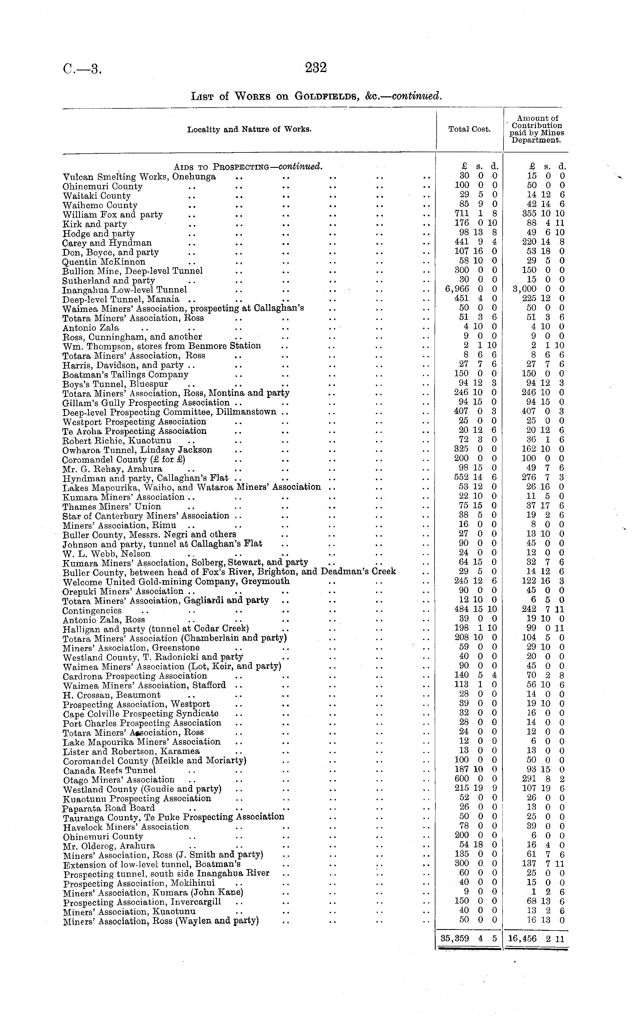Locality and Nature of Works. Total Cost. Amount of Contribution paid by Mines Department. Aids to Prospecting— continued. Vulcan Smelting Works, Onehunga Ohinemuri County Waitaki County Waihomo County William Fox and party Kirk and party Hodge and party Carey and Hyndman Don, Boyce, and party Quentin McKinnon Bullion Mine, Deep-level Tunnel Sutherland and party Inangahua Low-level Tunnel .. .. Deep-level Tunnel, Manaia Waimea Miners' Association, prospecting at Callaghan's Totara Miners' Association, Ross Antonio Zala Ross, Cunningham, and another Wm. Thompson, stores from Benmore Station Totara Miners' Association, Ross Harris, Davidson, and party Boatman's Tailings Company Boys's Tunnel, Bluespur Totara Miners' Association, Ross, Montina and party Gillam's Gully Prospecting Association Deep-level Prospecting Committee, Dillmanstown Westport Prospecting Association Te Aroha Prospecting Association Robert Richie, Kuaotunu Owharoa Tunnel, Lindsay Jackson Coromandel County (£ for £) Mr. G. Rehay, Arahura Hyndman and party, Callaghan's Flat Lakes Mapourika, Waiho, and Wataroa Miners' Association Kumara Miners' Association Thames Miners' Union Star of Canterbury Miners' Association Miners' Association, Rimu Buller County, Messrs. Negri and others Johnson and party, tunnel at Callaghan's Flat W. L. Webb, Nelson Kumara Miners' Association, Solberg, Stewart, and party Buller County, between head of Fox's River, Brighton, and Deadman's Creek Welcome United Gold-mining Company, Greymouth Orepuki Miners' Association Totara Miners' Association, Gagliardi and party Contingencies Antonio Zala, Ross HaDigan and party (tunnel at Cedar Creek) Totara Miners'Association (Chamberlain and party) .. Miners'Association, Greenstone Westland County, T. Radonicki and party Waimea Miners' Association (Lot, Keir, and party) Cardrona Prospecting Association Waimea Miners' Association, Stafford .. H. Crossan, Beaumont Prospecting Association, Westport Cape Colville Prospecting Syndicate Port Charles Prospecting Association Totara Miners' Association, Ross Lake Mapourika Miners' Association Lister and Robertson, Karamea Coromandel County (Meikle and Moriarty) Canada Reefs Tunnel .. .. .. Otago Miners' Association Westland County (Goudie and party) Kuaotunu Prospecting Association Paparata Road Board Tauranga County, Te Puke Prospecting Association Havelock Miners' Association Ohinemuri County Mr. Olderog, Arahura Miners'Association, Ross (J. Smith and party) Extension of low-level tunnel, Boatman's Prospecting tunnel, south side Inangahua River Prospecting Association, Mokihinui Miners'Association, Kumara (John Kane) Prospecting Association, Invercargill Miners' Association, Kuaotunu Miners' Association, Ross (Waylen and party) £ s. d. 30 0 0 100 0 0 29 5 0 85 9 0 711 1 8 176 0 10 98 13 8 441 9 4 107 16 0 58 10 0 300 0 0 30 0 0 6,966 0 0 451 4 0 50 0 0 51 3 6 4 10 0 9 0 0 2 1 10 8 6 6 27 7 6 150 0 0 94 12 3 246 10 0 94 15 0 407 0 3 25 0 0 20 12 6 72 3 0 325 0 0 200 0 0 98 15 0 552 14 6 53 12 0 22 10 0 75 15 0 38 5 0 16 0 0 27 0 0 90 0 0 24 0 0 64 15 0 29 5 0 245 12 6 90 0 0 12 10 0 484 15 10 39 0 0 198 1 10 208 10 0 59 0 0 40 0 0 90 0 0 140 5 4 113 1 0 28 0 0 39 0 0 32 0 0 28 0 0 24 0 0 12 0 0 13 0 0 100 0 0 187 10 0 600 0 0 215 19 9 52 0 0 26 0 0 50 0 0 78 0 0 200 0 0 54 18 0 135 0 0 300 0 0 60 0 0 40 0 0 9 0 0 150 0 0 40 0 0 50 0 0 £ s. d. 15 0 0 50 0 0 14 12 6 42 14 6 355 10 10 88 4 11 49 6 10 220 14 8 53 18 0 29 5 0 150 0 0 15 0 0 3,000 0 0 225 12 0 50 0 0 51 3 6 4 10 0 9 0 0 2 1 10 8 0 0 27 7 6 150 0 0 94 12 3 246 10 0 94 15 0 407 0 3 25 0 0 20 12 6 36 1 6 162 10 0 100 0 0 49 7 6 276 7 3 26 16 0 11 5 0 37 17 6 19 2 6 8 0 0 13 10 0 45 0 0 12 0 0 32 7 6 14 12 6 122 16 3 45 0 0 6 5 0 242 7 11 19 10 0 99 0 11 104 5 0 29 10 0 20 0 0 45 0 0 70 2 8 56 10 6 14 0 0 19 10 0 16 0 0 14 0 0 12 0 0 6 0 0 13 0 0 50 0 0 93 15 0 291 8 2 107 19 6 26 0 0 13 0 0 25 0 0 39 0 0 6 0 0 16 4 0 61 7 6 137 7 11 25 0 0 15 0 0 12 6 68 13 6 13 2 6 16 13 0 35,359 4 5 16,456 2 1