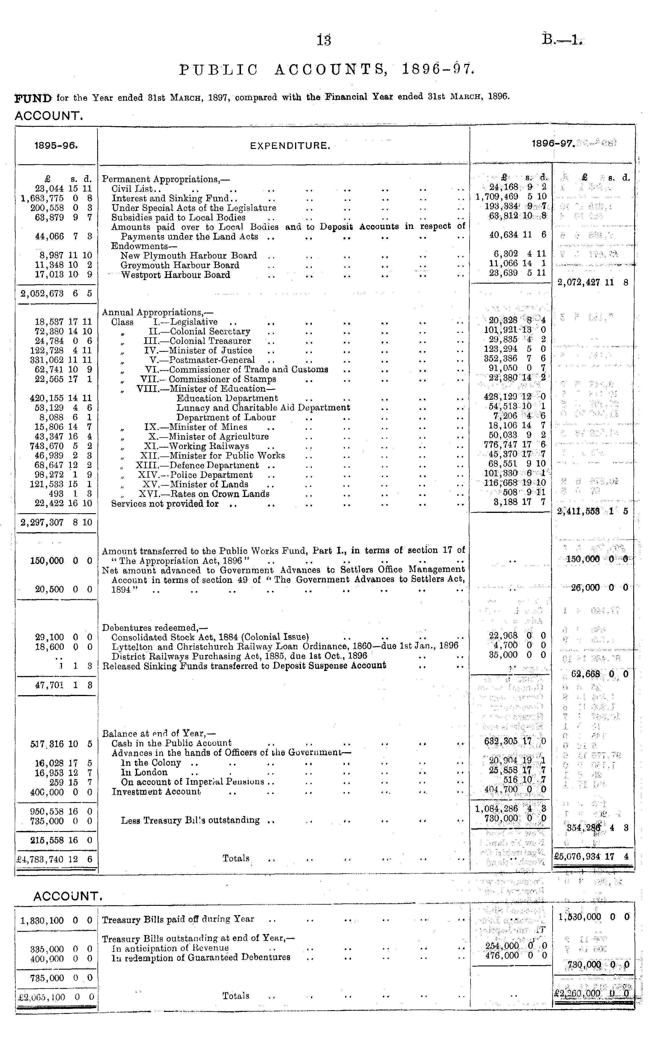 1895-96. EXPENDITURE. 189 i-97. t-PG&l £ s. d. 23,044 15 11 1,683,775 0 8 200,558 0 3 63,879 9 7 Permanent Appropriations,— Civil List Interest and Sinking Fund.. Under Special Acts of the Legislature Subsidies paid to Local Bodies Amounts paid over to Local Bodies and to Deposit Accounts in respect of Payments under the Land Acts Endowments— New Plymouth Harbour Board Greymouth Harbour Board Westport Harbour Board £ s. ■ a. 24,168 9 2 1,709,469 5 10 193,334 9 7 63,812 10 8 .'*! £ 8. d. 44,066 7 3 40,634 11 6 8,987 11 10 11,348 10 2 17,013 10 9 6,302 4 11 11,066 14 1 23,639 5 11 . ■ 7& 2,052,673 6 5 2,072,427 11 8 18,537 17 11 72,380 14 10 24,784 0 6 122,728 4 11 331,062 11 11 62,741 10 9 22,565 17 1 420,155 14 11 53,129 4 6 8,088 6 1 15,806 14 7 43,347 16 4 743,670 5 2 46,939 2 3 68,647 12 2 98,272 1 9 121,533 15 1 493 1 3 22,422 16 10 Annual Appropriations,— Class I. —Legislative II.—Colonial Secretary „ III. —Colonial Treasurer „ IV.—Minister of Justice V. —Postmaster-General VI. —Commissioner of Trade and Customs „ VII.- Commissioner of Stamps „ VIII.—Minister of Education — Education Department Lunacy and Charitable Aid Department Department of Labour IX.—Minister of Mines X. —Minister of Agriculture „ XL—Working Railways .. .. .. XII.—Minister for Public Works XIII.—Defence Department XIV.—Police Department XV.—Minister of Lands XVI.—Rates on Crown Lands Services not provided for 20,328 8 4 101,921-13 0 29,835 4 2 123,294 5 0 352,386 7 6 91,050 0 7 22,380 14 2 428,129 12 0 54,513 10 1 7,206 4 6 18,106 14 7 50,033 9 2 776,747 17 6 45,370 17 7 68,551 9 10 101,330 6 1 116,668 19 10 508 9 11 3,188 17 7 - - " K ■:. ■-'-...•)l 2,411,553 1 5 2,297,307 8 10 150,000 0 0 Amount transferred to the Public Works Fund, Part I., in terms of section 17 of " The Appropriation Act, 1896 " Net amount advanced to Government Advances tc Settlers Office Management Account in terms of section 49 of " The Government Advances to Settlers Act, 1894" 150,000 0 0 20,500 0 0 26,000 0 0 ') i i ■; . : 29,100 0 0 18,600 0 0 Debentures redeemed, — Consolidated Stock Act, 1884 (Colonial Issue) Lyttelton and Christchurch Railway Loan Ordinance, 1860—due 1st Jan., 1896 District Railways Purchasing Act, 1885, due 1st Oct., 1896 Released Sinking Funds transferred to Deposit Suspense Account 22,968 0 0 4,700 0 0 35,000 0 0 'i 1 3 62,668 0 0 47,701 1 3 • 517.316 10 5 Balance at end of Year, — Cash in the Public Account Advances in the hands of Officers of the Government— In the Colony In London On account of Irnperi-al Pensions Investment Account 632,305 17 0 20,904 19 1 25,858 17 7 516 10 7 404.700 0 0 0 Si I 8 e n ou-j AC ■ < r ,v ■ 16,028 17 5 16,953 12 7 259 15 7 400,000 0 0 950,558 16 0 735,000 0 0 Less Treasury Bil'a outstanding 1,084,286 4 3 730,000 0 0 4 3 216,558 16 0 Totals £4,783,740 12 6 £5,076,934 17 4 ACCOUNT. 1,330,100 0 0 Treasury Bills paid off during Year iT 254,000 0' 0 476,000 0 0 1,530,000 0 0 335,000 0 0 400,000 0 0 Treasury Bills outstanding at end of Year, — In anticipation of Revenue lu redemption of Guaranteed Debentures ■ , BOS 730,000 0 0 735,000 0 0 Totals £2,260,000 0 0 £2,005,100 0 0