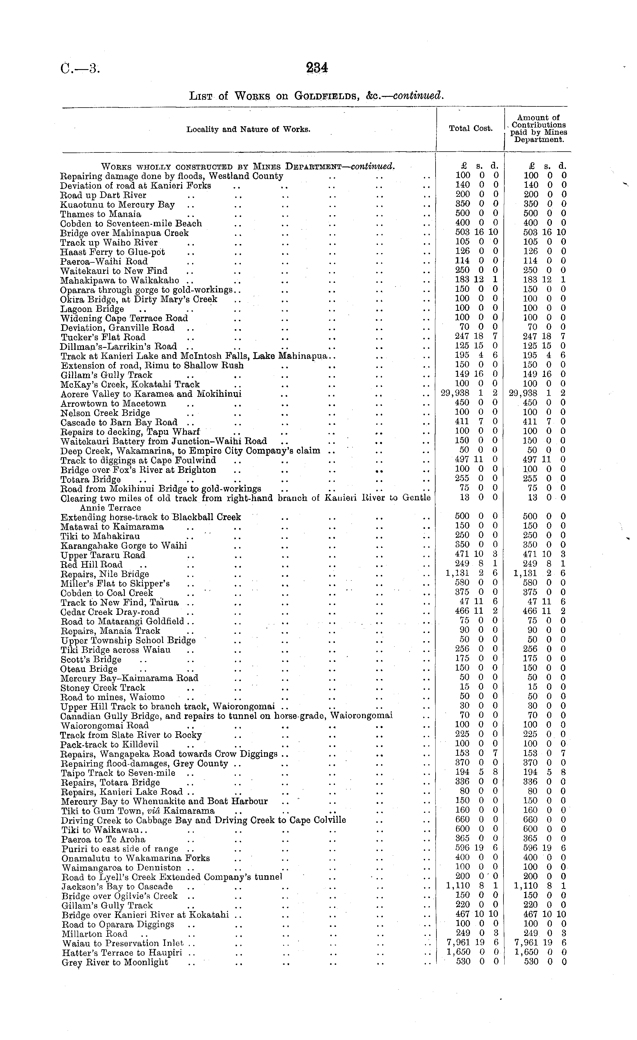 Locality and Nature of Works. Total Cost. Amount of Contributions paid by Mines Department. Works wholly constructed by Mines Department— continued. Repairing damage done by floods, Westland County Deviation of road at Kanieri Forks Road up Dart River Kuaotunu to Mercury Bay Thames to Manaia Cobden to Seventeen-mile Beach Bridge over Mahinapua Greek Track up Waiho River Haast Ferry to Glue-pot Paeroa-Waihi Road Waitekauri to New Find Mahakipawa to Waikakaho Oparara through gorge to gold-workings.. Okira Bridge, at Dirty Mary's Greek Lagoon Bridge Widening Cape Terrace Road Deviation, Granville Road Tucker's Flat Road Dillman's-Larrikin's Road Track at Kanieri Lake and Mcintosh Falls, Lake Mahinapua Extension of road, Rimu to Shallow Rush Gillam's Gully Track McKay's Creek, Kokatahi Track Aorere Valley to Karamea and Mokihinui Arrowtown to Macetown Nelson Creek Bridge Cascade to Barn Bay Road Repairs to decking, Tapu Wharf Waitekauri Battery from Junction-Waihi Road Deep Creek, Wakamarina, to Empire City Company's claim Track to diggings at Cape Foulwind Bridge over Fox's River at Brighton Totara Bridge Road from Mokihinui Bridge to gold-workings Clearing two miles of old track from right-hand branch of Kanieri River to Gentle Annie Terrace Extending horse-track to Blackball Creek Matawai to Kaimarama Tiki to Mahakirau Karangahake Gorge to Waihi Upper Tararu Road Red Hill Road Repairs, Nile Bridge Miller's Flat to Skipper's Cobden to Coal Creek .. .. .. Track to New Find, Tairua Cedar Creek Dray-road Road to Matarangi Goldfield .. .. .. .. ... Repairs, Manaia Track Upper Township School Bridge Tiki Bridge across Waiau .. .. .. .. .. ... Scott's Bridge Oteau Bridge Mercury Bay-Kaimarama Road Stoney Creek Track .. .. .. Road to mines, Waiomo Upper Hill Track to branch track, Waiorongomai Canadian Gully Bridge, and repairs to tunnel on horse-grade, Waiorongomai Waiorongomai Road Track from Slate River to Rocky Pack-track to Killdevil .. .. Repairs, Wangapeka Road towards Crow Diggings Repairing flood-damages, Grey County .. .. Taipo Track to Seven-mile Repairs, Totara Bridge .. Repairs, Kanieri Lake Road .. Mercury Bay to Whenuakite and Boat Harbour Tiki to Gum Town,-urn Kaimarama Driving Creek to Cabbage Bay and Driving Creek to Cape Colville Tiki to Waikawau Paeroa to Te Aroha Puriri to east side of range .. Onamalutu to Wakamarina Forks Waimangaroa to Denniston Road to Lyell's Creek Extended Company's tunnel .. Jackson's Bay to Cascade Bridge over Ogilvie's Creek Gillam's Gully Track Bridge over Kanieri River at Kokatahi Road to Oparara Diggings Millarton Road Waiau to Preservation Inlet .. .. Hatter's Terrace to Haupiri Grey River to Moonlight £ S. d. 100 0 0 140 0 0 200 0 0 350 0 0 500 0 0 400 0 0 503 16 10 105 0 0 126 0 0 114 0 0 250 0 0 183 12 1 150 0 0 100 0 0 100 0 0 100 0 0 70 0 0 247 18 7 125 15 0 195 4 6 150 0 0 149 16 0 100 0 0 29,938 1 2 450 0 0 100 0 0 411 7 0 100 0 0 150 0 0 50 0 0 497 11 0 100 0 0 255 0 0 75 0 0 13 0 0 500 0 0 150 0 0 250 0 0 350 0 0 471 10 3 249 8 1 1,131 2 6 580 0 0 375 0 0 47 11 6 466 11 2 75 0 0 90 0 0 50 0 0 256 0 0 175 0 0 150 0 0 50 0 0 15 0 0 50 0 0 30 0 0 70 0 0 100 0 0 225 0 0 100 0 0 153 0 7 370 0 0 194 5 8 336 0 0 80 0 0 150 0 0 160 0 0 660 0 0 600 0 0 365 0 0 596 19 6 400 0 0 100 0 0 200 0 0 1,110 8 1 150 0 0 220 0 0 467 10 10 1.00 0 0 249 0 3 7,961 19 6 1,650 0 0 530 0 0 £ s. d. 100 0 0 140 0 0 200 0 0 350 0 0 500 0 0 400 0 0 503 16 10 105 0 0 126 0 0 114 0 0 250 0 0 183 12 1 150 0 0 100 0 0 100 0 0 100 0 0 70 0 0 247 18 7 125 15 0 195 4 6 150 0 0 149 16 0 100 0 0 29,938 1 2 450 0 0 100 0 0 411 7 0 100 0 0 150 0 0 50 0 0 497 11 0 100 0 0 255 0 0 75 0 0 13 0 0 500 0 0 150 0 0 250 0 0 350 0 0 471 10 3 249 8 1 1,131 2 6 580 0 0 375 0 0 47 11 6 466 11 2 75 0 0 90 0 0 50 0 0 256 0 0 175 0 0 150 0 0 50 0 0 15 0 0 50 0 0 30 0 0 70 0 0 100 0 0 225 0 0 100 0 0 153 0 7 370 0 0 194 5 8 336 0 0 80 0 0 150 0 0 160 0 0 660 0 0 600 0 0 365 0 0 596 19 6 400 0 0 100 0 0 200 0 0 1,110 8 1 150 0 0 220 0 0 467 10 10 100 0 0 249 0 3 7,961 19 6 1,650 0 0 530 0 0