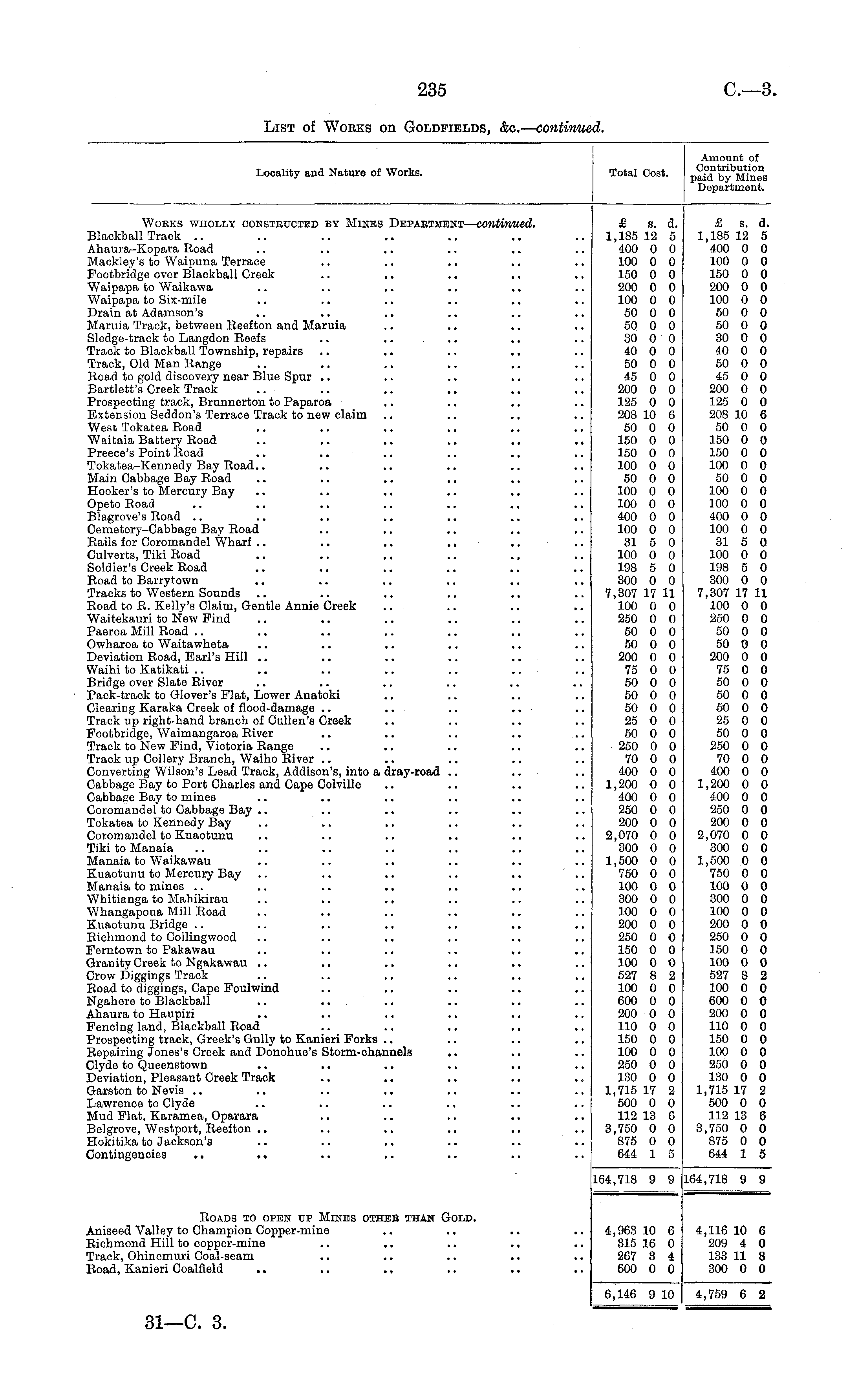 Locality and Nature of Works. Total Cost. Amount of Contribution paid by Mines Department. Works wholly constructed by Mines Department— continued. Blackball Track Ahaura-Kopara Road Mackley's to Waipuna Terrace Footbridge over Blackball Creek Waipapa to Waikawa Waipapa to Six-mile Drain at Adamson's Maruia Track, between Reefton and Maruia Sledge-track to Langdon Reefs Track to Blackball Township, repairs Track, Old Man Range Road to gold discovery near Blue Spur Bartlett's Creek Track Prospecting track, Brunnerton to Paparoa .. .. Extension Seddon's Terrace Track to new claim West Tokatea Road Waitaia Battery Road Preece's Point Road Tokatea-Kennedy Bay Road.. Main Cabbage Bay Road Hooker's to Mercury Bay Opeto Road Blagrove's Road Cemetery-Cabbage Bay Road Rails for Coromandel Wharf Culverts, Tiki Road Soldier's Creek Road Road to Barrytown Tracks to Western Sounds Road to R. Kelly's Claim, Gentle Annie Creek Waitekauri to New Find Paeroa Mill Road Owharoa to Waitawheta Deviation Road, Earl's Hill Waihi to Katikati Bridge over Slate River Pack-track to Glover's Flat, Lower Anatoki Clearing Karaka Greek of flood-damage Track up right-hand branch of Gullen's Creek Footbridge, Waimangaroa River .. Track to New Find, Victoria Range Track up Collery Branch, Waiho River .. Converting Wilson's Lead Track, Addison's, into a dray-road Cabbage Bay to Port Charles and Cape Colville Cabbage Bay to mines Coromandel to Cabbage Bay .. Tokatea to Kennedy Bay Coromandel to Kuaotunu Tiki to Manaia Manaia to Waikawau Kuaotunu to Mercury Bay Manaia to mines Whitianga to Mahikirau Whangapoua Mill Road Kuaotunu Bridge Richmond to Collingwood Ferntown to Pakawau Granity Creek to Ngakawau Crow Diggings Track Road to diggings, Cape Foulwind Ngahere to Blackball Ahaura to Haupiri Fencing land, Blackball Road Prospecting track, Greek's Gully to Kanieri Forks Repairing Jones's Creek and Donohue's Storm-channels Clyde to Queenstown Deviation, Pleasant Creek Track Garston to Nevis Lawrence to Clyde Mud Flat, Karamea, Oparara Belgrove, Westport, Reefton Hokitika to Jackson's Contingencies .. .. £ s. d. 1,185 12 5 400 0 0 100 0 0 150 0 0 200 0 0 100 0 0 50 0 0 50 0 0 30 0 0 40 0 0 50 0 0 45 0 0 200 0 0 125 0 0 208 10 6 50 0 0 150 0 0 150 0 0 100 0 0 50 0 0 100 0 0 100 0 0 400 0 0 100 0 0 31 5 0 100 0 0 198 5 0 300 0 0 7,307 17 11 100 0 0 250 0 0 50 0 0 50 0 0 200 0 0 75 0 0 50 0 0 50 0 0 50 0 0 25 0 0 50 0 0 250 0 0 70 0 0 400 0 0 1,200 0 0 400 0 0 250 0 0 200 0 0 2,070 0 0 300 0 0 1,500 0 0 750 0 0 100 0 0 300 0 0 100 0 0 200 0 0 250 0 O 150 0 0 100 0 0 527 8 2 100 0 0 600 0 0 200 0 0 110 0 0 150 0 0 100 0 0 250 0 0 130 0 0 1,715 17 2 500 0 0 112 13 6 3,750 0 0 875 0 0 644 1 5 £ s. a. 1,185 12 5 400 0 0 100 0 0 150 0 0 200 0 0 100 0 0 50 0 0 50 0 0 30 0 0 40 0 0 50 0 0 45 0 0 200 0 0 125 0 0 208 10 6 50 0 0 150 0 0 150 0 0 100 0 0 50 0 0 100 0 0 100 0 0 400 0 0 100 0 0 31 5 0 100 0 0 198 5 0 300 0 0 7,307 17 11 100 0 0 250 0 0 50 0 0 50 0 0 200 0 0 75 0 0 50 0 0 50 0 0 50 0 0 25 0 0 50 0 0 250 0 0 70 0 0 400 0 0 1,200 0 0 400 0 0 250 0 0 200 0 0 2,070 0 0 300 0 0 1,500 0 0 750 0 0 100 0 0 300 0 0 100 0 0 200 0 0 250 0 0 150 0 0 100 0 0 527 8 2 100 0 0 600 0 0 200 0 0 110 0 0 150 0 0 100 0 0 250 0 0 130 0 0 1,715 17 2 500 0 0 112 13 6 3,750 0 0 875 0 0 644 1 5 164,718 9 9 164,718 9 9 Roads to open up Mines otheb than Gold. Aniseed Valley to Champion Copper-mine Richmond Hill to copper-mine Track, Ohinemuri Coal-seam Road, Kanieri Coalfield 4,963 10 6 315 16 0 267 3 4 600 0 0 4,116 10 6 209 4 0 133 11 8 300 0 0 6,146 9 10 4,759 6 2